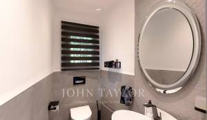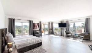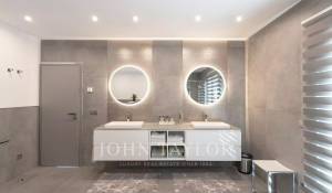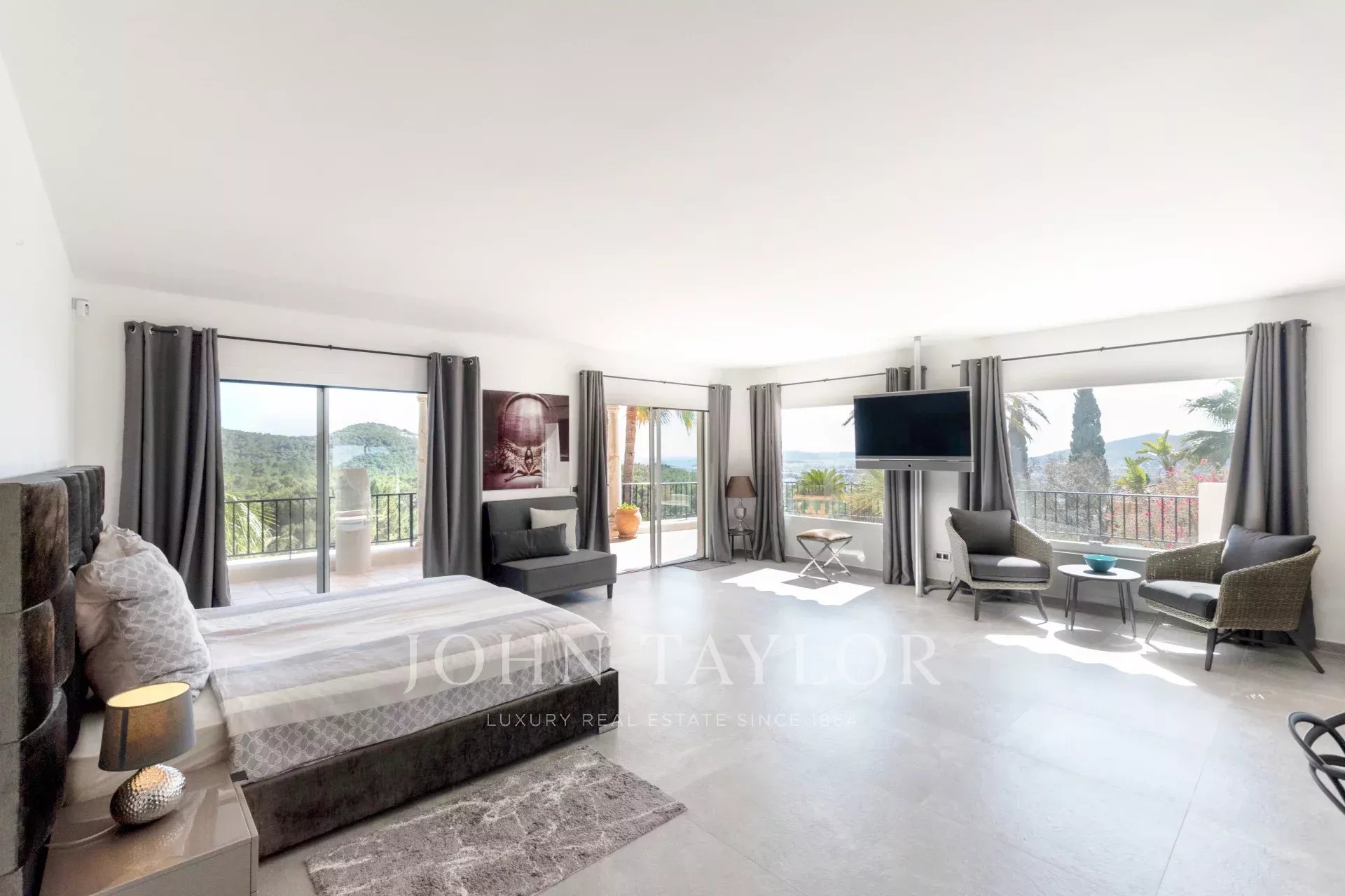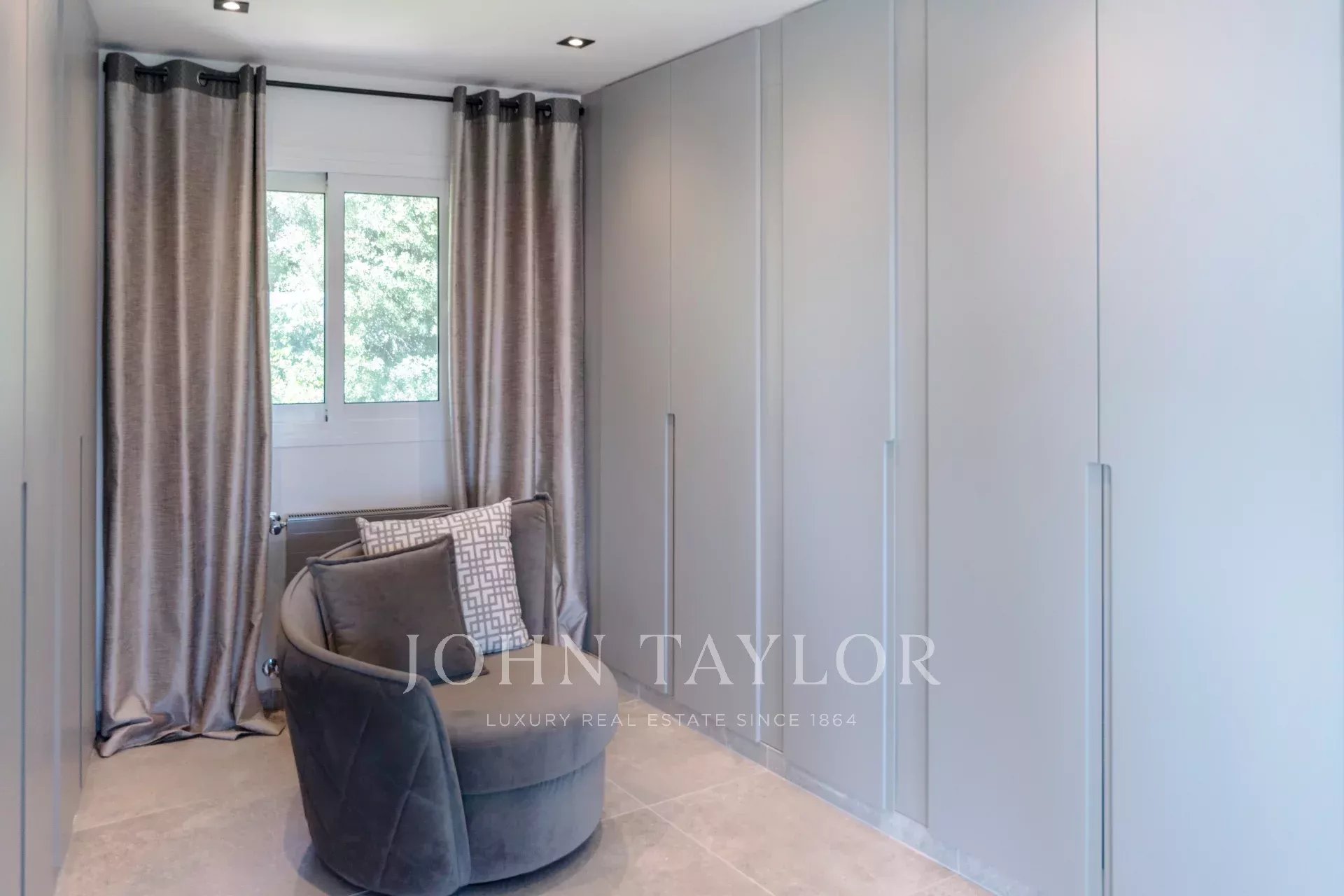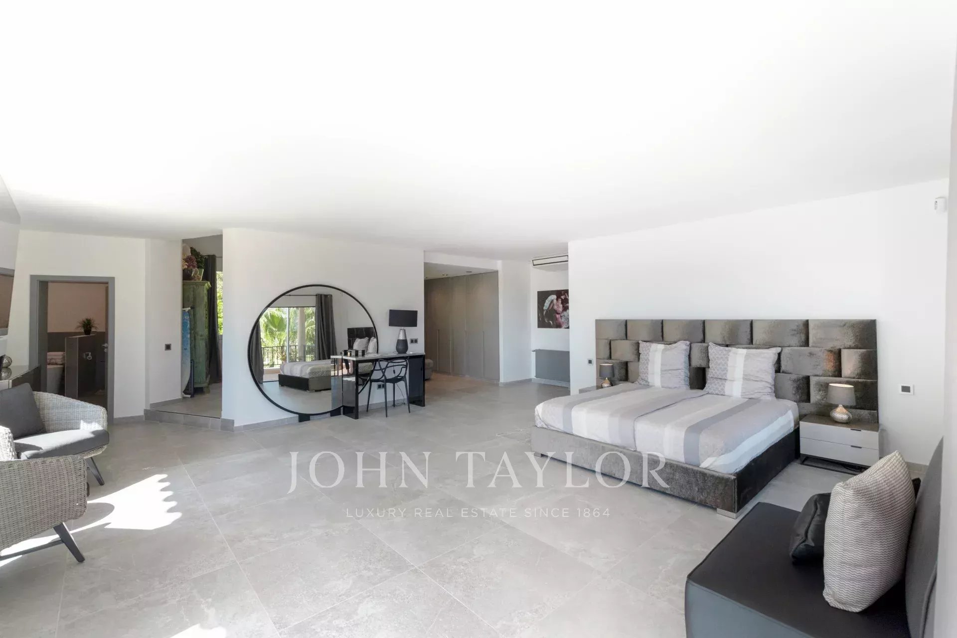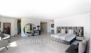 Im Hauptgeschoss bietet ein Schlafzimmer mit Doppelbett direkten Zugang zum Pool, während sich im Obergeschoss eine traumhafte Master-Suite mit einer Terrasse befindet, die einen Panoramablick über die gesamte Urbanisation Can Furnet bietet, die rund um die Uhr bewacht wird.