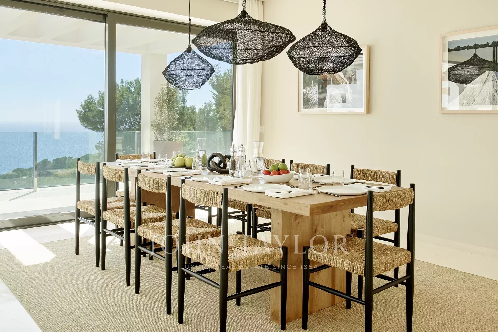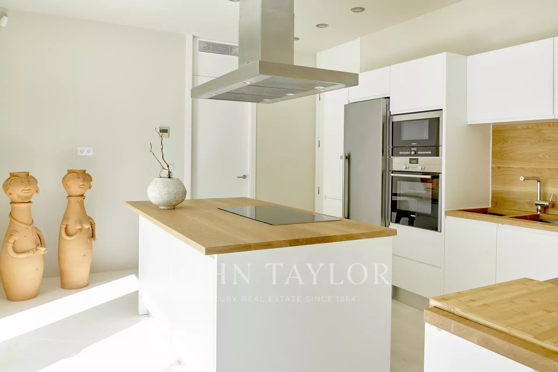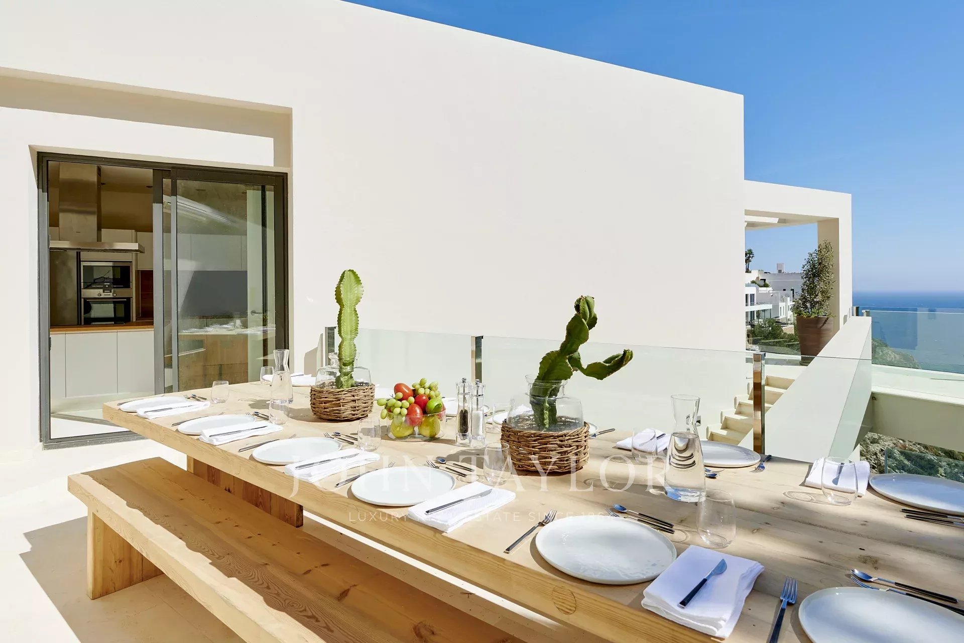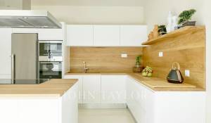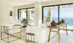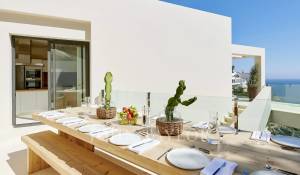 Beim Betreten der Immobilie werden Sie von einem hellen und geräumigen offenen Wohnbereich empfangen, der mit einer spektakulären Glaswand ausgestattet ist, die den Innenraum mit einer großzügigen, teilweise überdachten Terrasse verbindet – ideal zum Entspannen und Genießen des Meerblicks. Die Küche, ausgestattet mit hochwertigen Siemens-Geräten und einem modernen Induktionskochfeld, grenzt an das Esszimmer und schafft eine perfekte Umgebung für Familienleben und Unterhaltung.