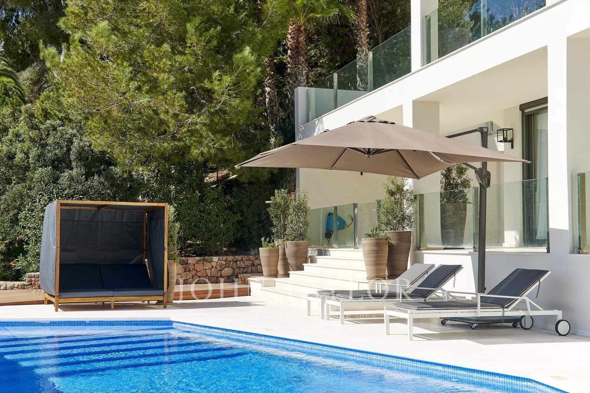 Der Poolbereich umfasst zwei Doppelzimmer mit eigenem Bad und einen kleinen Gemeinschaftsraum, was der Villa zusätzlichen Komfort und Vielseitigkeit verleiht.