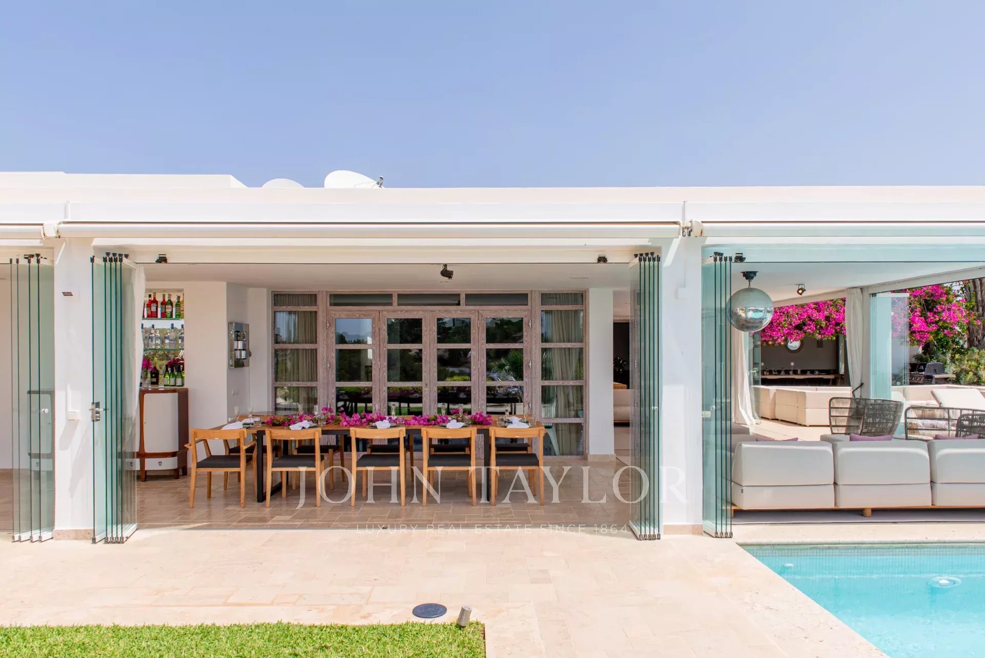 Das Innere verfügt über ein großes Panoramawohnzimmer, elegante Aufenthaltsräume, zwei stilvolle Esszimmer, ein TV-Zimmer, einen privaten Weinkeller und einen Flügel. Es gibt zwei voll ausgestattete Küchen, eine für den Hausgebrauch und eine professionelle. Die Hauptvilla beherbergt sechs en-suite Schlafzimmer mit begehbaren Kleiderschränken und privaten Bädern. Das Hauptschlafzimmer bietet direkten Zugang zum Pool, ein Dampfbad und einen Ankleidebereich. Zudem gibt es ein Kinozimmer mit separater Küche und einen Servicebereich mit zwei Schlafzimmern für das Personal