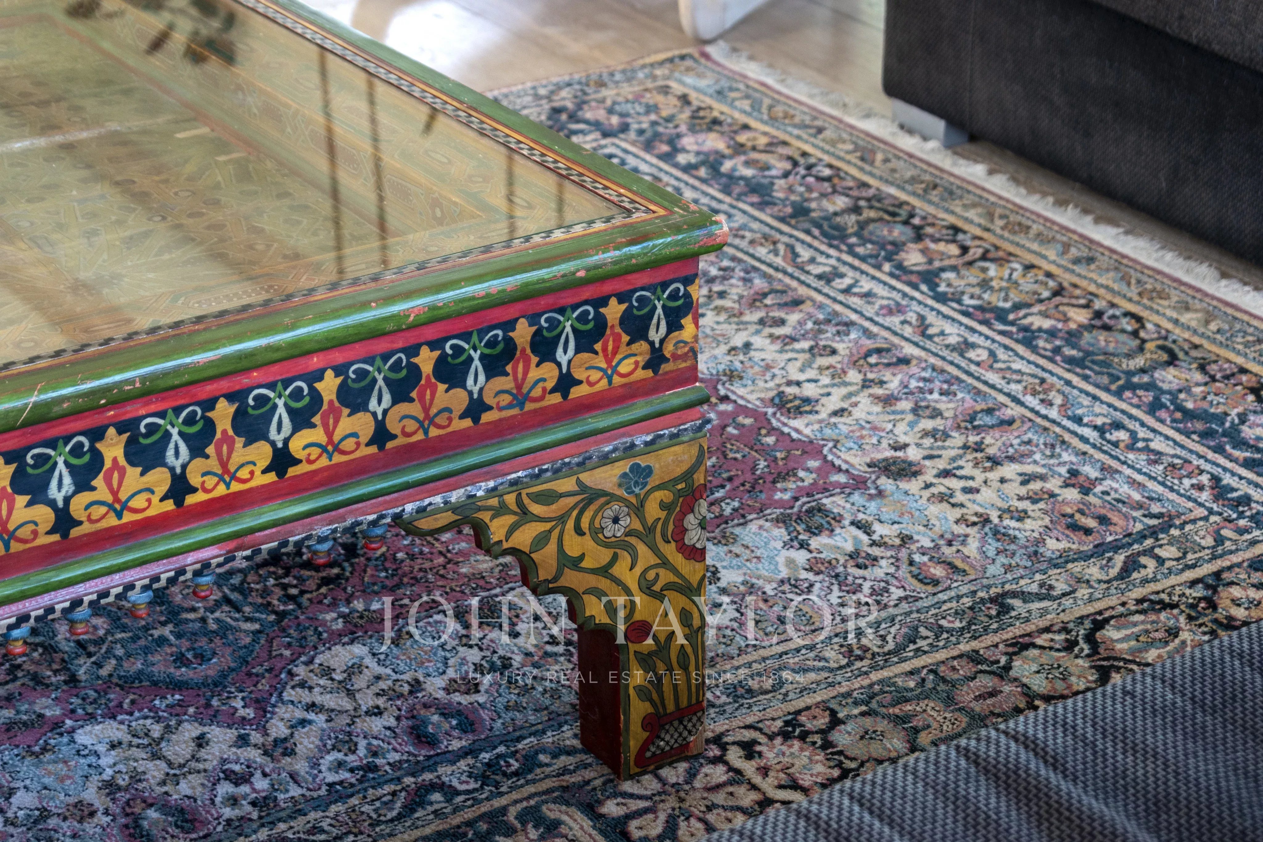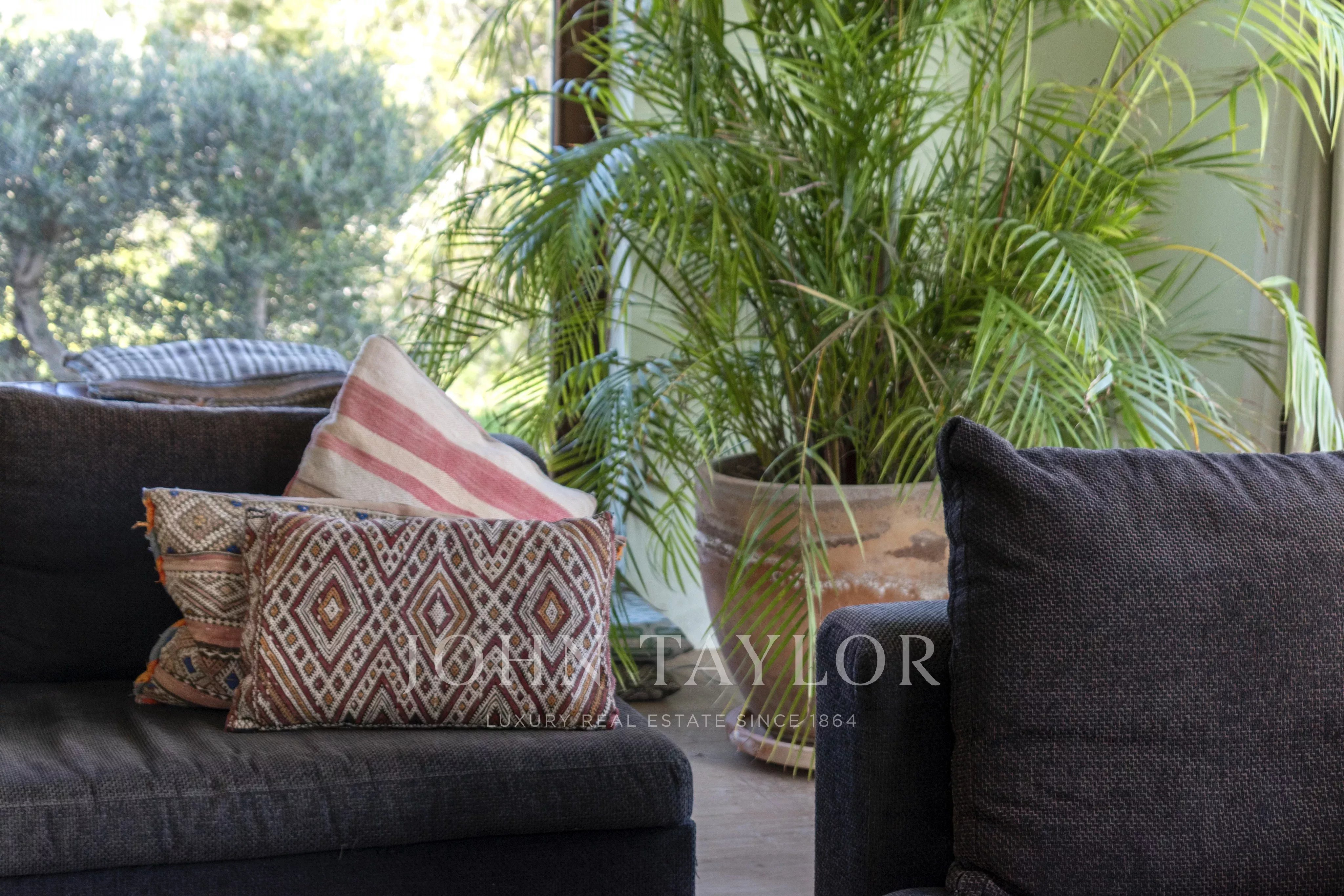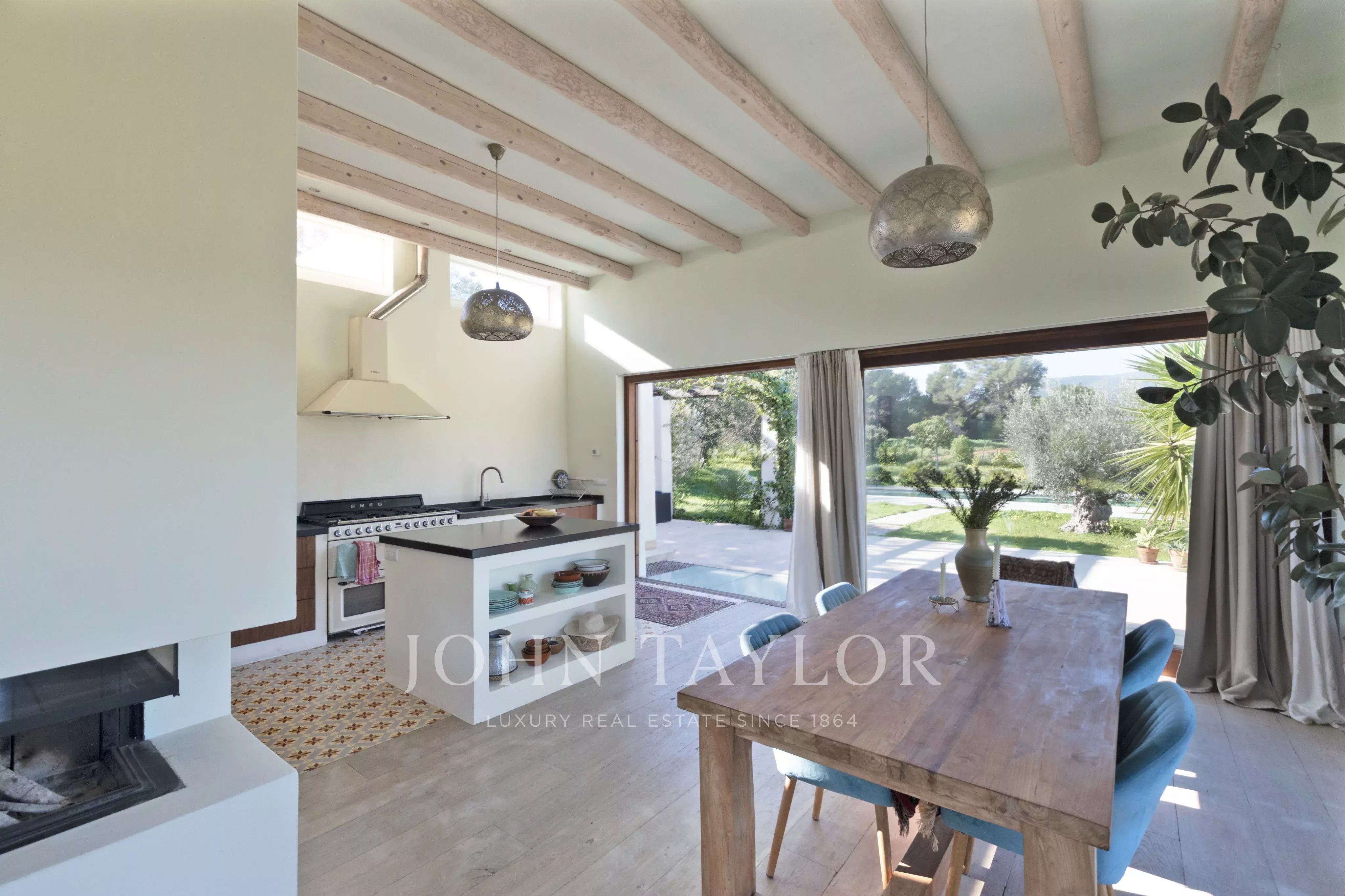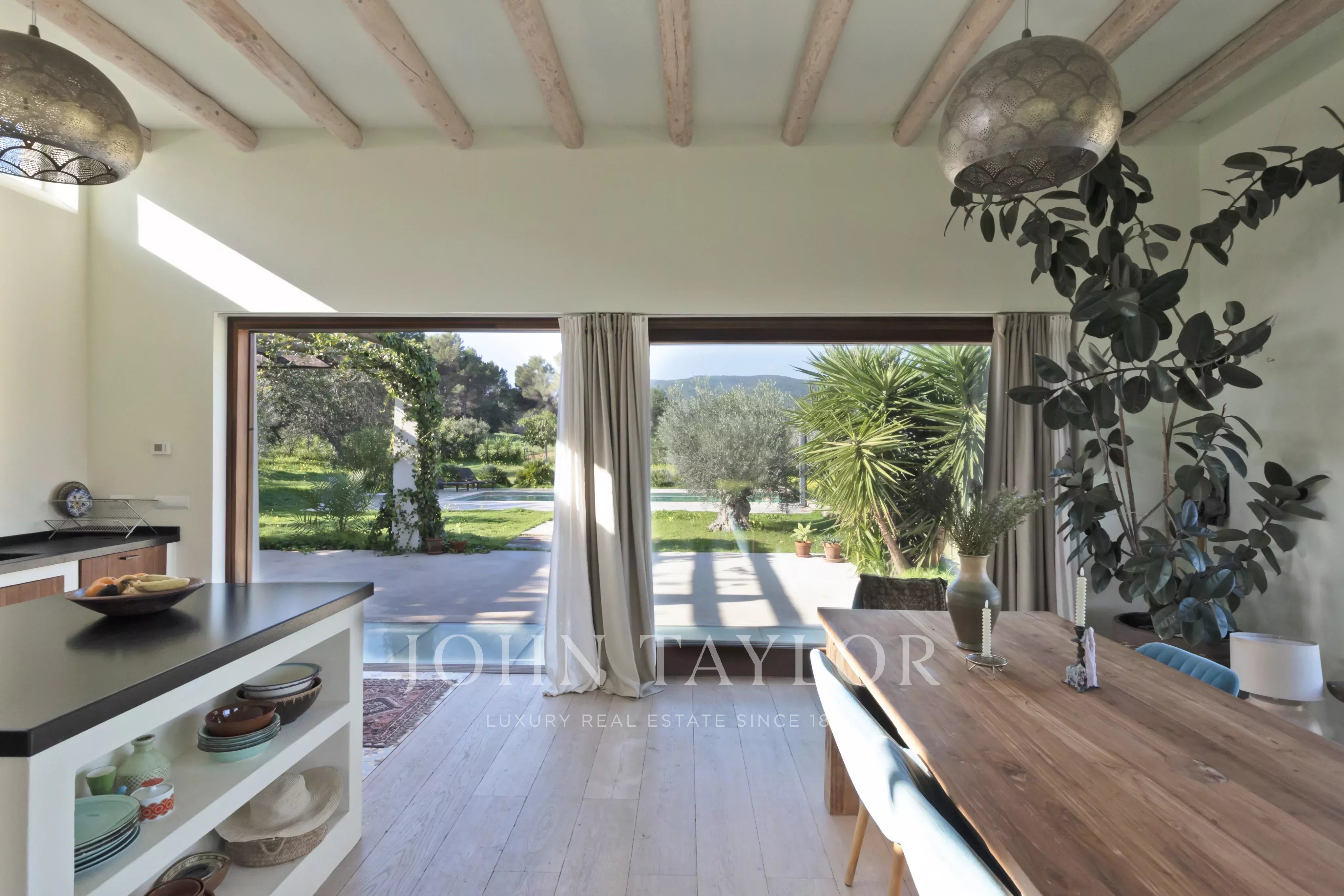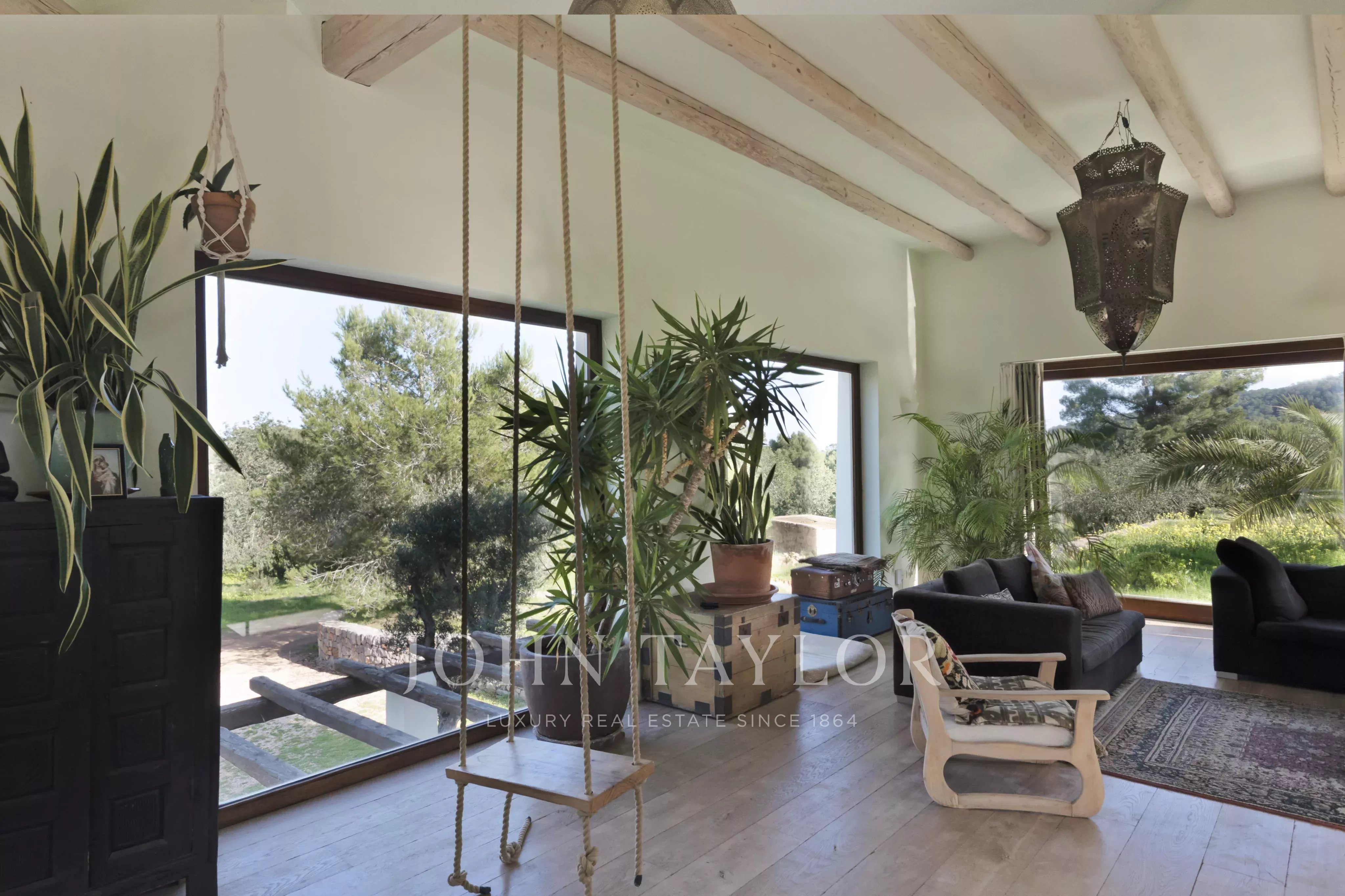 Das Haupthaus erstreckt sich über eine Ebene mit 3,75 Meter hohen Decken und umfasst eine großzügige Eingangshalle, 4 Schlafzimmer, 3 Badezimmer und ein Gäste-WC. Das Wohn-Esszimmer mit Balkendecken und 6 Meter hohen Fenstern bietet einen Panoramablick auf das weitläufige Grundstück und die Berge Ibizas. Die offene Küche ist mit dem Essbereich verbunden und führt auf die Terrasse, den Garten und den privaten Pool – ein perfekter Bereich für den Alltag und für Gäste.
