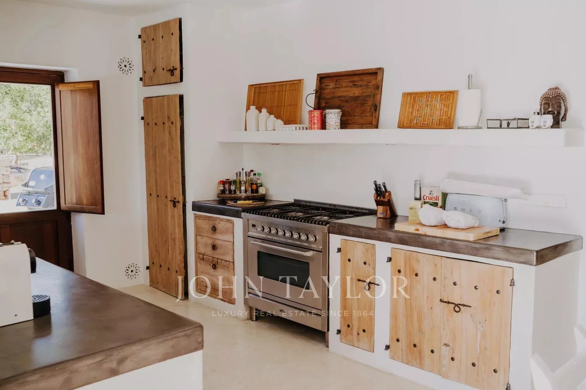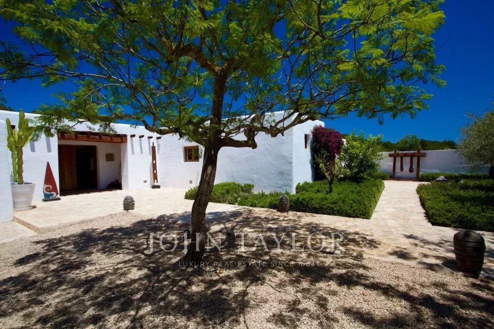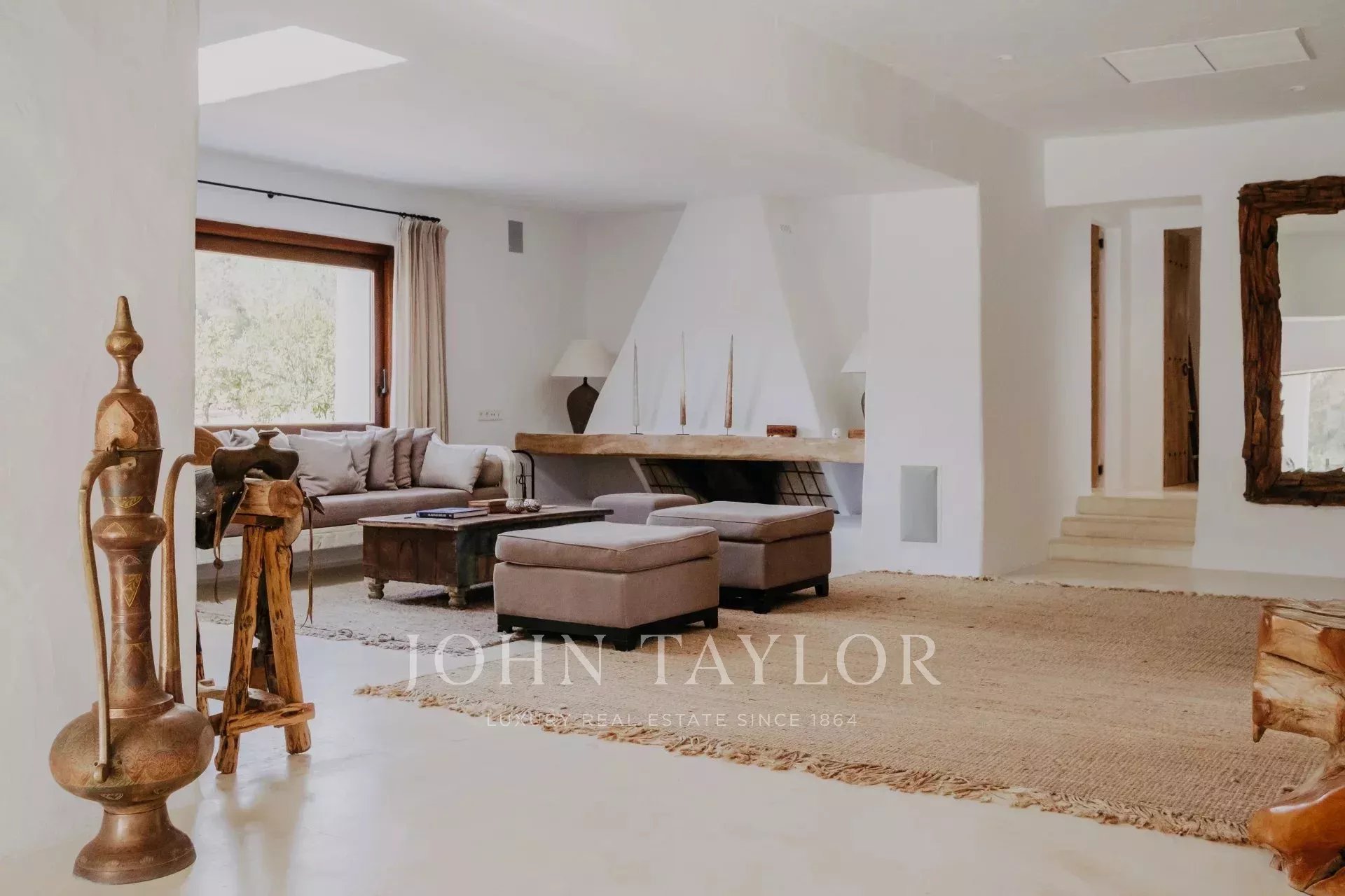 Die Finca befindet sich auf einem großzügigen Grundstück von etwa 3.200 m² und verfügt über rund 410 m² bebaute Fläche. Mediterrane Gärten mit Oliven- und Zitrusbäumen umgeben das Anwesen und schaffen eine friedliche und private Atmosphäre. Zur Ausstattung gehören ein beheizter Salzwasserpool sowie mehrere Außenbereiche, die das ganze Jahr über zum Genießen des ibizenkischen Klimas einladen. Eine großzügige überdachte Terrasse verbindet sich harmonisch mit der offenen Küche und dem Wohnzimmer mit Kamin und schafft eine warme und einladende Atmosphäre – ideal zum Entspannen oder für gesellige Abende.