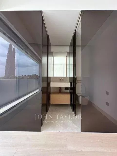 Das Untergeschoss dieser Villa bietet Nutzungen, die über das Wohnen hinausgehen: Garage, Installationen, Hallenbad, Mehrzweckraum, Büro, Terrassen und Außenschwimmbad. Dank des Grundrisses, der die Unebenheiten des Geländes ausnutzt, profitieren die Räume von natürlichem Licht und einer Szenografie der Landschaft.