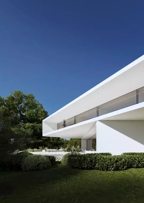 Diese Villa präsentiert sich als eine Überlagerung von zwei stark gerundeten Volumen, die durch das Spiel der Rotation zwischen ihnen überdachte Terrassen erzeugen und das obere Stockwerk in Richtung der Fernsicht auf die Landschaft ausrichten. Die Teile haben zwei massive Seiten, die die strukturelle Funktion übernehmen, und ermöglichen so, dass die Fronten durch große Fenster mit Blick auf den Garten mit einer ausgeprägten Horizontalität völlig offen sind. Im Gegensatz zum Äußeren besteht das Innere aus miteinander verbundenen Räumen, die ein bestimmtes Programm verfolgen, wobei jeder Raum eine einzigartige Gartenlandschaft zeigt. Auf diese Weise erlebt man in diesem Haus eine Atmosphäre, die in eine Poetik der Schatten getaucht ist, die das Innere verwandeln.