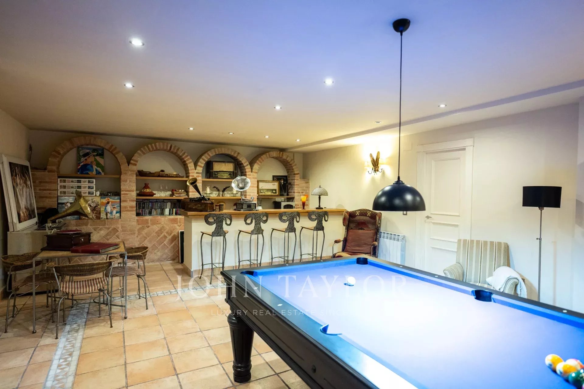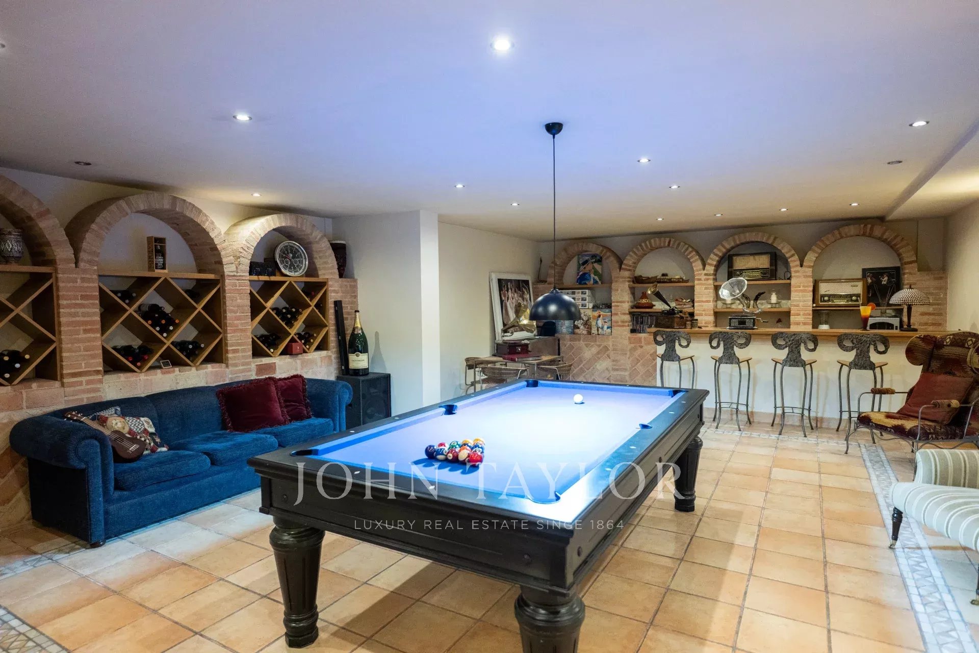Im Halbkeller befinden sich ein Schlafzimmer und ein Badezimmer für das Personal, ein großes Wohnzimmer, ein Weinkeller und ein Lagerraum.