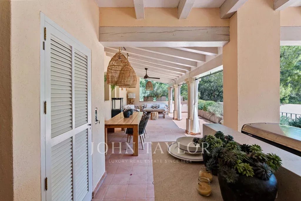 Vom eleganten Wohnzimmer aus gelangt man auf eine überdachte Terrasse mit Blick auf das Meer, während der Außenbereich eine private Oase mit einem herrlichen beheizten Salzwasser-Swimmingpool, einem Grillplatz und einer Außenküche bietet, die zum Entspannen und Erholen im Herzen der mallorquinischen Landschaft einlädt. Das Anwesen mit mehr als 2200 m² Land und der Besonderheit, dass es über drei zusätzliche Grundstücke verfügt, die nicht bebaut werden dürfen, vereint Großzügigkeit und Privatsphäre in einer hochwertigen Umgebung.