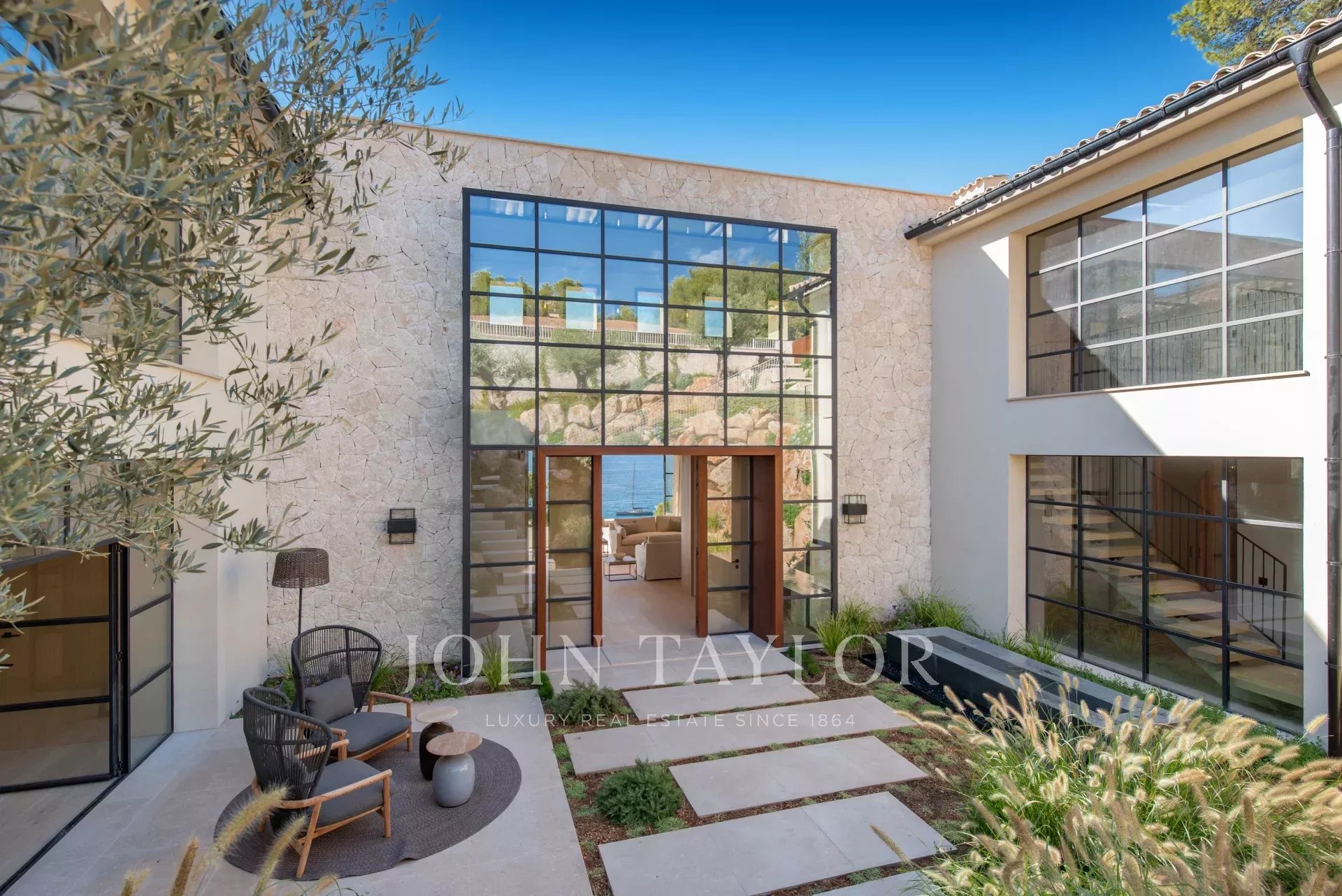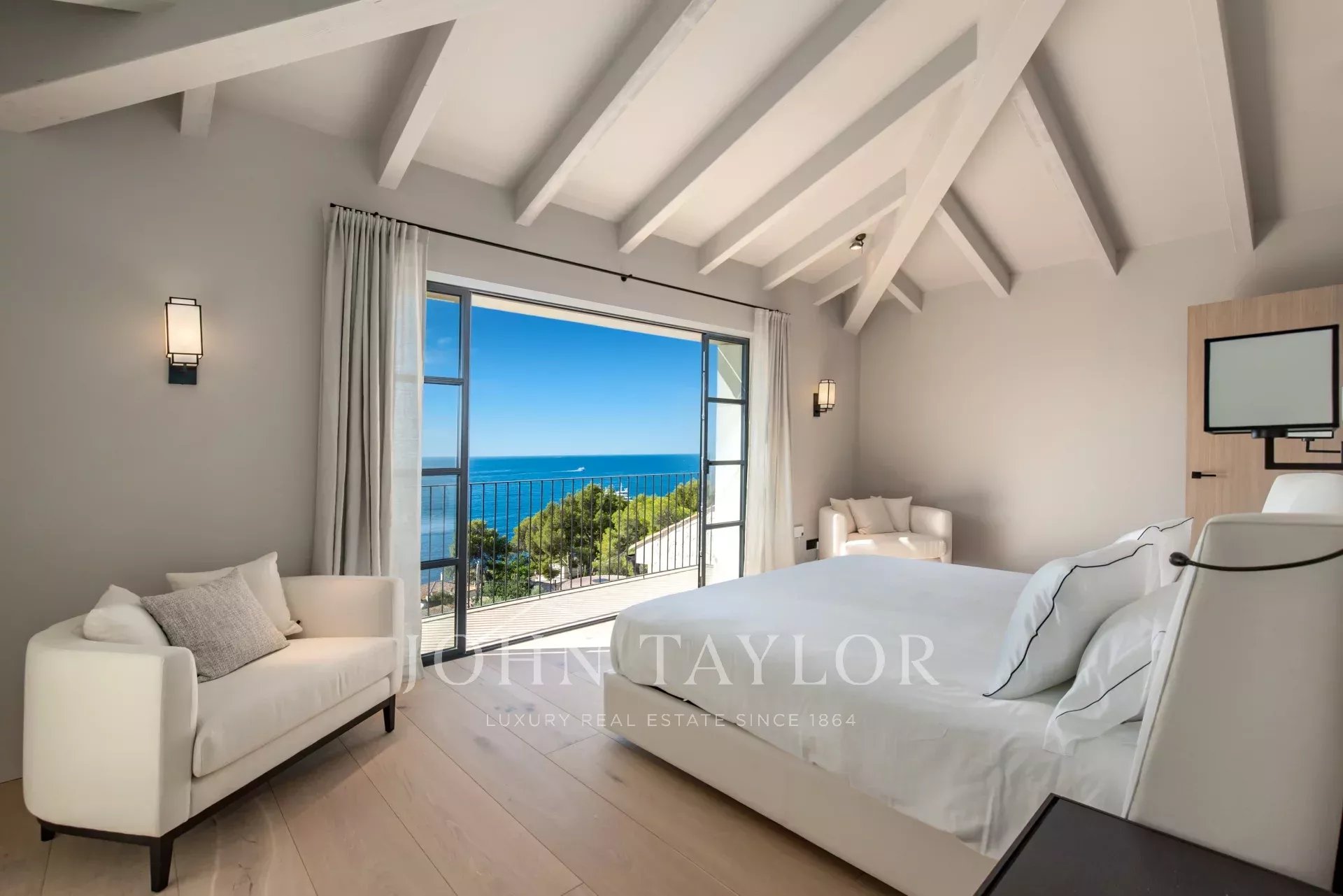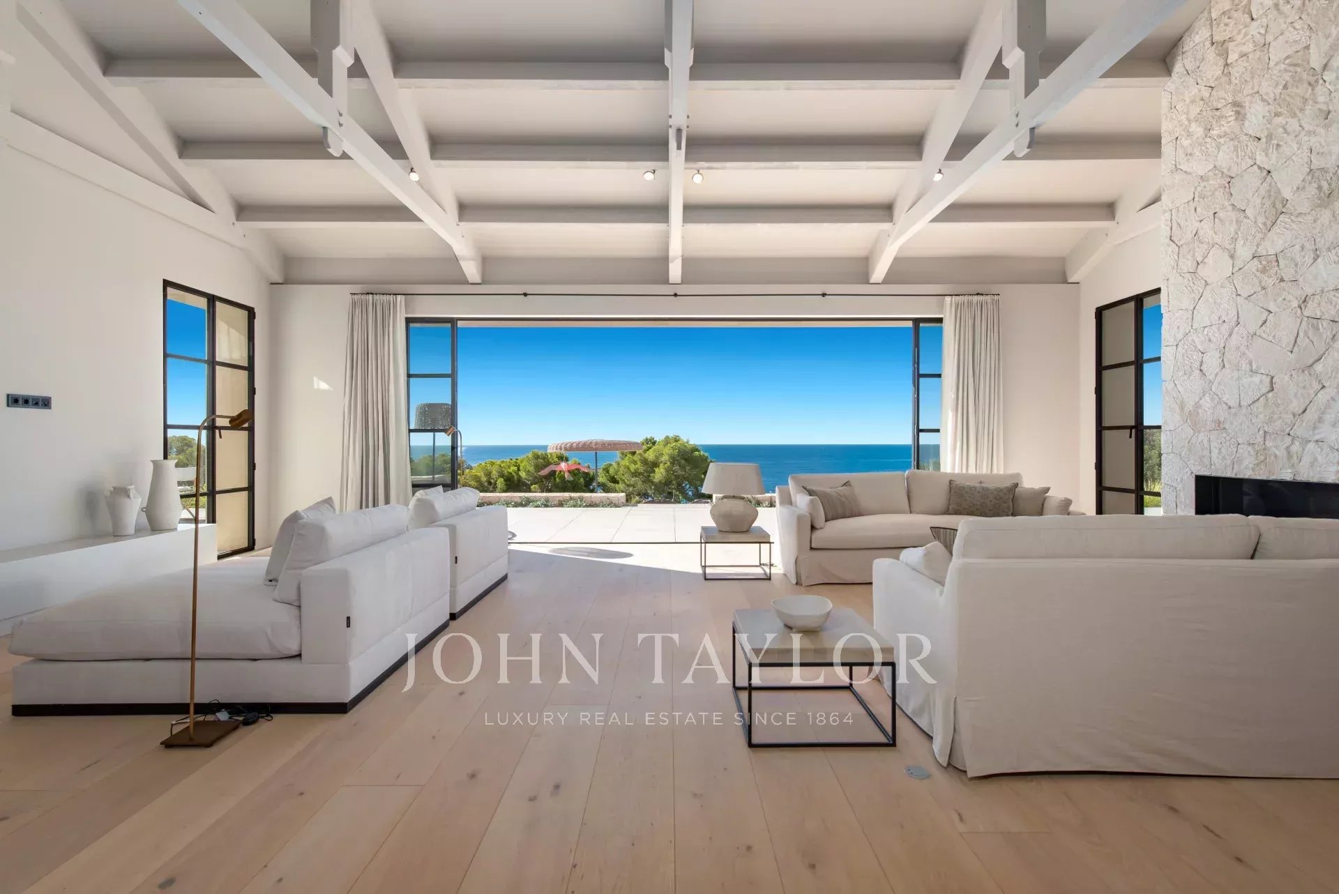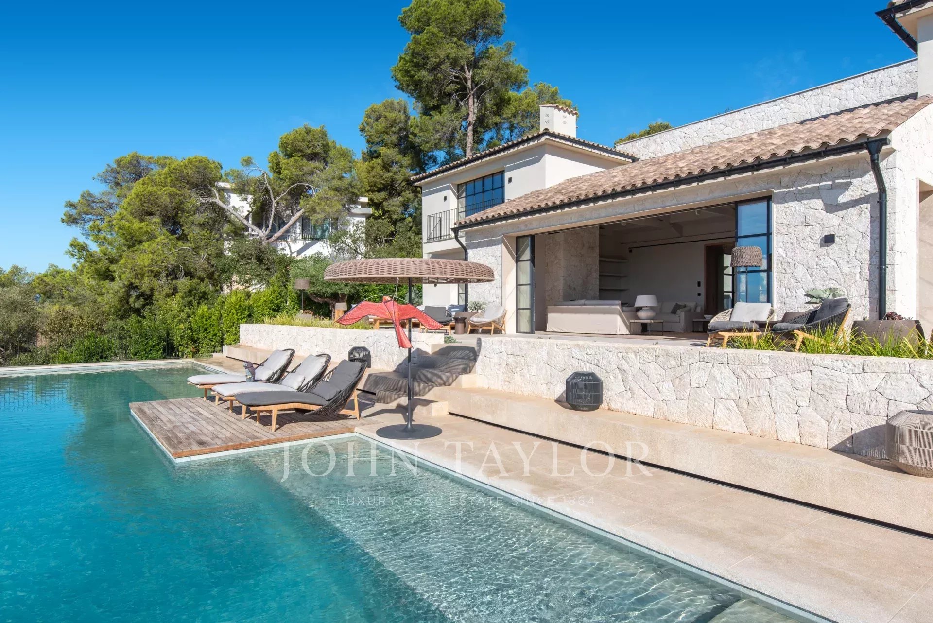 Wenn Sie auf der Suche nach einer exklusiven Immobilie in einer ruhigen und gefragten Gegend sind, dann sind Sie hier genau richtig. Es handelt sich um eine elegante Villa mit Meerblick in Bendinat, die kürzlich fertiggestellt wurde und sofort bezugsfertig ist. "Die perfekte Wahl für diejenigen, die das Beste vom Besten wollen. Auf einem großzügigen Grundstück von 2.362 m² in unmittelbarer Nähe zum Meer gelegen, bietet diese Immobilie einen atemberaubenden Blick auf die Küste von Bendinat, das Mittelmeer und die Inseln Cabrera und Illetas. Die prächtige Villa, die bereits fertiggestellt ist, zeichnet sich durch ihre Geräumigkeit mit 787,60 m² bebauter Fläche aus, die sich auf sechs Schlafzimmer, sechs Bäder, ein Gäste-WC, Wohnzimmer, Küche, Waschküche und Abstellraum verteilen. Die Villa wurde mit hochwertigen Materialien gebaut und verbindet den mediterranen Stil mit einem modernen und eleganten Touch. Das Ergebnis ist eine außergewöhnliche Immobilie, die vom ersten Moment an beeindruckt. Zu den besonderen Merkmalen gehören die Eichenholzböden, die natürlichen Balken und die großen Fenster, durch die man von fast jedem Zimmer aus die Aussicht genießen kann.