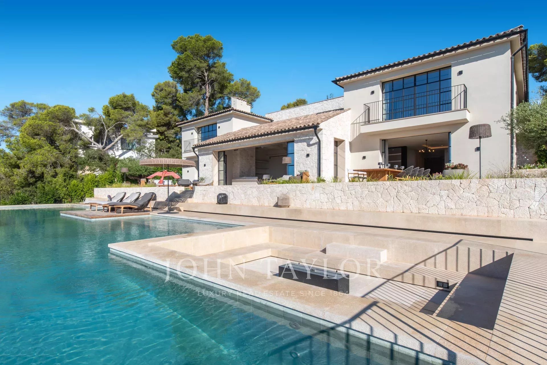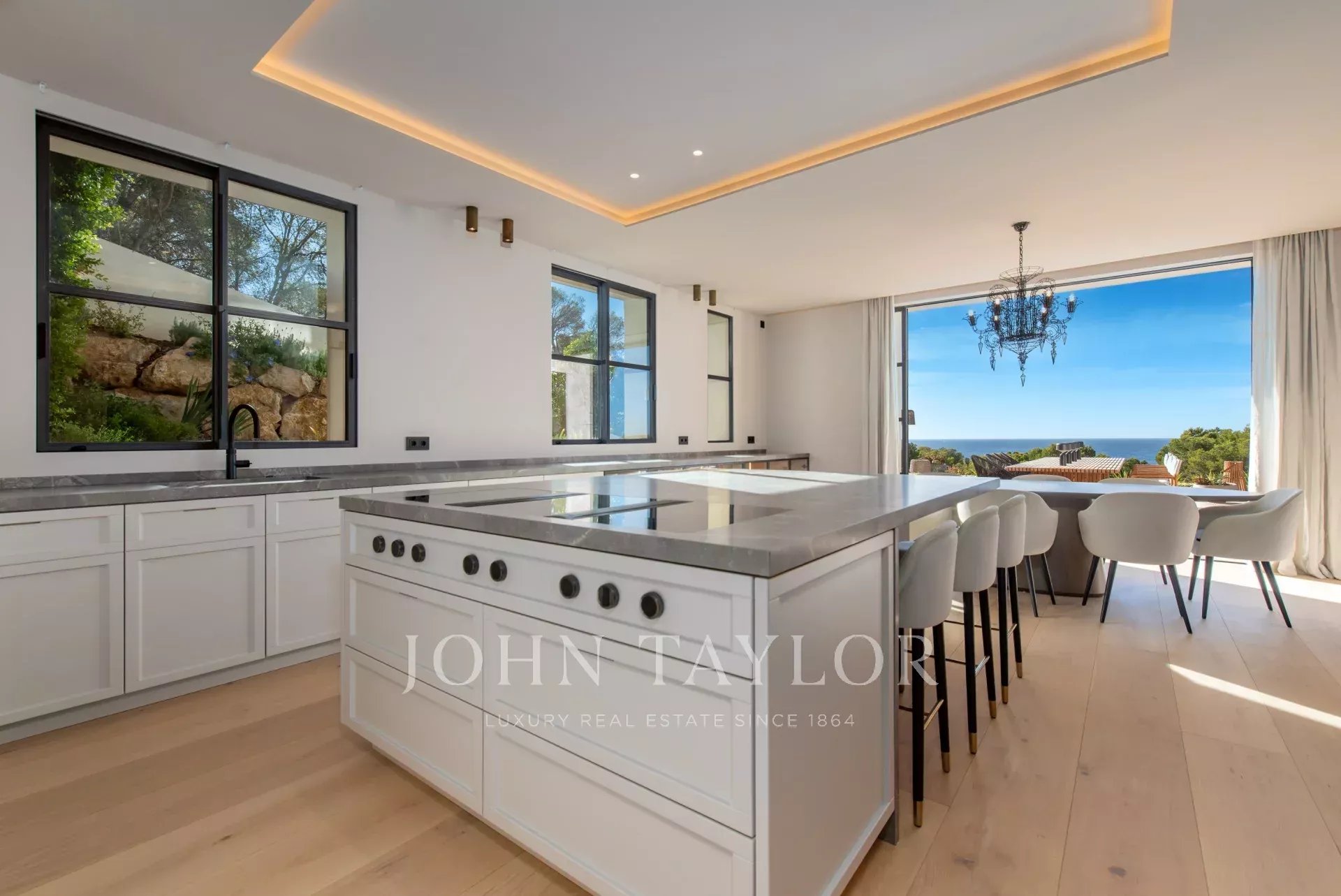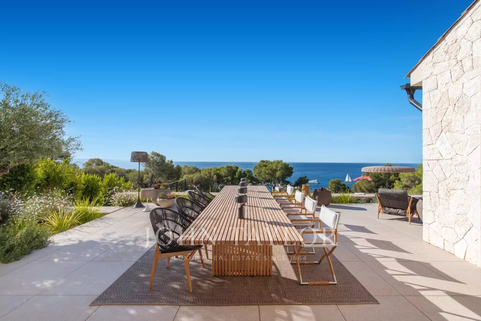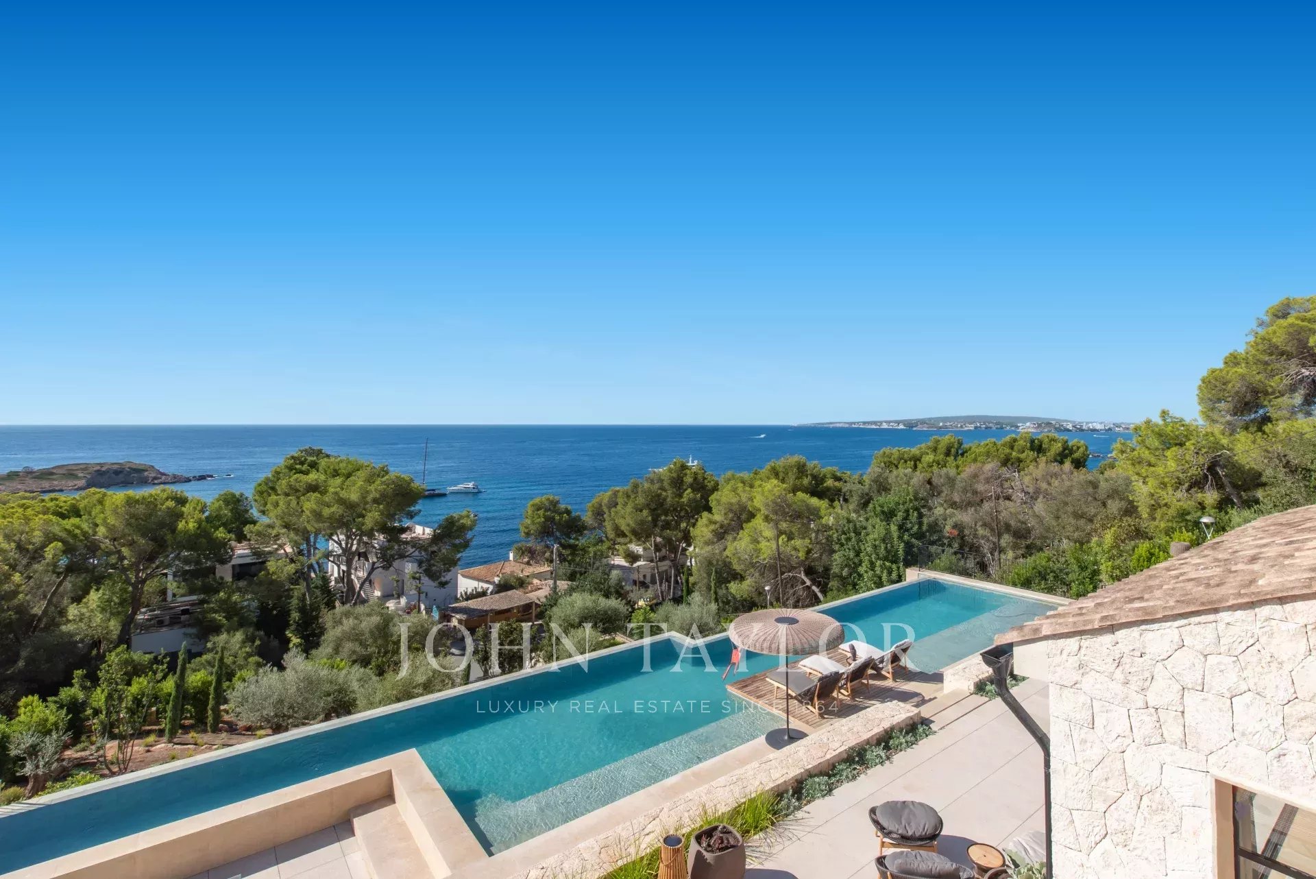 Wenn Sie auf der Suche nach einer exklusiven Immobilie in einer ruhigen und gefragten Gegend sind, dann sind Sie hier genau richtig. Es handelt sich um eine elegante Villa mit Meerblick in Bendinat, die kürzlich fertiggestellt wurde und sofort bezugsfertig ist. "Die perfekte Wahl für diejenigen, die das Beste vom Besten wollen. Auf einem großzügigen Grundstück von 2.362 m² in unmittelbarer Nähe zum Meer gelegen, bietet diese Immobilie einen atemberaubenden Blick auf die Küste von Bendinat, das Mittelmeer und die Inseln Cabrera und Illetas. Die prächtige Villa, die bereits fertiggestellt ist, zeichnet sich durch ihre Geräumigkeit mit 787,60 m² bebauter Fläche aus, die sich auf sechs Schlafzimmer, sechs Bäder, ein Gäste-WC, Wohnzimmer, Küche, Waschküche und Abstellraum verteilen. Die Villa wurde mit hochwertigen Materialien gebaut und verbindet den mediterranen Stil mit einem modernen und eleganten Touch. Das Ergebnis ist eine außergewöhnliche Immobilie, die vom ersten Moment an beeindruckt. Zu den besonderen Merkmalen gehören die Eichenholzböden, die natürlichen Balken und die großen Fenster, durch die man von fast jedem Zimmer aus die Aussicht genießen kann.