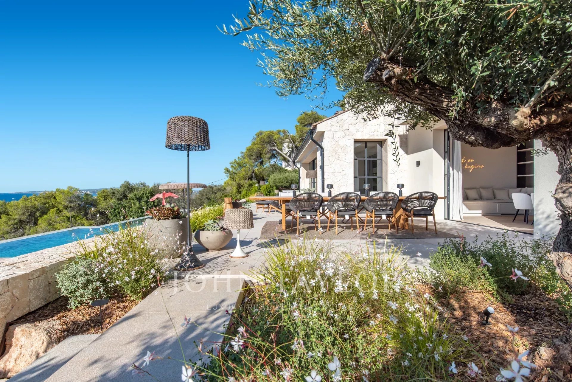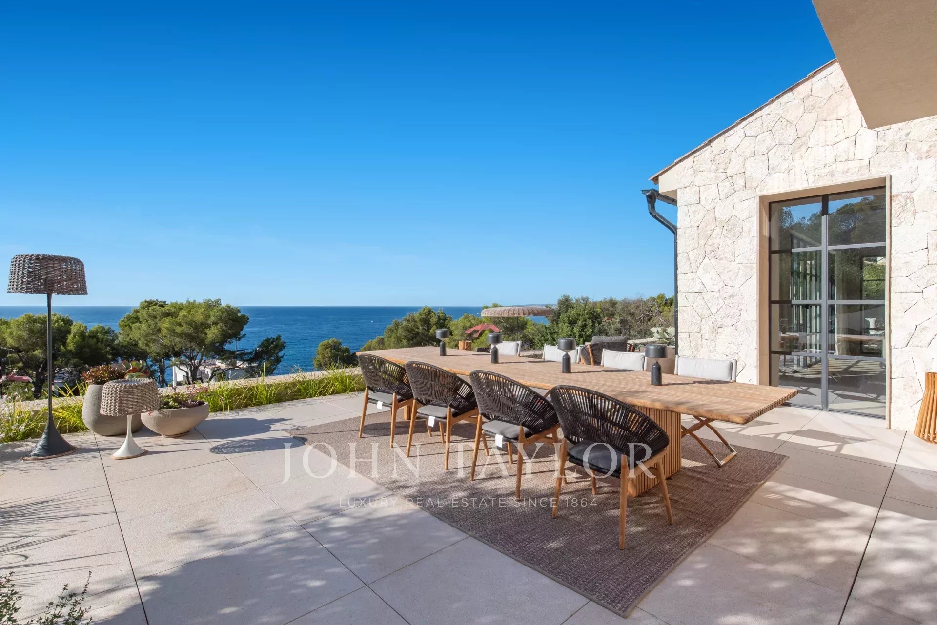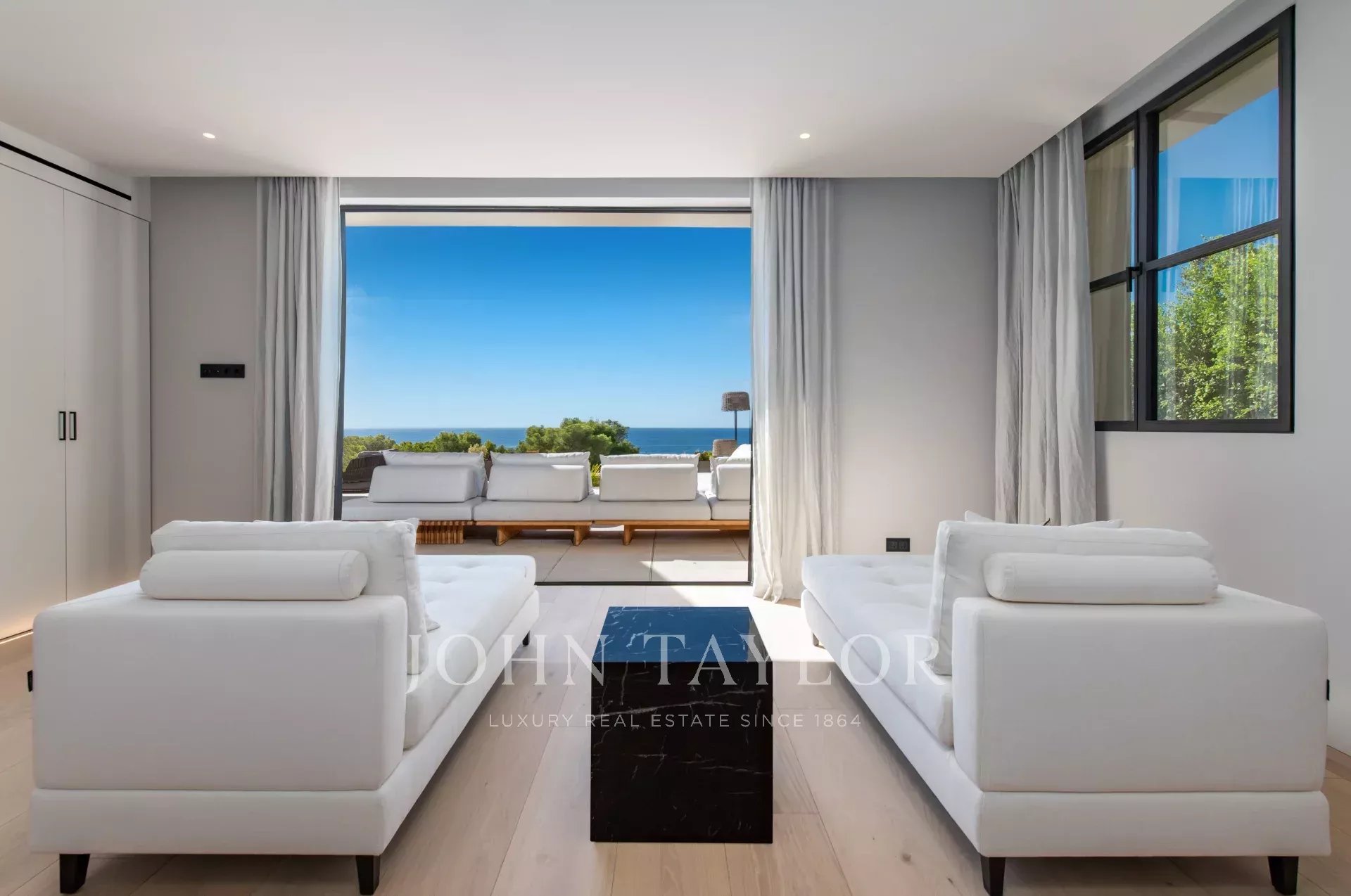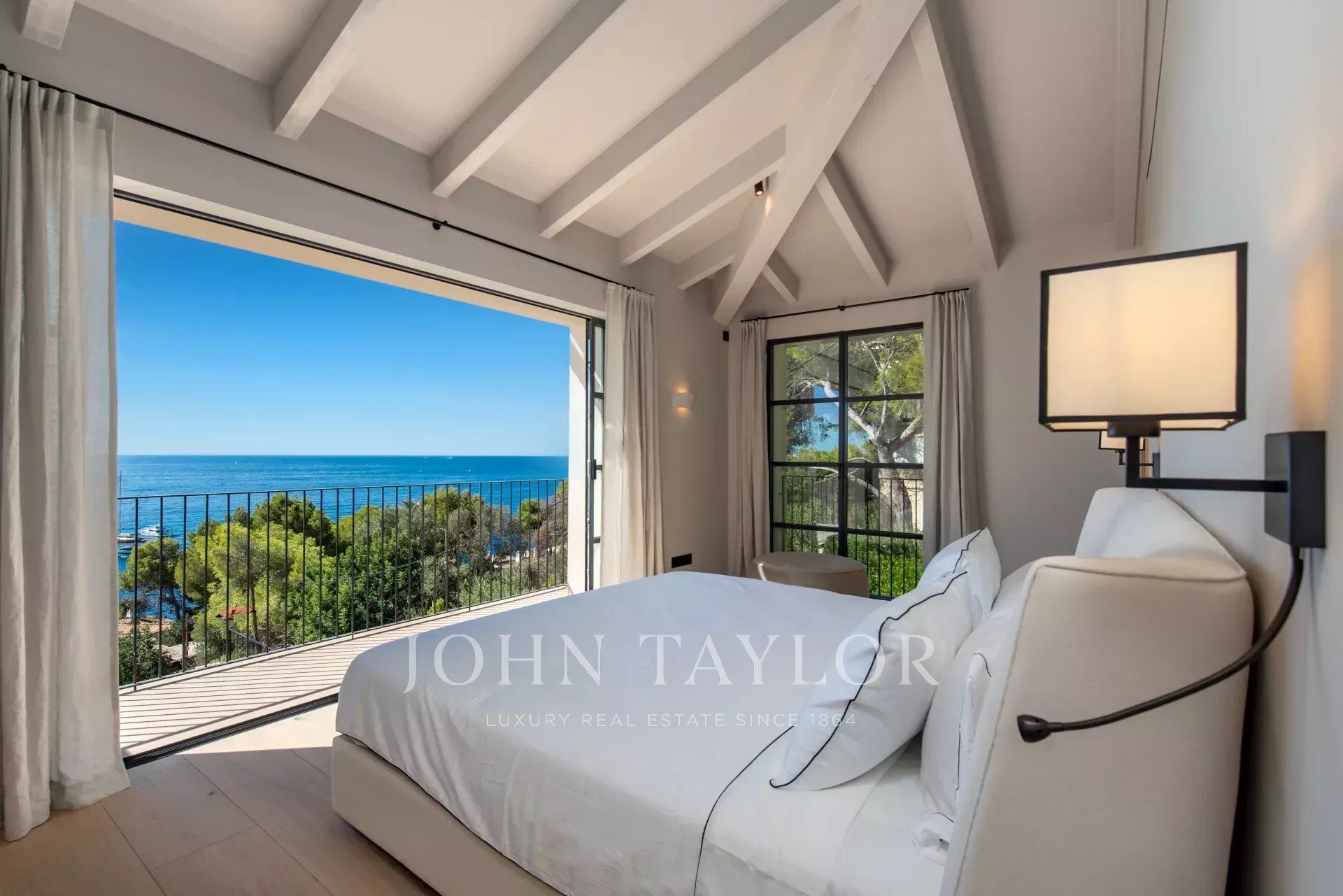 Wenn Sie auf der Suche nach einer exklusiven Immobilie in einer ruhigen und gefragten Gegend sind, dann sind Sie hier genau richtig. Es handelt sich um eine elegante Villa mit Meerblick in Bendinat, die kürzlich fertiggestellt wurde und sofort bezugsfertig ist. "Die perfekte Wahl für diejenigen, die das Beste vom Besten wollen. Auf einem großzügigen Grundstück von 2.362 m² in unmittelbarer Nähe zum Meer gelegen, bietet diese Immobilie einen atemberaubenden Blick auf die Küste von Bendinat, das Mittelmeer und die Inseln Cabrera und Illetas. Die prächtige Villa, die bereits fertiggestellt ist, zeichnet sich durch ihre Geräumigkeit mit 787,60 m² bebauter Fläche aus, die sich auf sechs Schlafzimmer, sechs Bäder, ein Gäste-WC, Wohnzimmer, Küche, Waschküche und Abstellraum verteilen. Die Villa wurde mit hochwertigen Materialien gebaut und verbindet den mediterranen Stil mit einem modernen und eleganten Touch. Das Ergebnis ist eine außergewöhnliche Immobilie, die vom ersten Moment an beeindruckt. Zu den besonderen Merkmalen gehören die Eichenholzböden, die natürlichen Balken und die großen Fenster, durch die man von fast jedem Zimmer aus die Aussicht genießen kann.
