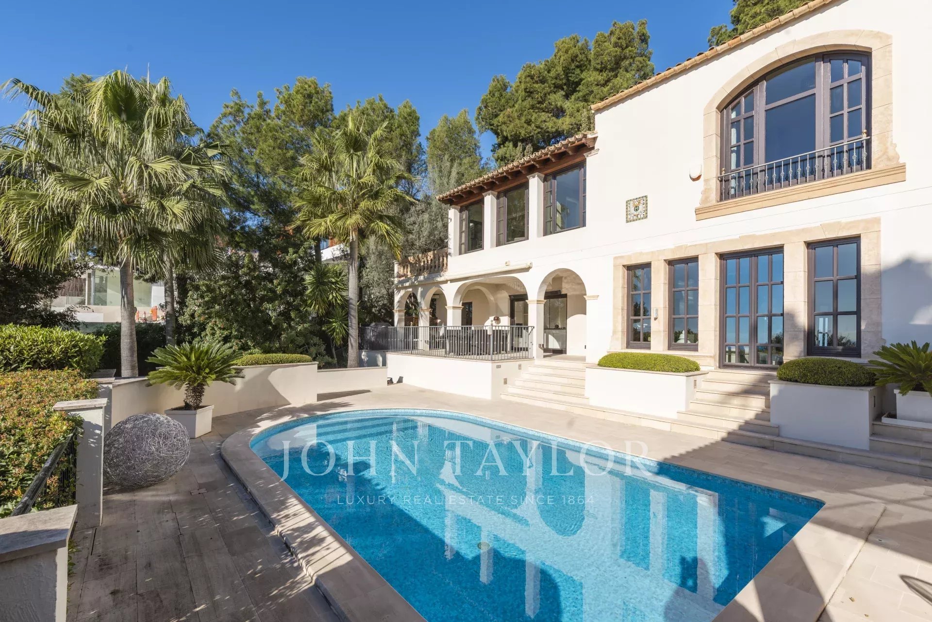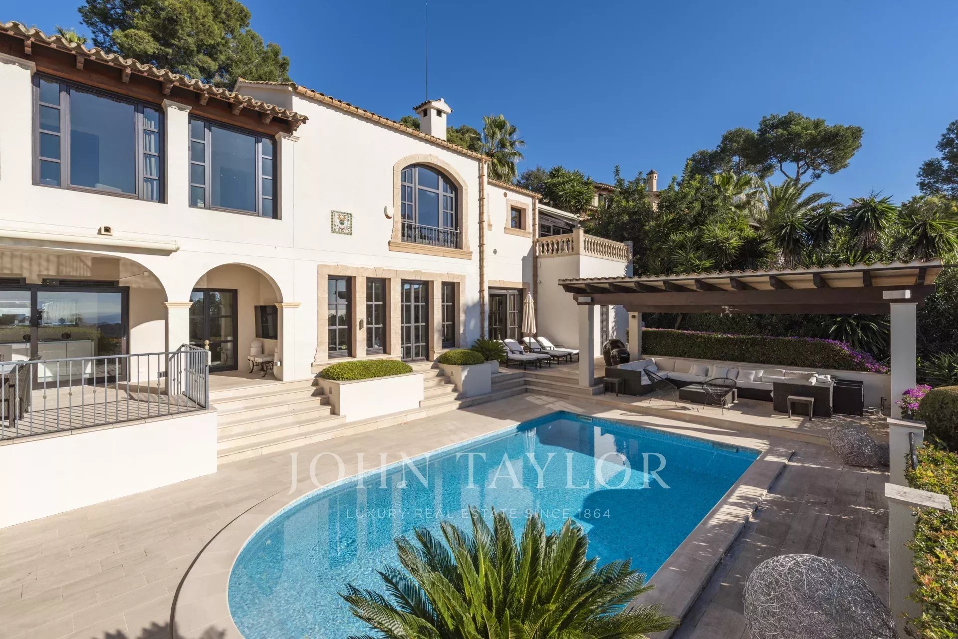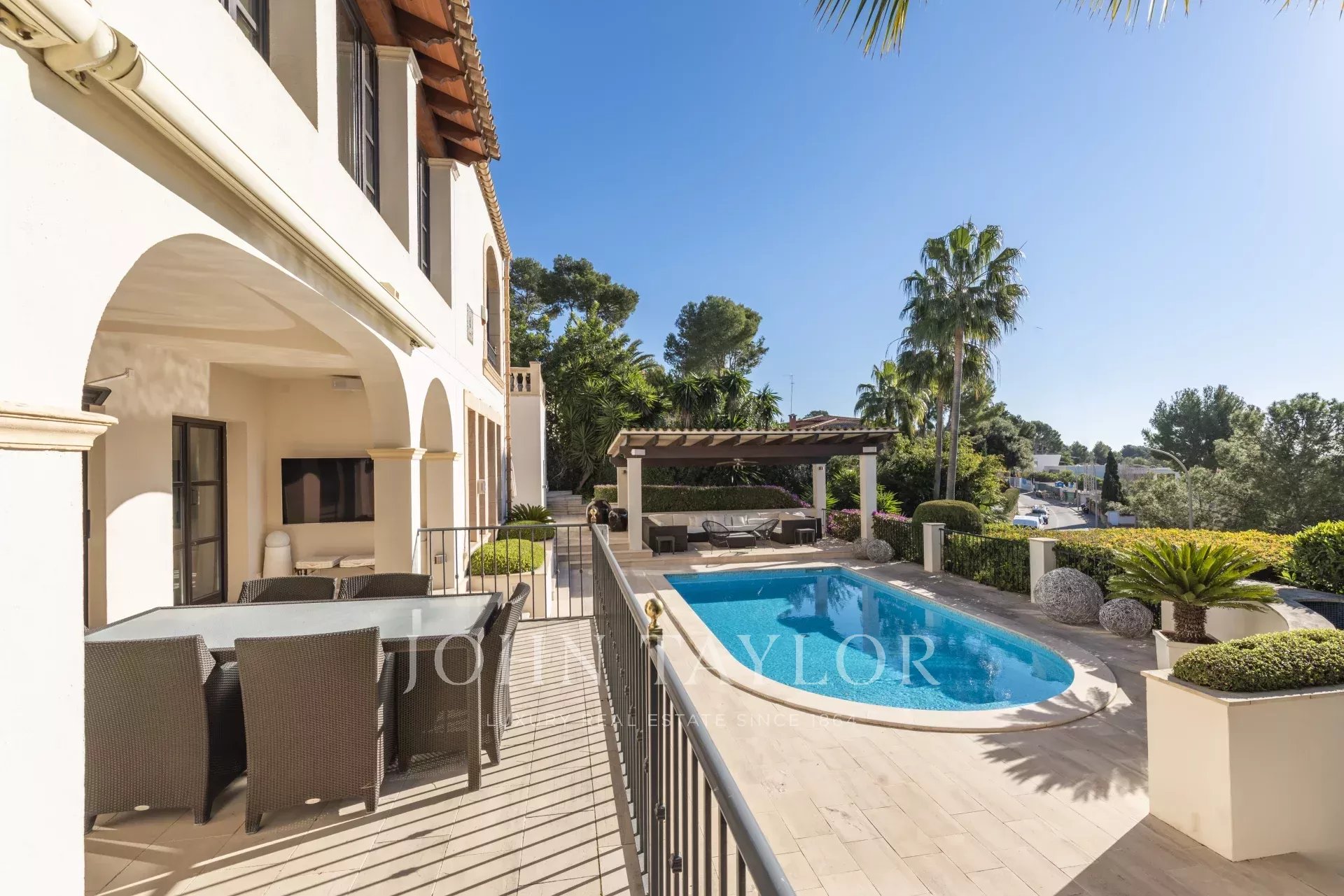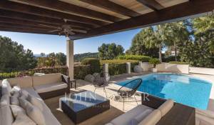 Wir bieten Ihnen diese beeindruckende mediterrane Villa, die sich ganz in der Nähe des Golfplatzes von Bendinat befindet. Sie verfügt über 350 m² Wohnfläche, die sich auf 2 Ebenen verteilen. Auf der oberen Etage befindet sich die Hauptküche mit Esszimmer, das Wohnzimmer mit Kamin, zwei Doppelschlafzimmer, zwei Badezimmer und ein Ankleidezimmer. Und im Erdgeschoss ein zweites geräumigeres Wohnzimmer, eine weitere voll ausgestattete Küche und zwei weitere Schlafzimmer mit zwei Bädern. Von hier aus haben alle Zimmer direkten Zugang zum wunderschönen Außenpoolbereich, wo Sie sich entspannen und in dem großzügigen Bereich mit Sonnenliegen und Sofas ein Sonnenbad gönnen können. Dieses Anwesen im mediterranen Stil ist ideal für diejenigen, die Privatsphäre, Ruhe, eine gute Aussicht auf das Meer und das Leben in einer sehr begehrten Gegend, in der Nähe der schönen Häfen und aller Annehmlichkeiten suchen. Verpassen Sie nicht die Gelegenheit, das Haus zu besichtigen. Kontaktieren Sie uns so schnell wie möglich.