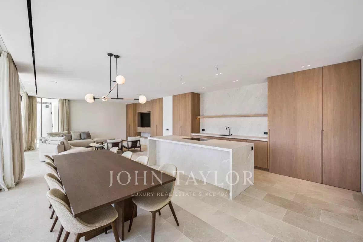 Jedes Detail wurde nach höchsten Standards gestaltet – mit maßgefertigter Eichenholz-Tischlerei im gesamten Haus: von diskreten Innentüren bis hin zu individuellen Küchenschränken – was dem Haus ein elegantes, durchgängiges Erscheinungsbild verleiht. Das offene Erdgeschoss verfügt über eine moderne Küche, einen Essbereich und einen Wohnraum – durchflutet von natürlichem Licht – mit direktem Zugang zum angelegten Garten und dem privaten Pool.
