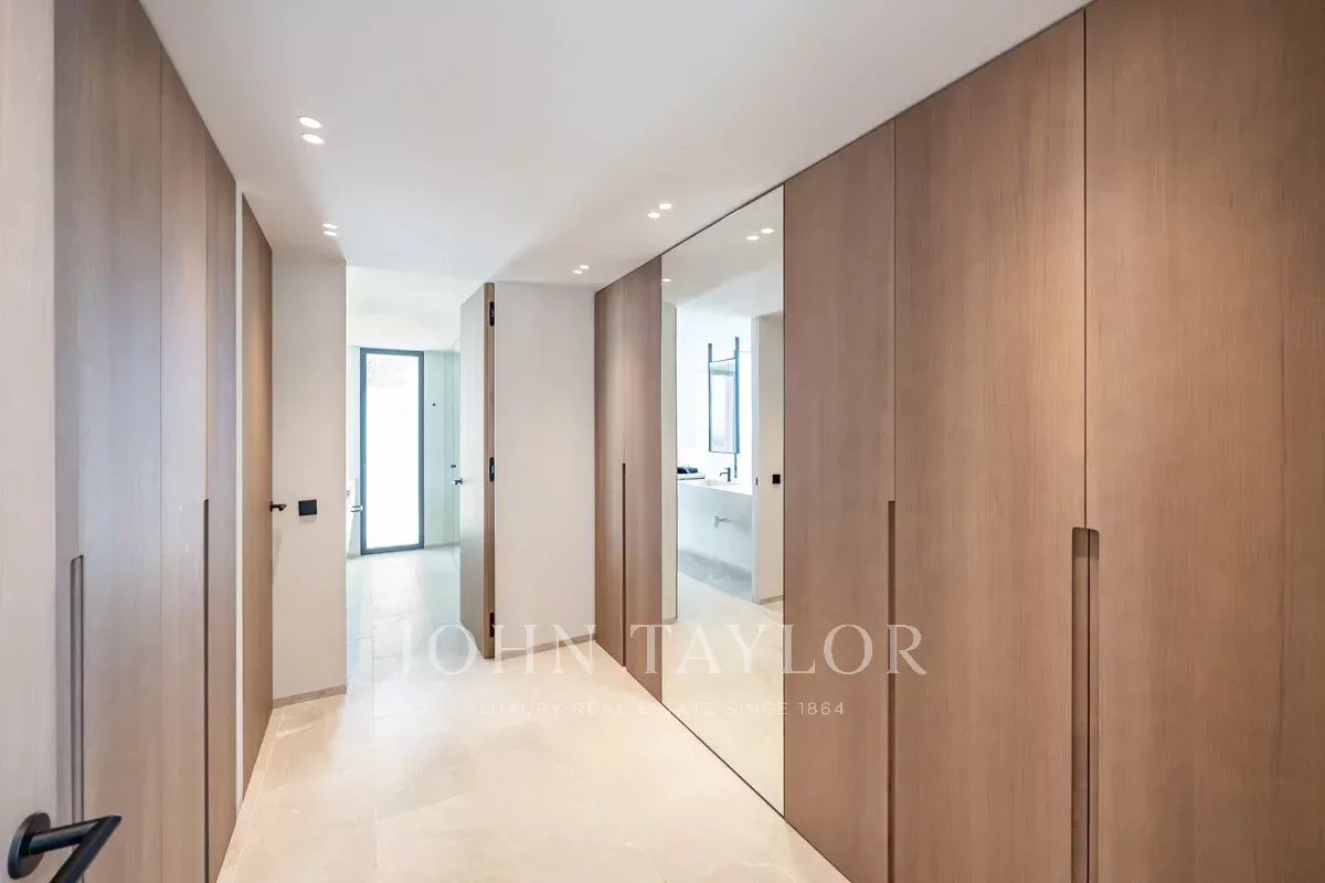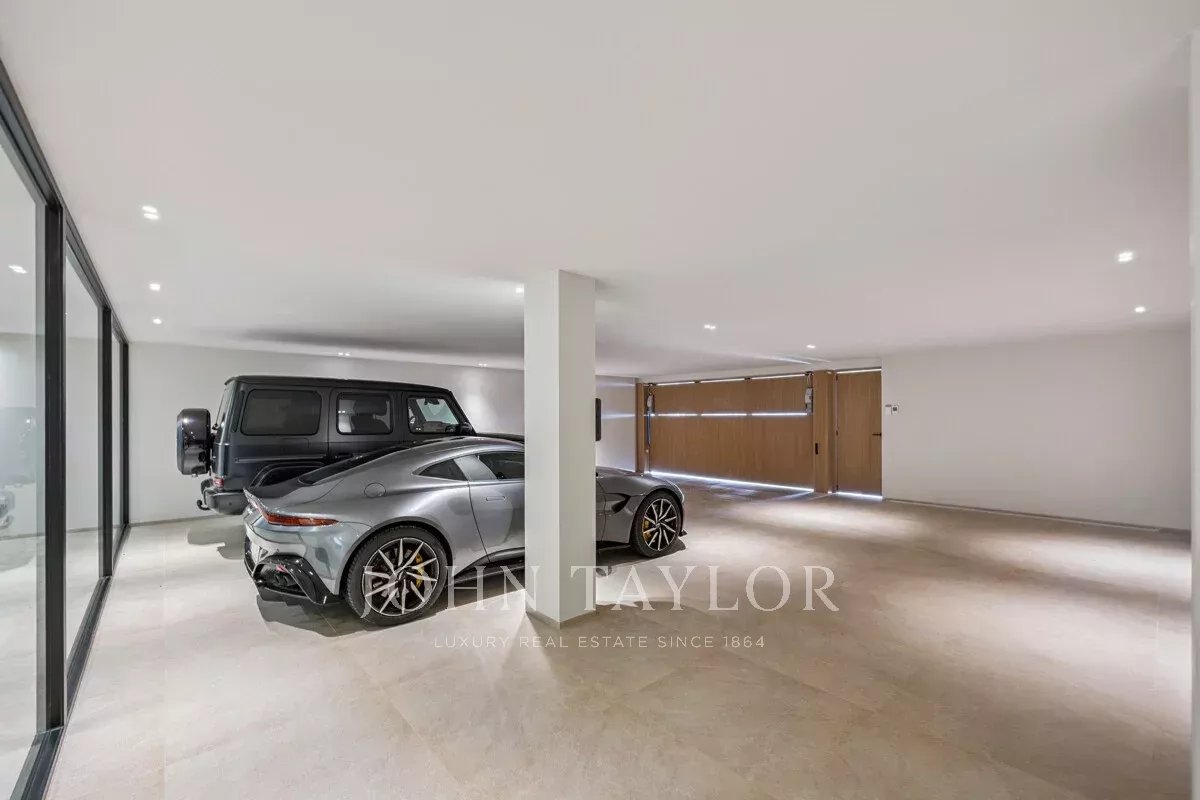 Im Obergeschoss befinden sich vier großzügige Schlafzimmer mit eigenem Bad, die mit klaren Linien, hochwertigen Materialien und einem Fokus auf Privatsphäre und Komfort gestaltet wurden. Das Untergeschoss bietet eine Garage für mehrere Fahrzeuge, großzügige Abstellräume, einen voll ausgestatteten Hauswirtschaftsraum sowie einen privaten Weinkeller – ideal für Sammler und Weinliebhaber.