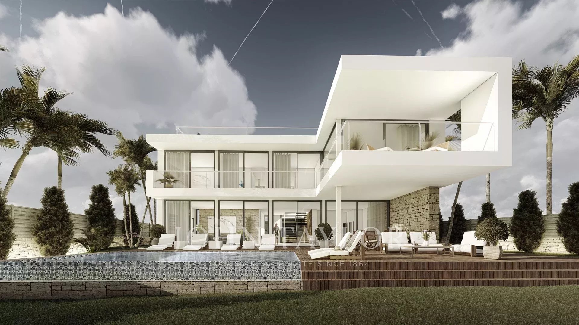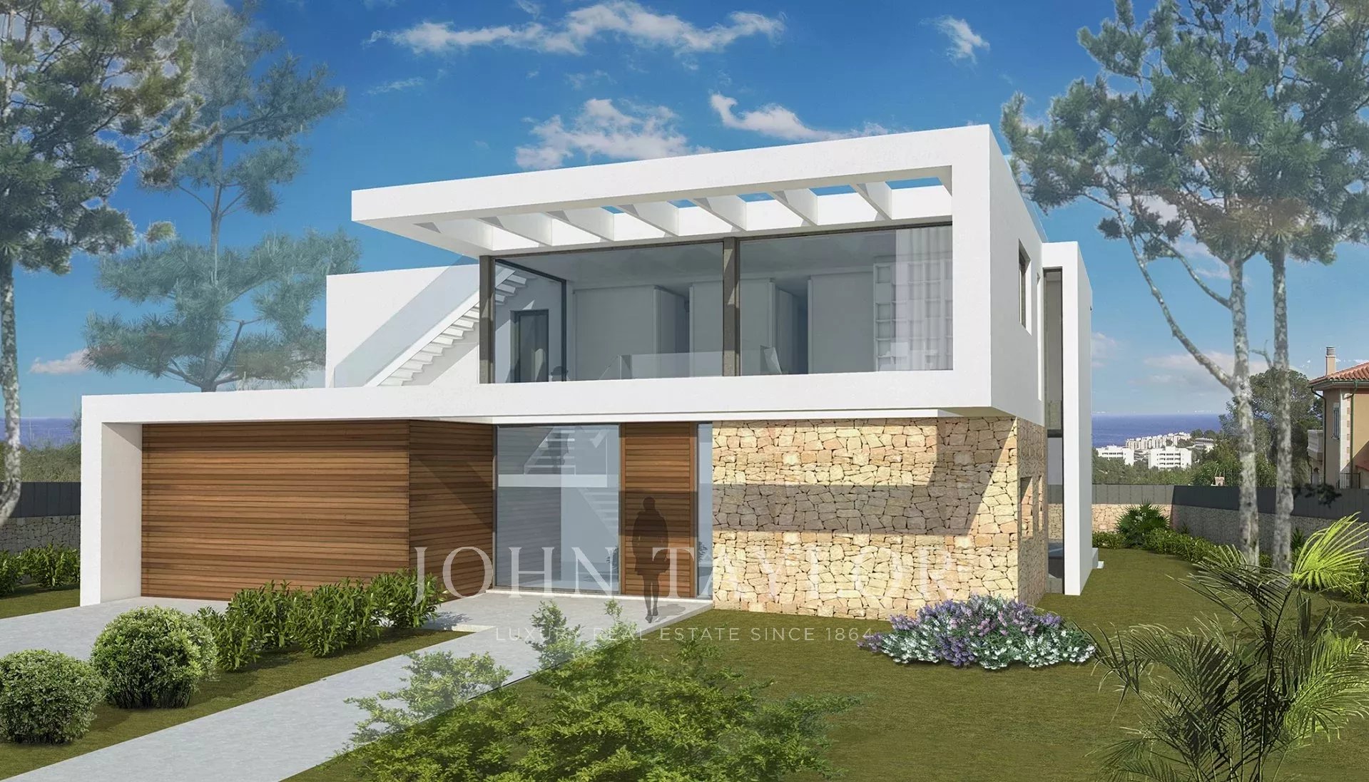 Diese neue Villa wird auf einem schönen flachen Grundstück in guter Lage mit Teilmeerblick in Cala Viñyas angeboten. Das Grundstück verfügt über 1.100 m2 Fläche und es entsteht eine moderne Villa mit mediterranen Akzenten, mit einer Gesamtfläche von ca. 385 m2, aufgeteilt auf 2 Stockwerke und einer Dachterrasse. 4 Doppelschlafzimmer und 4 Badezimmer befinden sich im 1. Obergeschoss. Im Erdgeschoss ist der Wohnbereich mit offener Küche geplant. Hohe Glasfronten verleihen der Immobilie viel Licht und einen schönen Blick. Man hat Meerblick vom ersten Stock, sowie von der Dachterrasse. Eine Garage, Klimaanlage w/k, Fußbodenheizung durch Wärmepumpe, Doppelverglasung, Gaggenau E-Geräte und ein großer Pool sind einige der Highlights dieser Neubauvilla, welche von Natur umgeben ist.