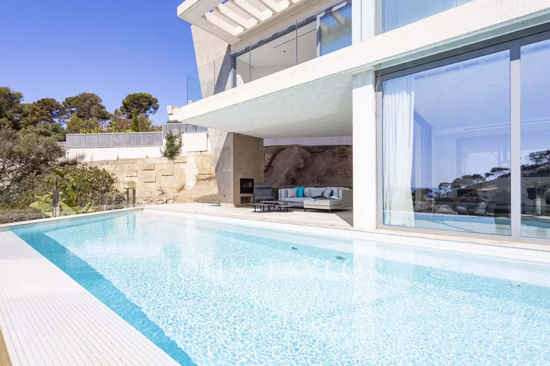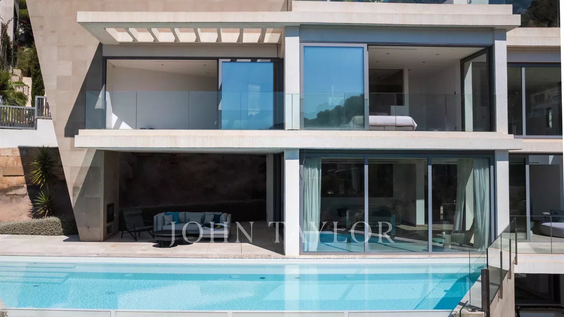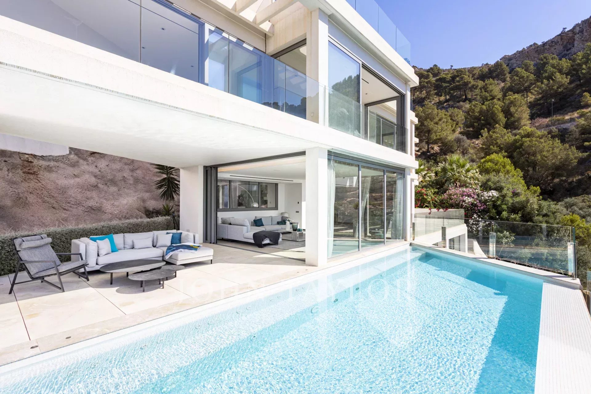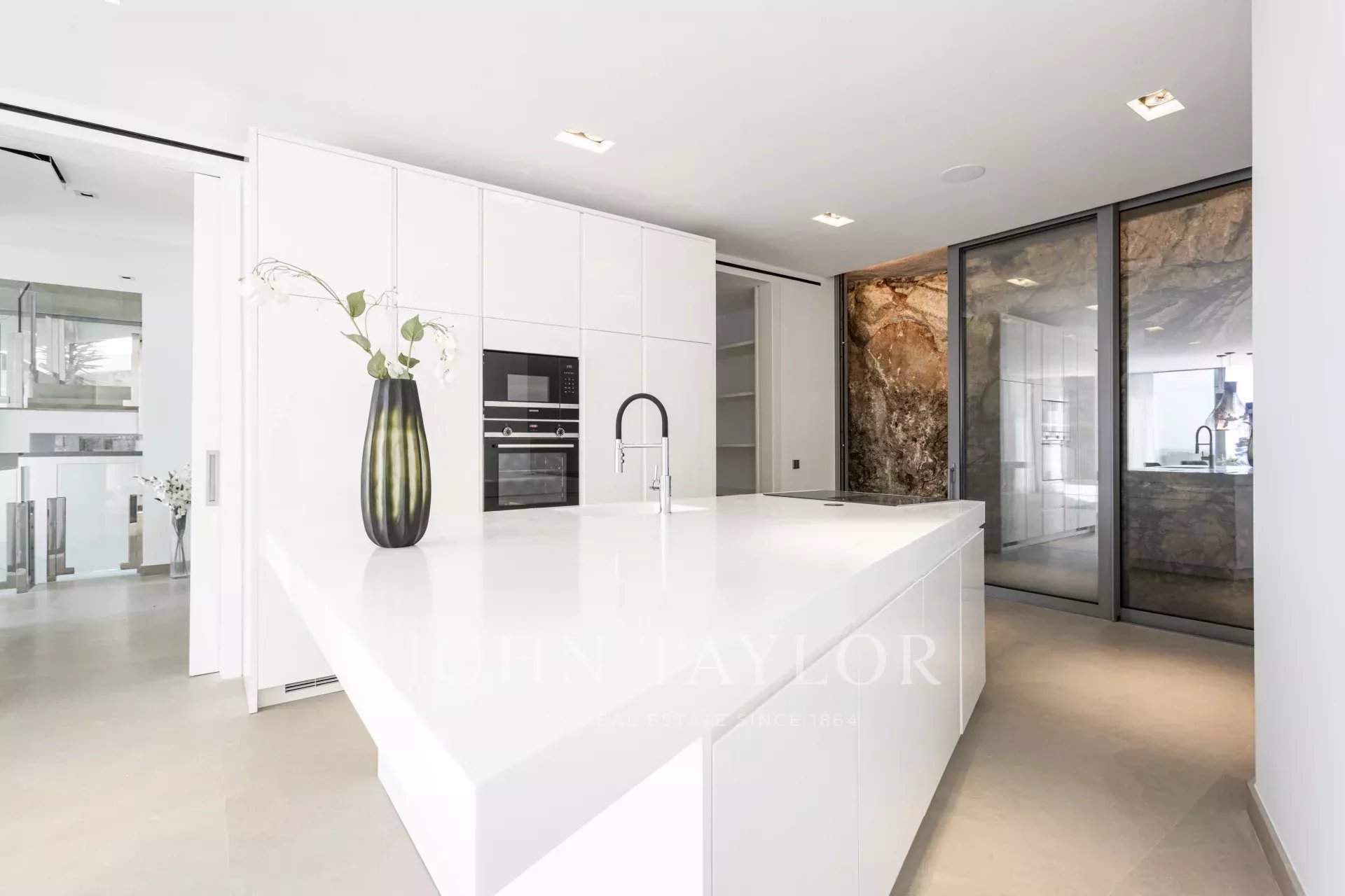 Die Immobilie besticht durch ihre imposante Architektur und die Glasfassade zum Meer hin, die ein Maximum an natürlichem Licht und Meerblick von jedem Zimmer aus gewährleistet. Bei der Einfahrt in die private Garage gibt es sowohl einen Aufzug als auch einen Treppenaufgang zu den unteren Etagen. Auf der zweiten Ebene befinden sich drei Schlafzimmer mit eigenem Bad. Die dritte Ebene ist ganz dem täglichen Leben gewidmet. Die voll ausgestattete Küche und das Esszimmer gehen mühelos in das Wohnzimmer über und bieten einen direkten Zugang zur Außenlounge mit einem gemütlichen Kamin, der Terrasse und dem Poolbereich. Auf der unteren Ebene befinden sich ein Heimkino und ein privater Fitnessraum. Das Haus wurde unter Verwendung der höchsten Qualitätsstandards gebaut, wie z.B. zentrale Klimaanlage, Fußbodenheizung, Osmoseanlage und Hausautomation.