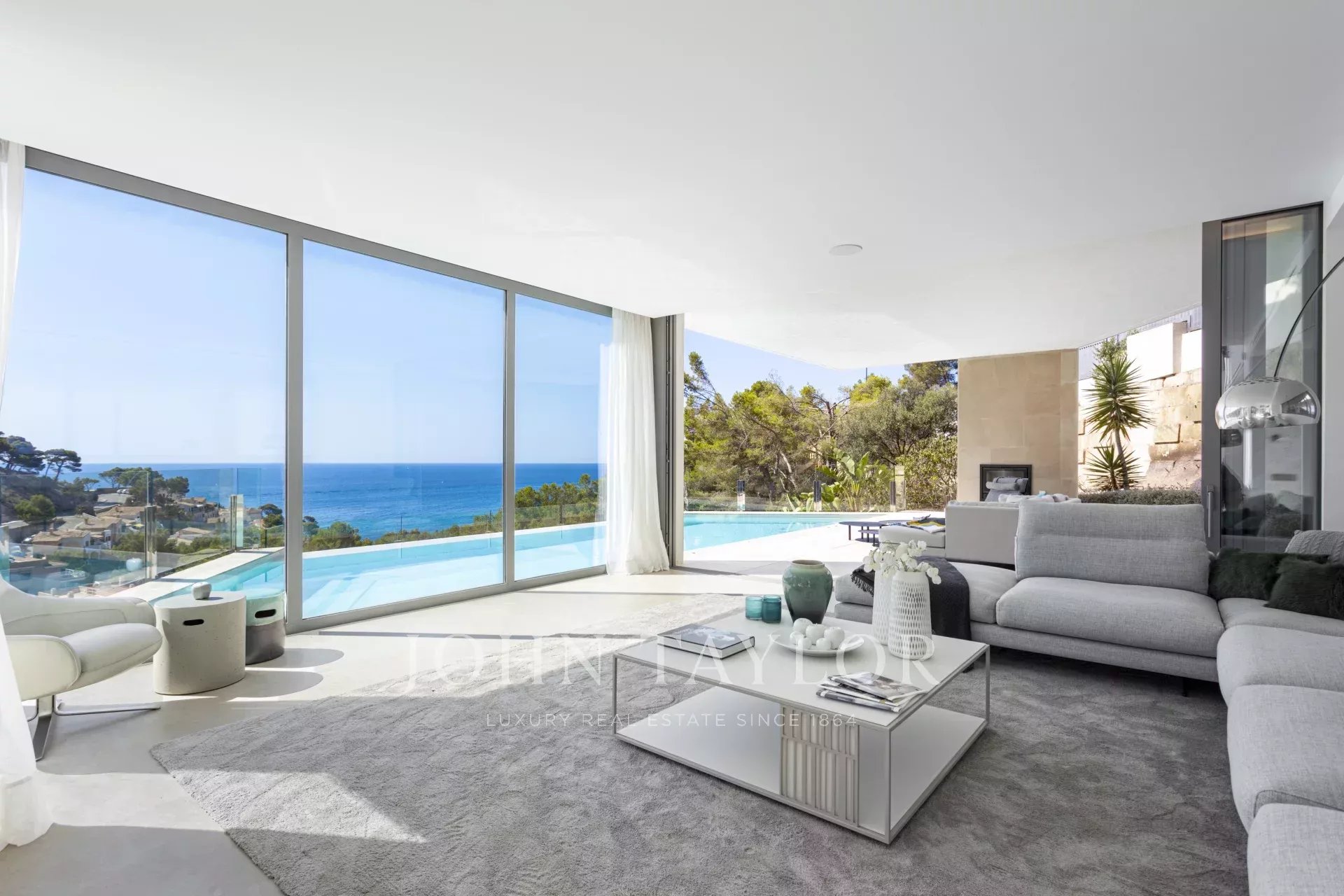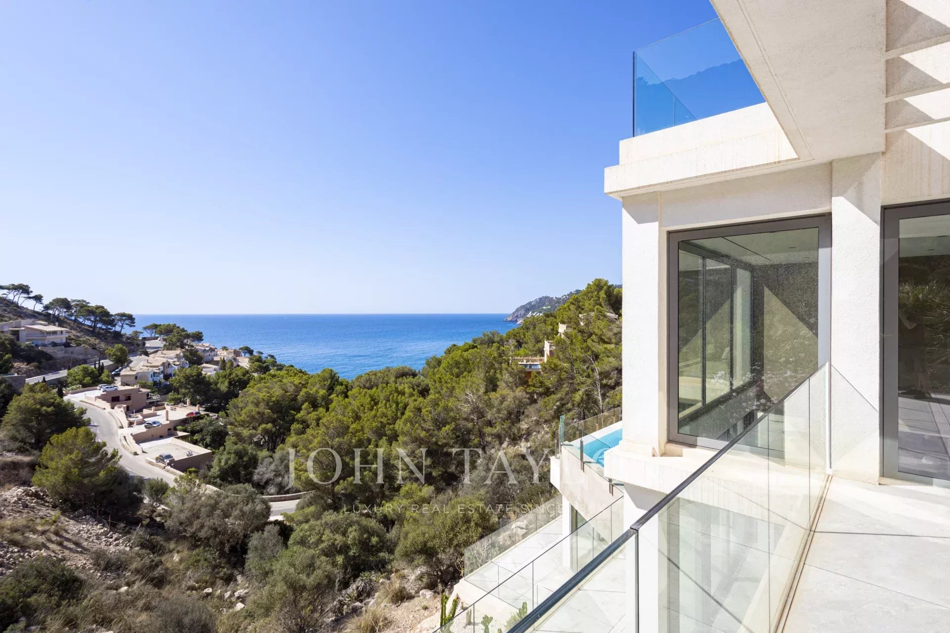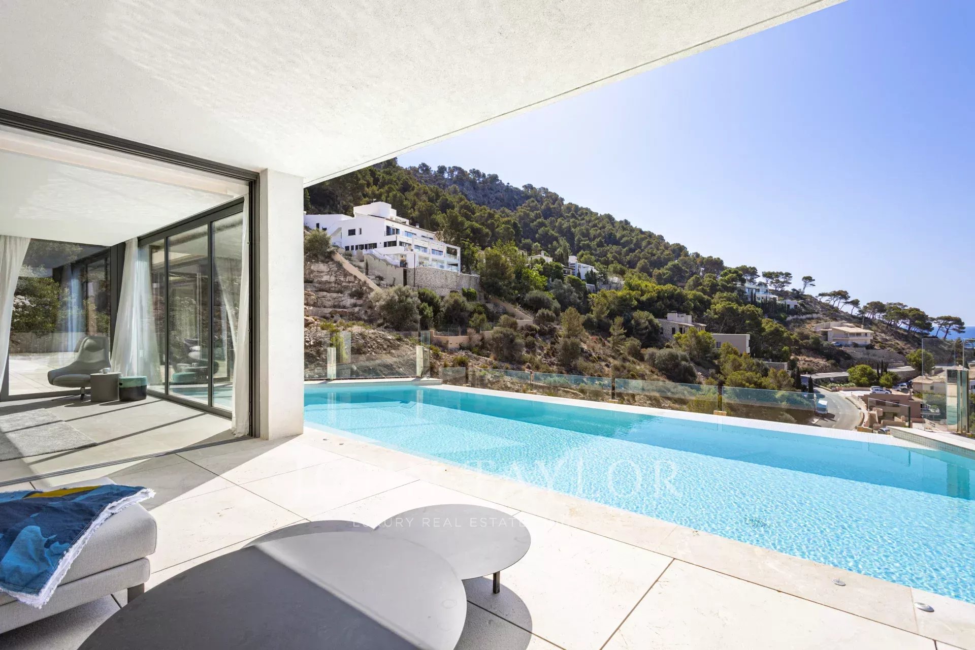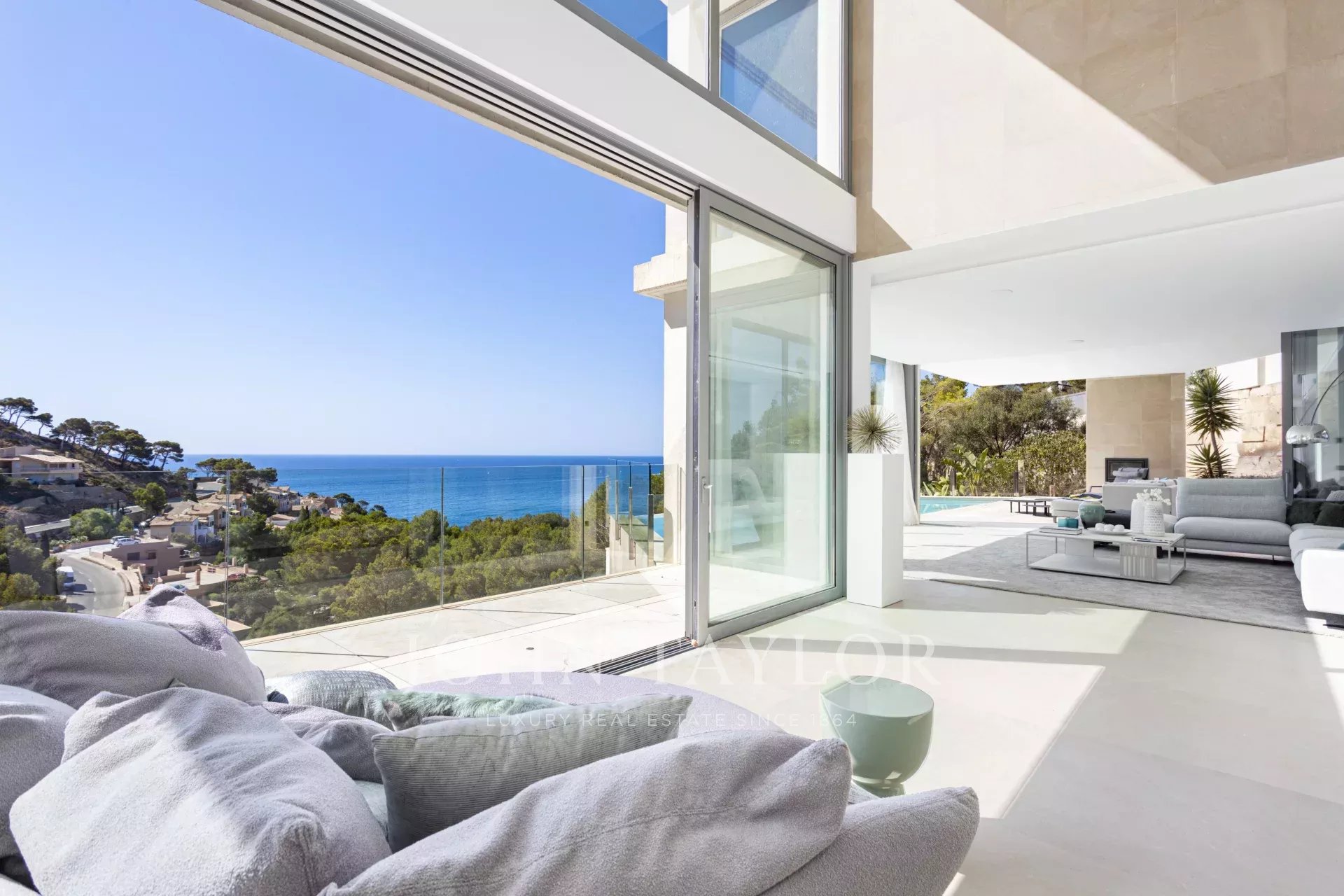 Die Immobilie besticht durch ihre imposante Architektur und die Glasfassade zum Meer hin, die ein Maximum an natürlichem Licht und Meerblick von jedem Zimmer aus gewährleistet. Bei der Einfahrt in die private Garage gibt es sowohl einen Aufzug als auch einen Treppenaufgang zu den unteren Etagen. Auf der zweiten Ebene befinden sich drei Schlafzimmer mit eigenem Bad. Die dritte Ebene ist ganz dem täglichen Leben gewidmet. Die voll ausgestattete Küche und das Esszimmer gehen mühelos in das Wohnzimmer über und bieten einen direkten Zugang zur Außenlounge mit einem gemütlichen Kamin, der Terrasse und dem Poolbereich. Auf der unteren Ebene befinden sich ein Heimkino und ein privater Fitnessraum. Das Haus wurde unter Verwendung der höchsten Qualitätsstandards gebaut, wie z.B. zentrale Klimaanlage, Fußbodenheizung, Osmoseanlage und Hausautomation.