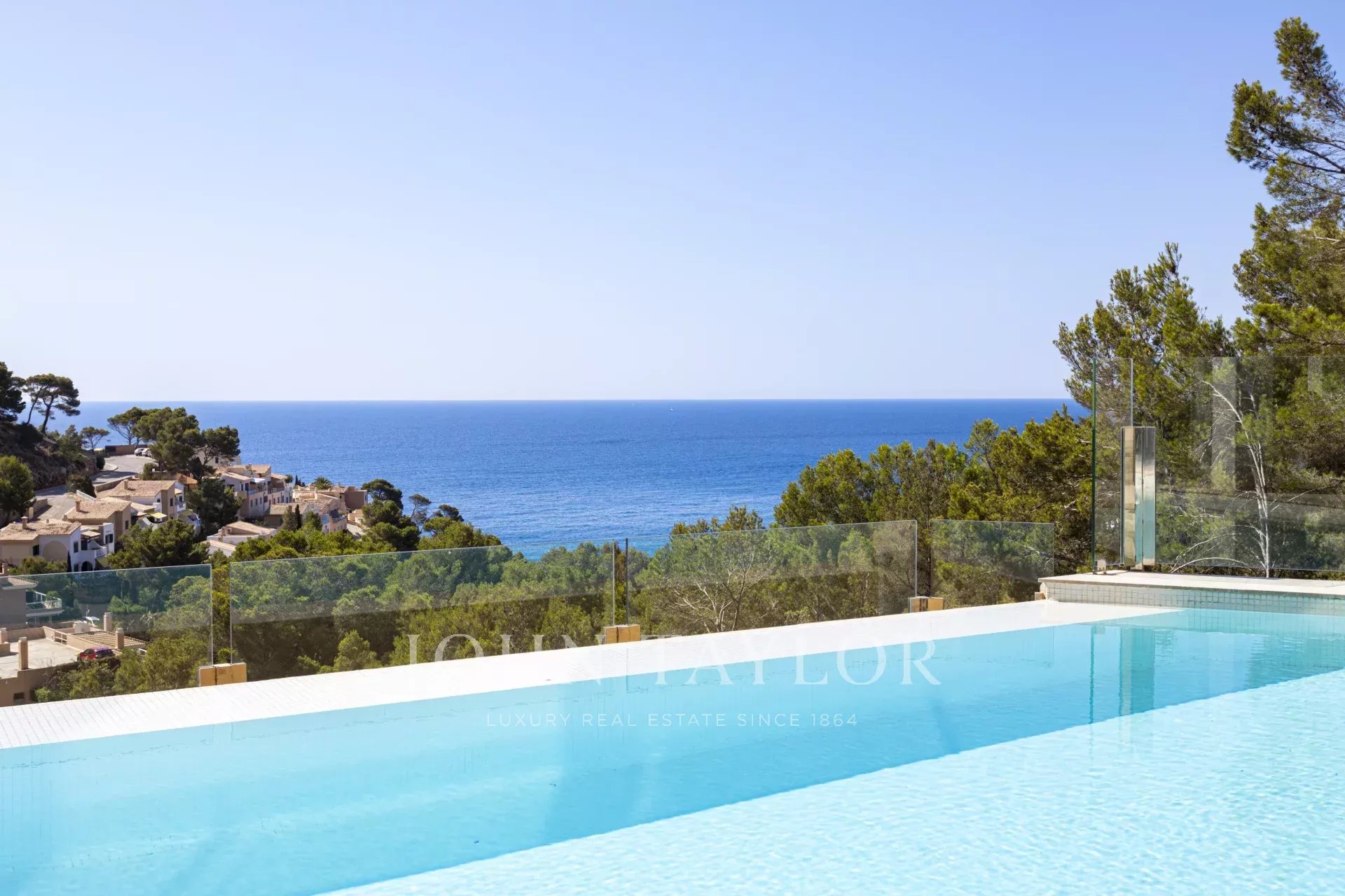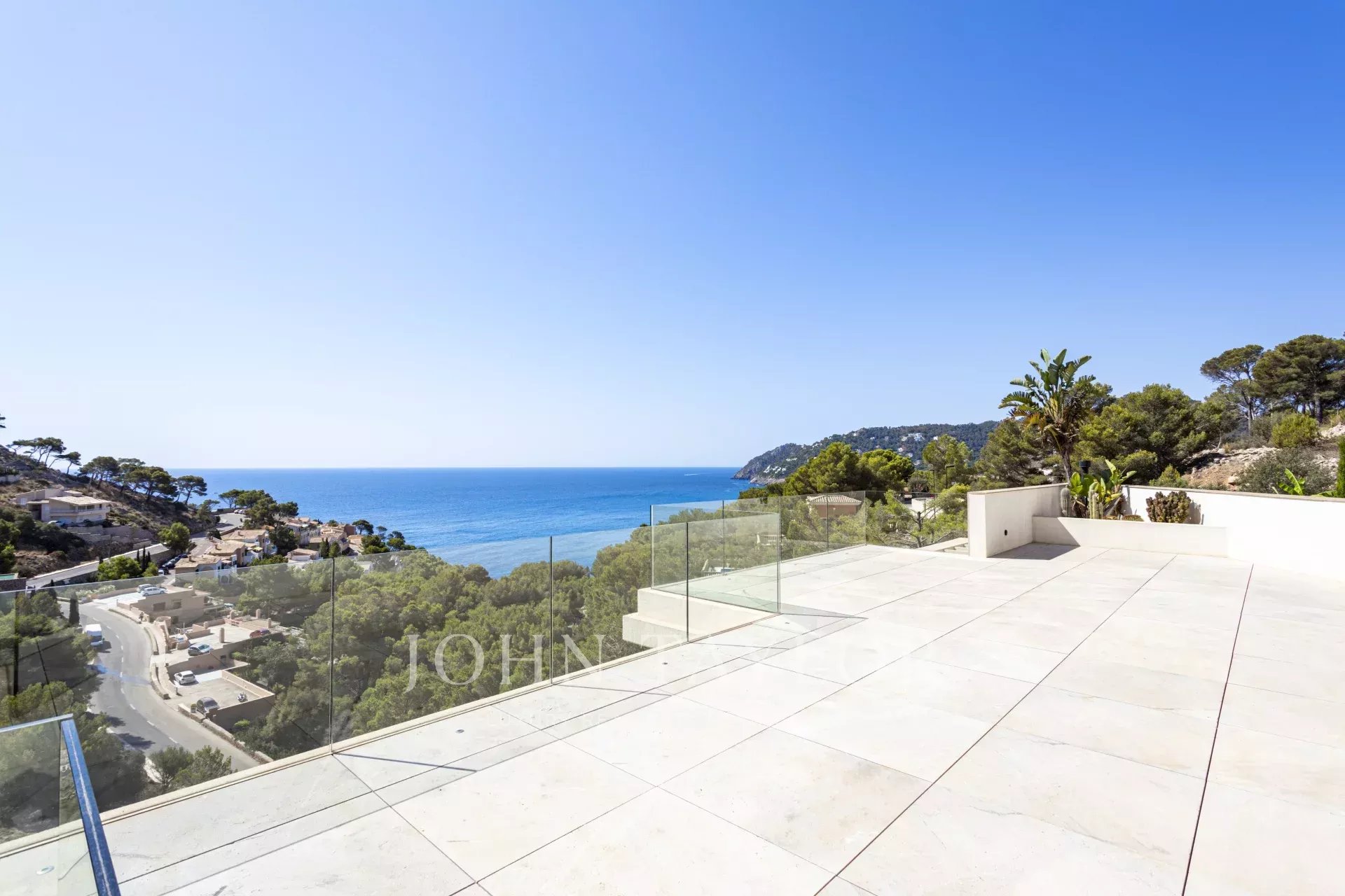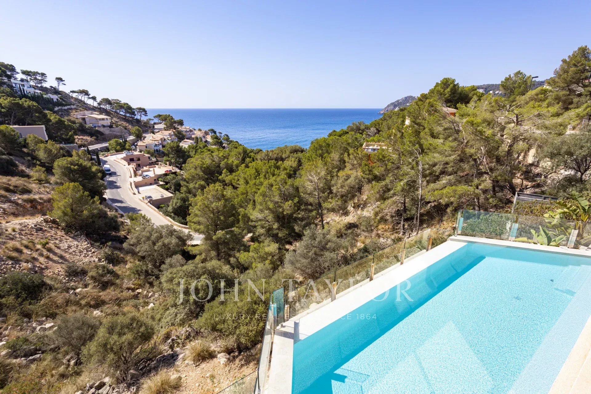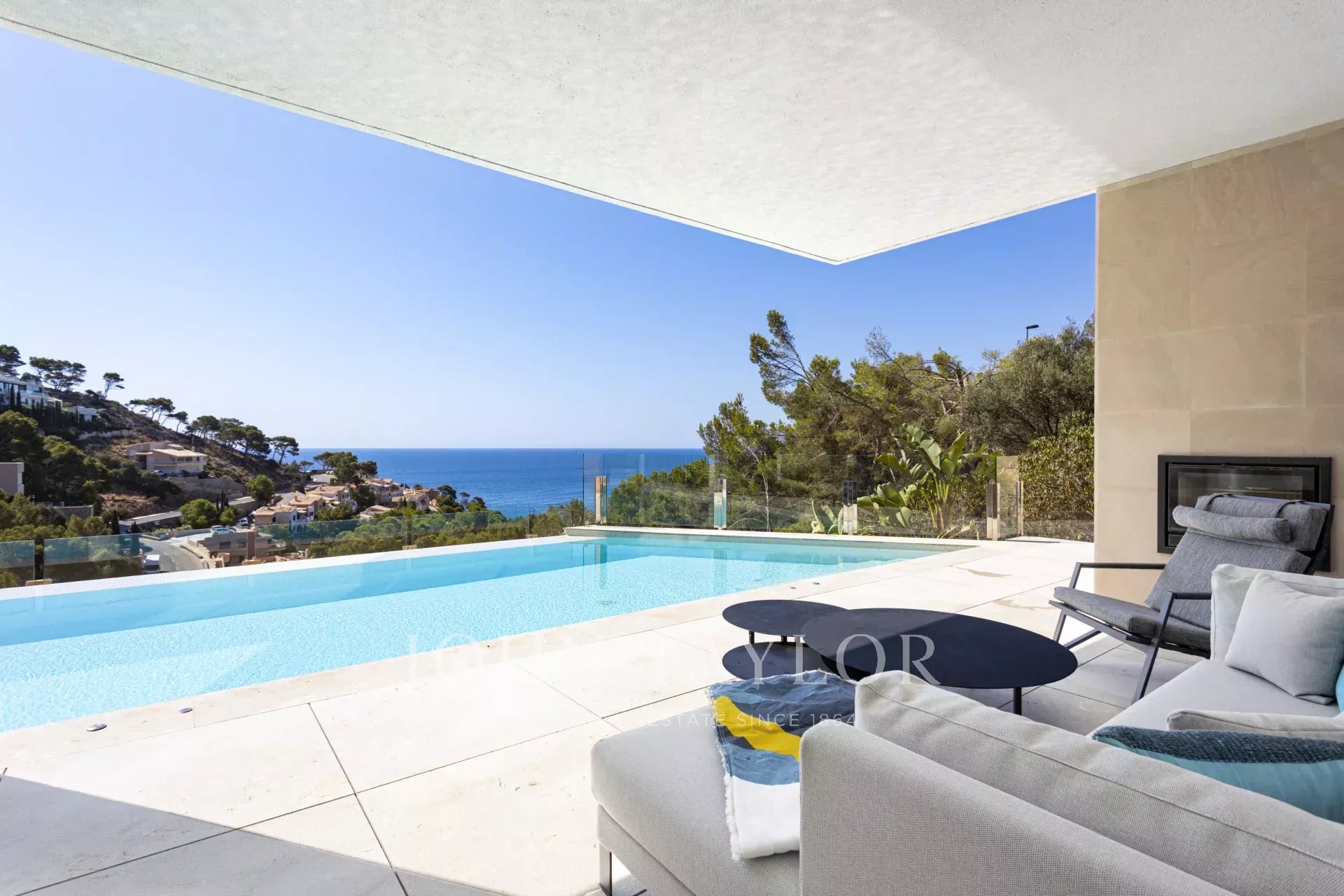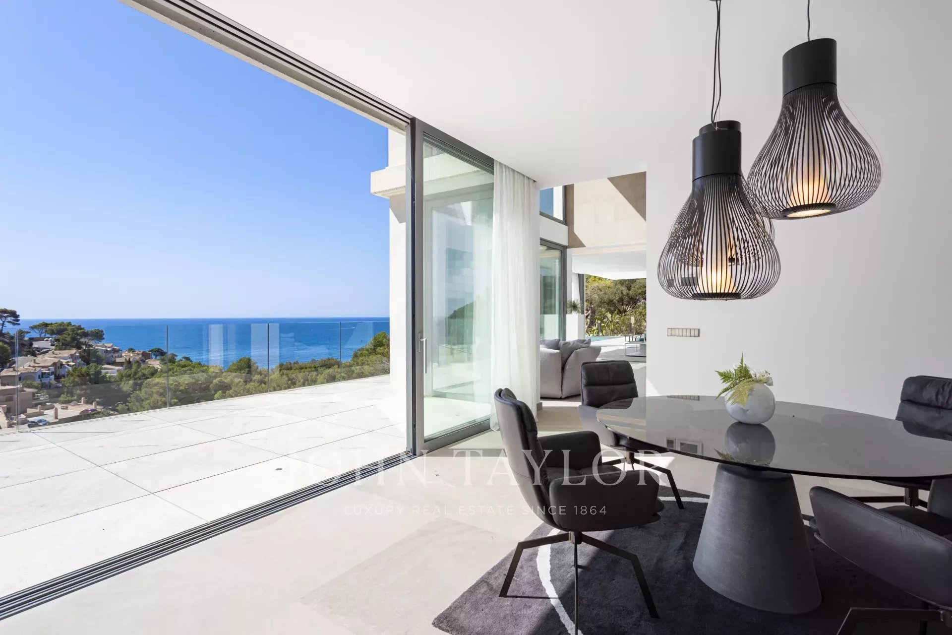 Die Immobilie besticht durch ihre imposante Architektur und die Glasfassade zum Meer hin, die ein Maximum an natürlichem Licht und Meerblick von jedem Zimmer aus gewährleistet. Bei der Einfahrt in die private Garage gibt es sowohl einen Aufzug als auch einen Treppenaufgang zu den unteren Etagen. Auf der zweiten Ebene befinden sich drei Schlafzimmer mit eigenem Bad. Die dritte Ebene ist ganz dem täglichen Leben gewidmet. Die voll ausgestattete Küche und das Esszimmer gehen mühelos in das Wohnzimmer über und bieten einen direkten Zugang zur Außenlounge mit einem gemütlichen Kamin, der Terrasse und dem Poolbereich. Auf der unteren Ebene befinden sich ein Heimkino und ein privater Fitnessraum. Das Haus wurde unter Verwendung der höchsten Qualitätsstandards gebaut, wie z.B. zentrale Klimaanlage, Fußbodenheizung, Osmoseanlage und Hausautomation.