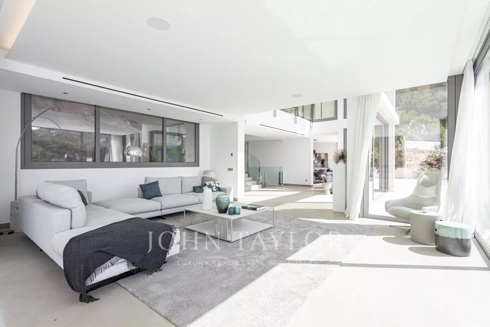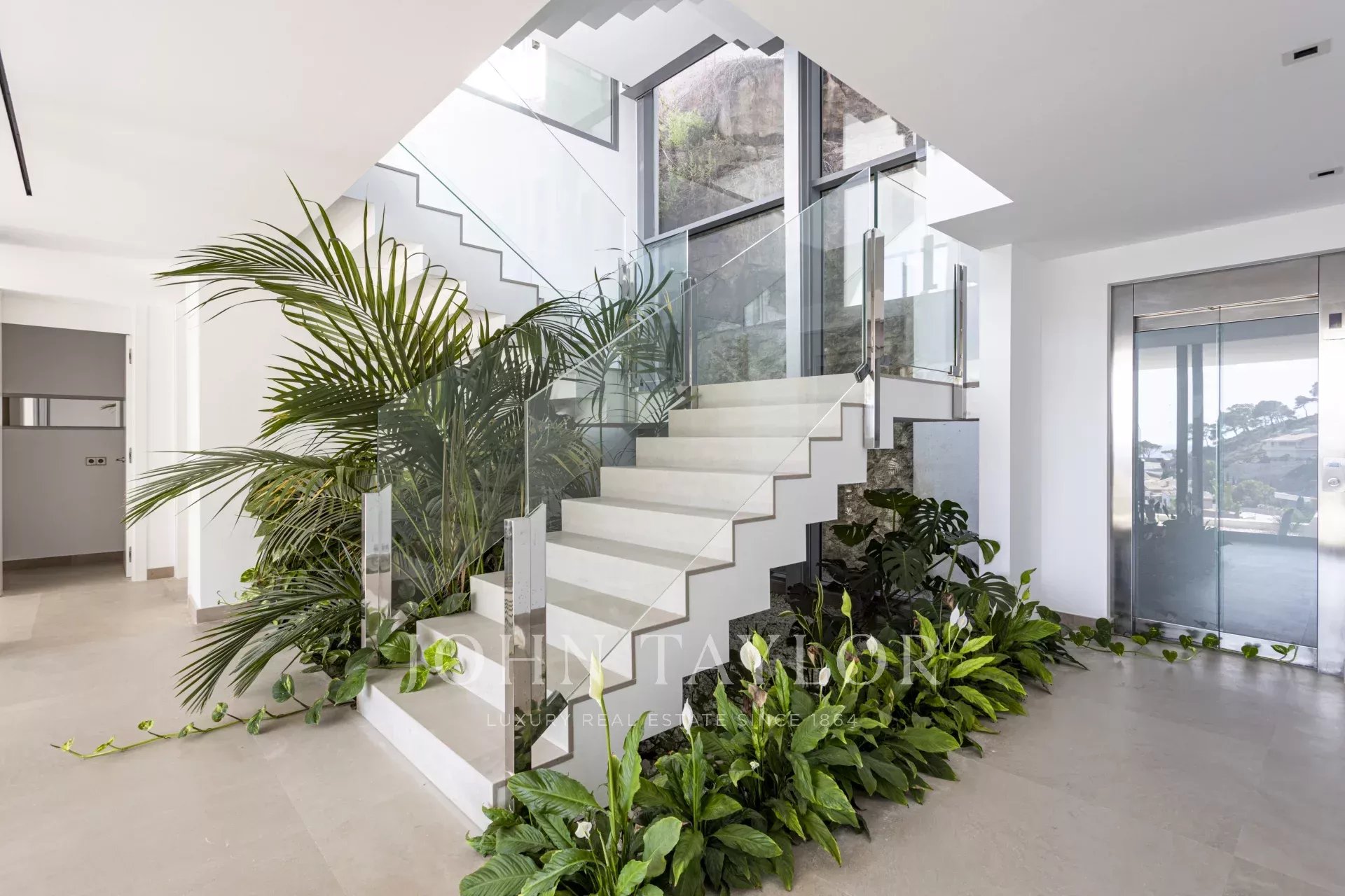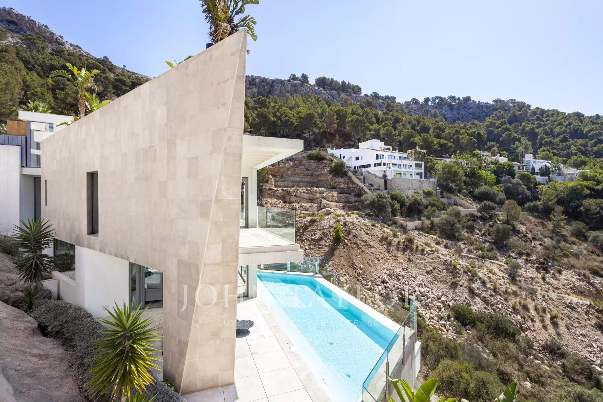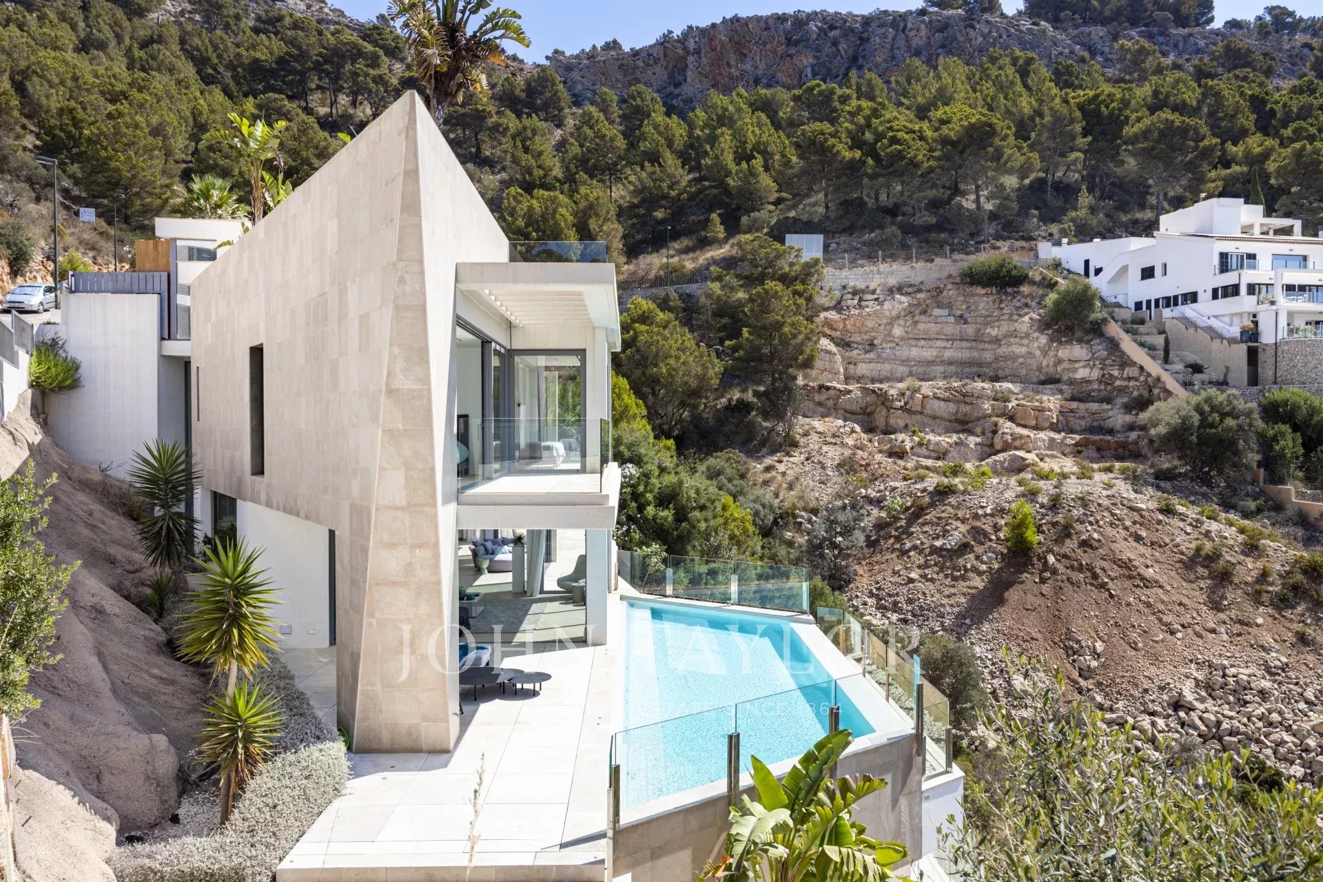 Die Immobilie besticht durch ihre imposante Architektur und die Glasfassade zum Meer hin, die ein Maximum an natürlichem Licht und Meerblick von jedem Zimmer aus gewährleistet. Bei der Einfahrt in die private Garage gibt es sowohl einen Aufzug als auch einen Treppenaufgang zu den unteren Etagen. Auf der zweiten Ebene befinden sich drei Schlafzimmer mit eigenem Bad. Die dritte Ebene ist ganz dem täglichen Leben gewidmet. Die voll ausgestattete Küche und das Esszimmer gehen mühelos in das Wohnzimmer über und bieten einen direkten Zugang zur Außenlounge mit einem gemütlichen Kamin, der Terrasse und dem Poolbereich. Auf der unteren Ebene befinden sich ein Heimkino und ein privater Fitnessraum. Das Haus wurde unter Verwendung der höchsten Qualitätsstandards gebaut, wie z.B. zentrale Klimaanlage, Fußbodenheizung, Osmoseanlage und Hausautomation.