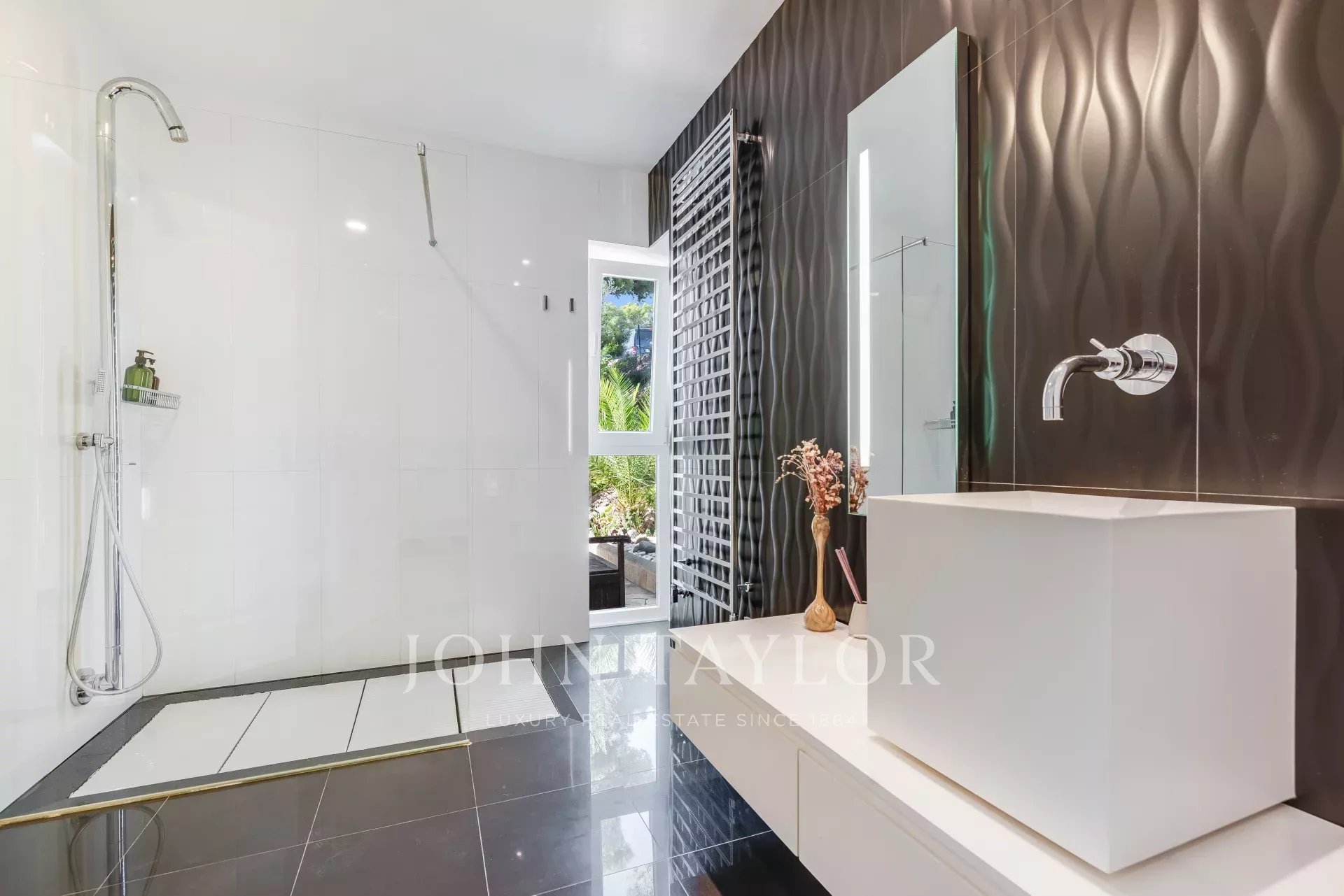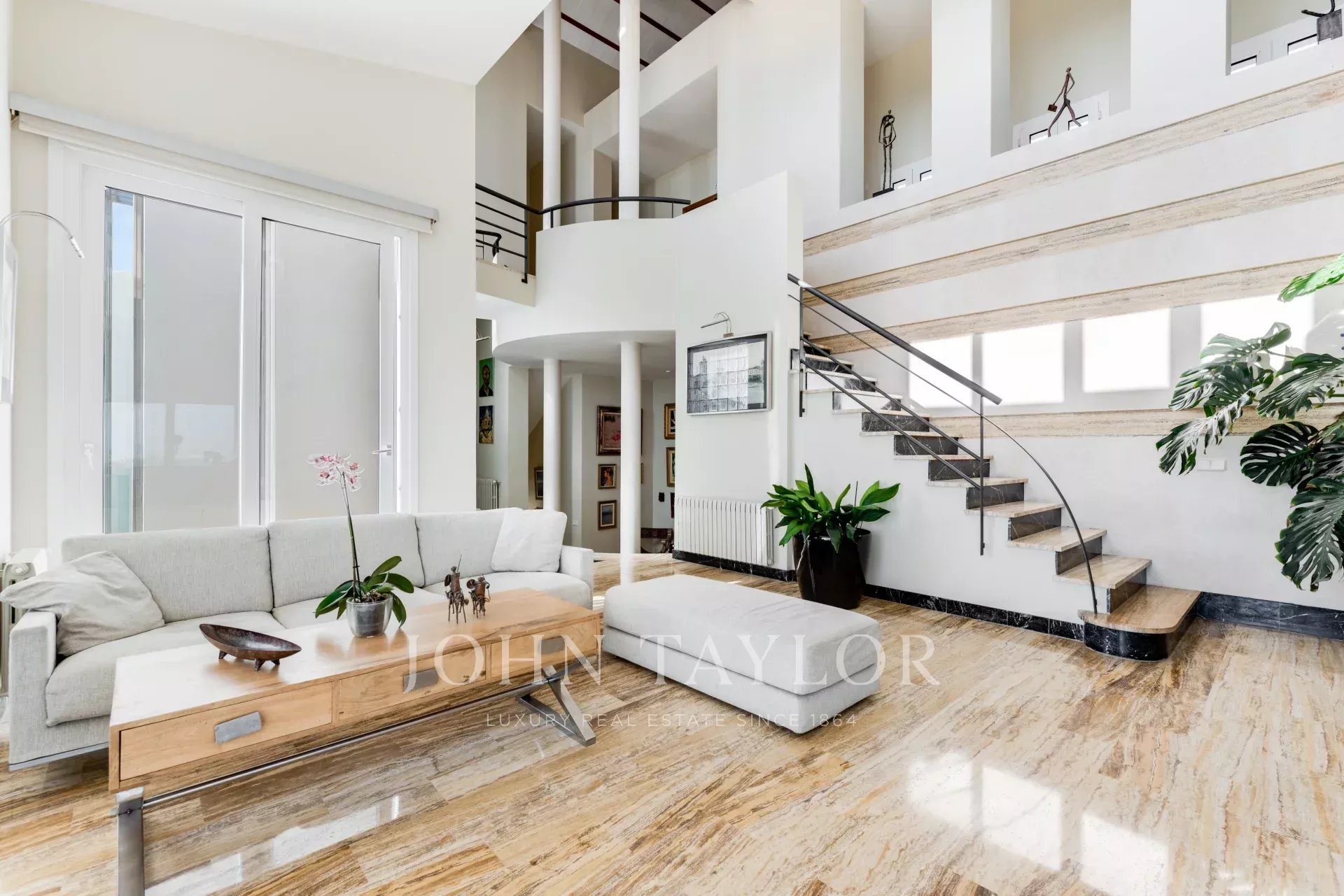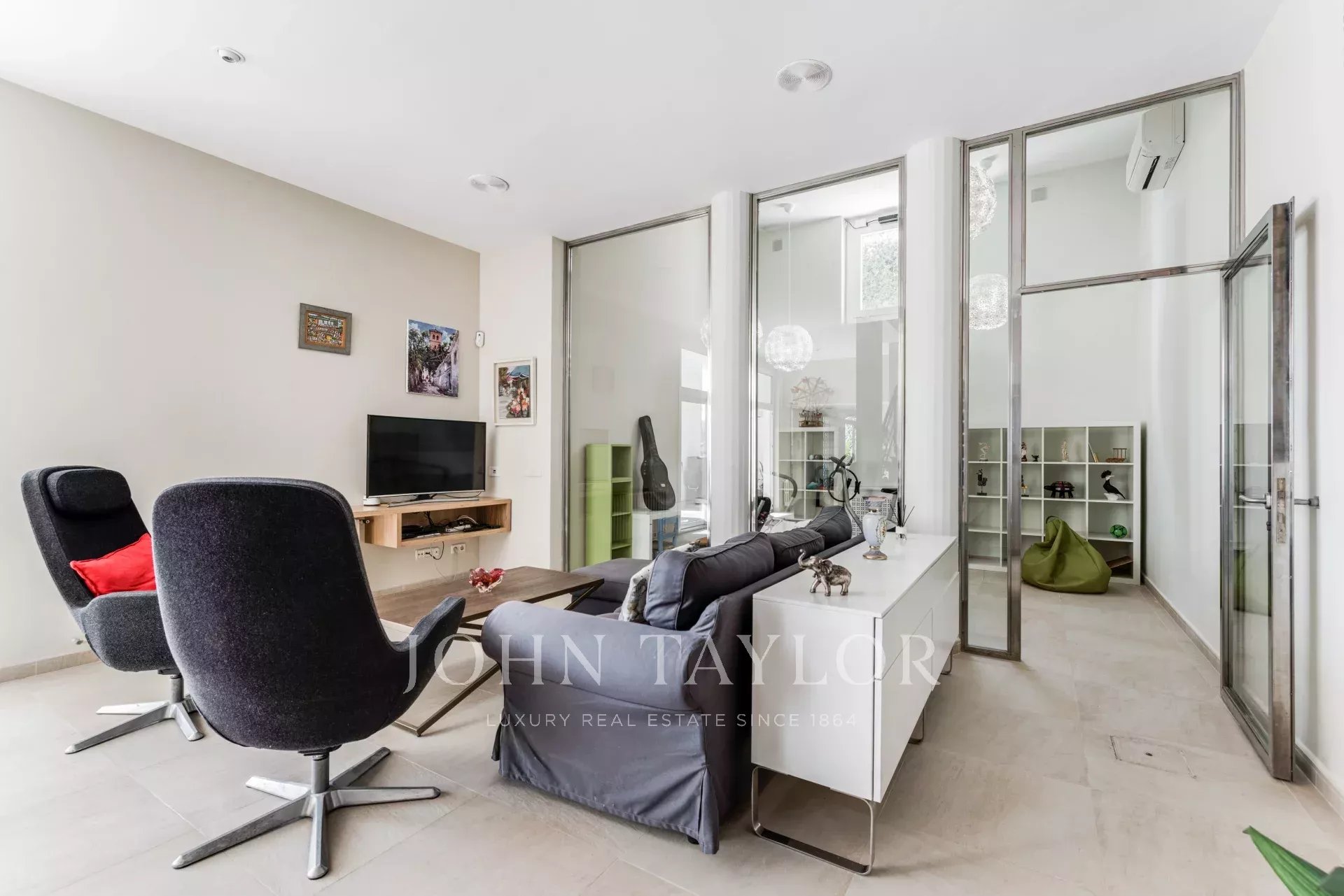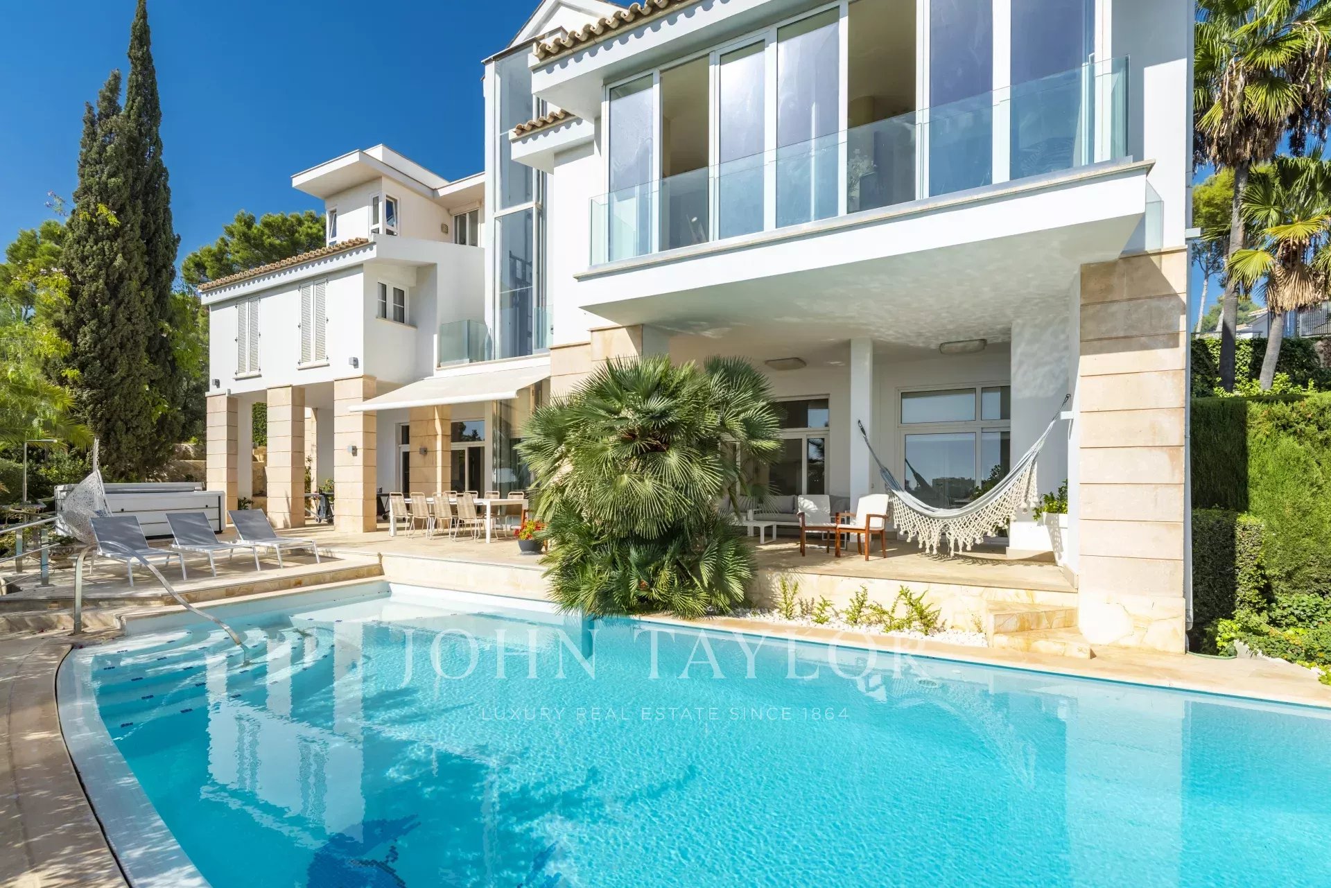 Die nach Süd-Osten ausgerichtete Villa ist in verschiedene Bereiche unterteilt. Es gibt einen Tagesbereich, in dem sich das Wohnzimmer, das Esszimmer, die Küche und ein Büro befinden. In einem anderen Teil des Hauses befinden sich die 5 Schlafzimmer und 3 Bäder. Zusätzlich gibt es eine separate Gästewohnung und einen Bereich für das Servicepersonal. Im Erdgeschoss auf der gleichen Ebene wie die Sonnenterrasse mit Pool und Jacuzzi befindet sich ein zweites Wohnzimmer und ein großer Raum mit doppelter Höhe, der verschiedene Nutzungsmöglichkeiten bietet, wie z.B. Fitnessraum, Atelier, Spielzimmer, etc.