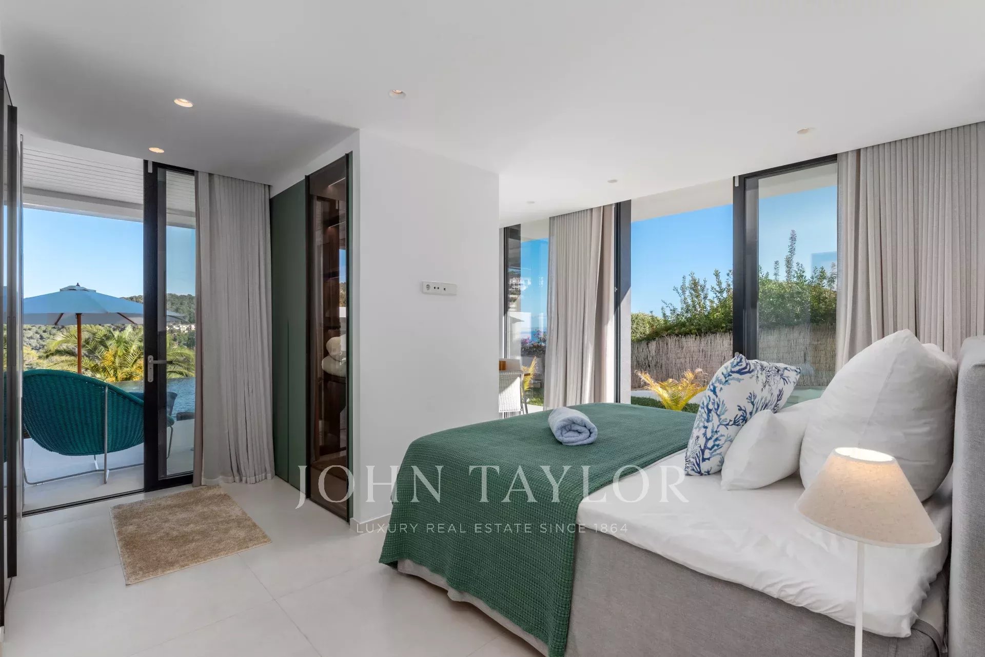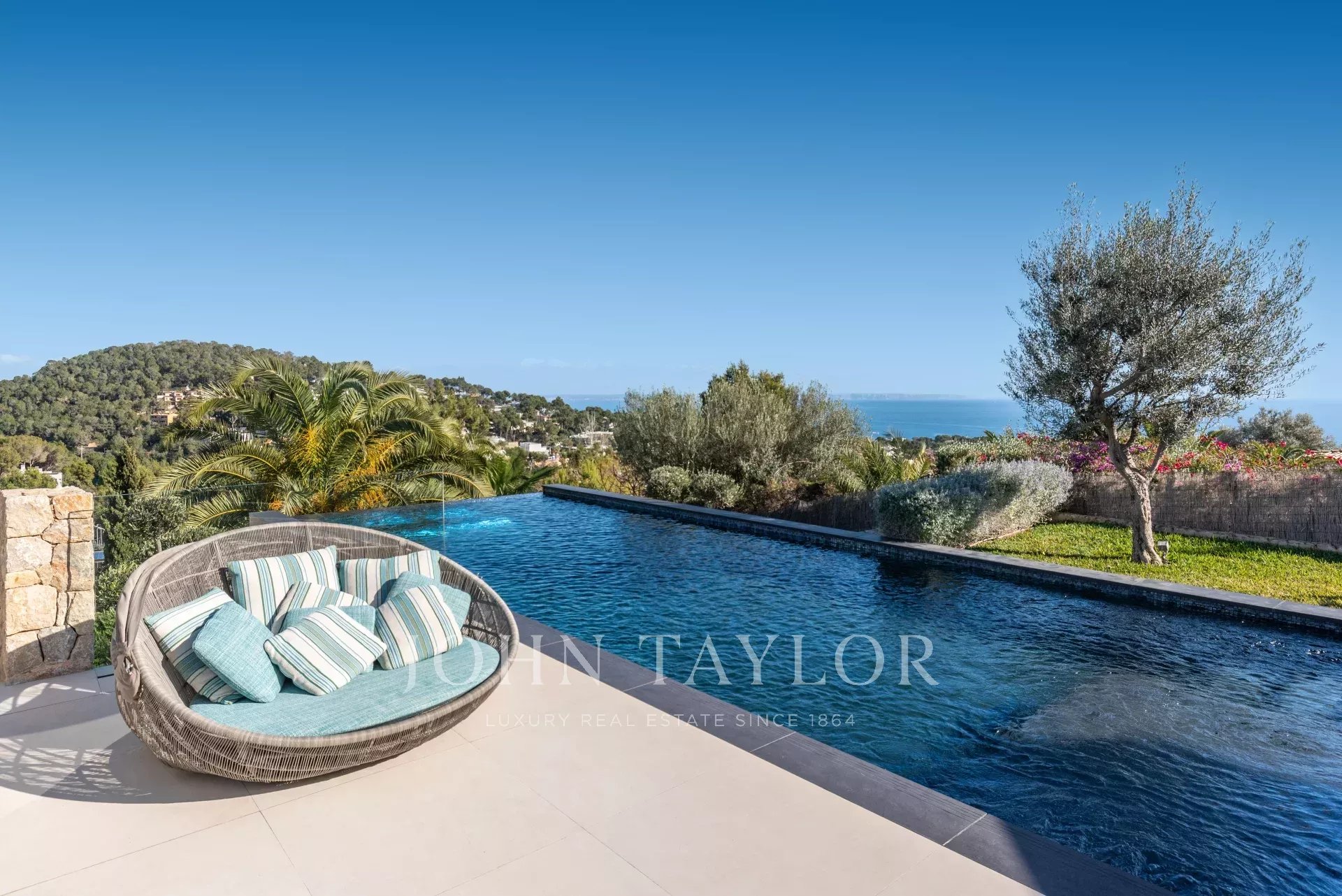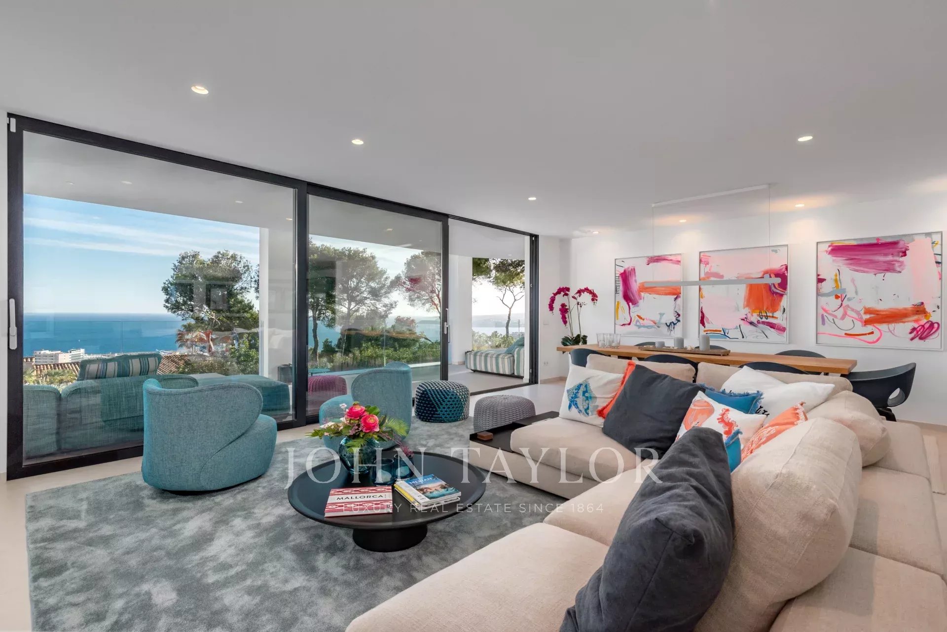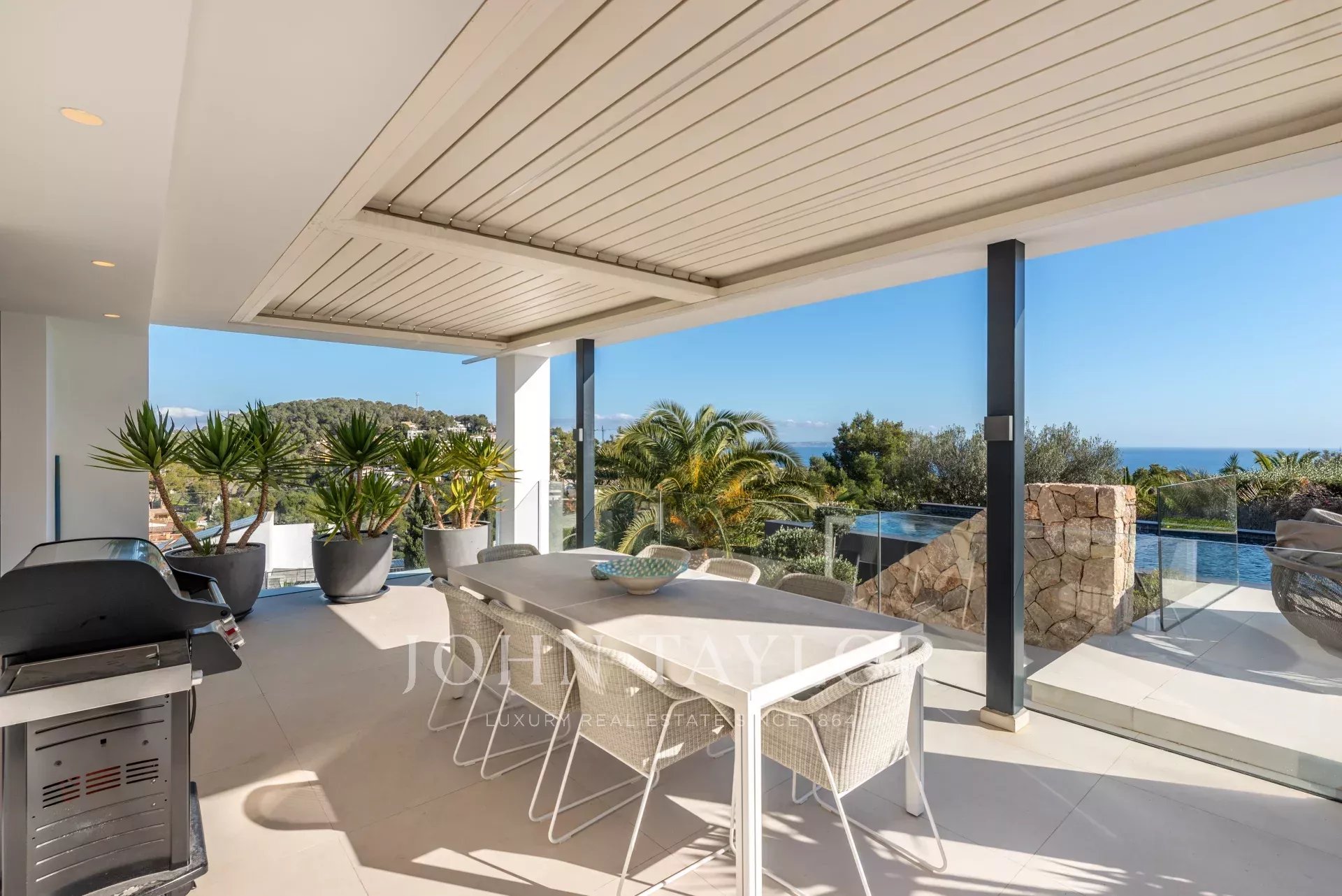 Im Herzen von Costa d'en Blanes, einer der begehrtesten Wohngegenden im Südwesten Mallorcas, liegt diese beeindruckende Luxusvilla. Ihre privilegierte Lage auf einem Hügel garantiert nicht nur Privatsphäre und Ruhe, sondern auch einen spektakulären Panoramablick auf das Mittelmeer, der sich bis zum Horizont erstreckt und jeden Sonnenuntergang zu einem Kunstwerk macht. Diese elegante, neu gebaute Immobilie verbindet zeitgenössisches architektonisches Design mit hochwertigster Ausstattung. Mit einer bebauten Fläche von 517 m² auf einem großzügigen Grundstück von 1.374 m² bietet die Villa 5 geräumige Schlafzimmer, jedes mit eigenem Bad, für maximalen Komfort und Privatsphäre. Das Hauptwohnzimmer, das dank seiner großen Fenster von natürlichem Licht durchflutet wird, öffnet sich zu einer modernen, offenen Küche, die perfekt ausgestattet ist, um die kulinarische Kunst zu genießen und dabei das unendliche Blau des Meeres zu betrachten. Von hier aus hat man direkten Zugang zur Terrasse und zum Infinity-Pool, die eine ideale Umgebung für Unterhaltung und Entspannung bieten. Im Außenbereich entfaltet die Villa ihren wahren Charme: ein elegantes Poolhaus, ein wunderschön angelegter Garten und eine Doppelgarage, ergänzt durch die neueste Haustechnik, die maximalen Komfort und Effizienz gewährleistet. Diese Villa ist nicht nur eine Immobilie, sondern ein Ausdruck von Stil und Raffinesse, perfekt für alle, die in jedem Detail das Beste suchen. Entdecken Sie die perfekte Harmonie von Luxus, Komfort und Lage.
