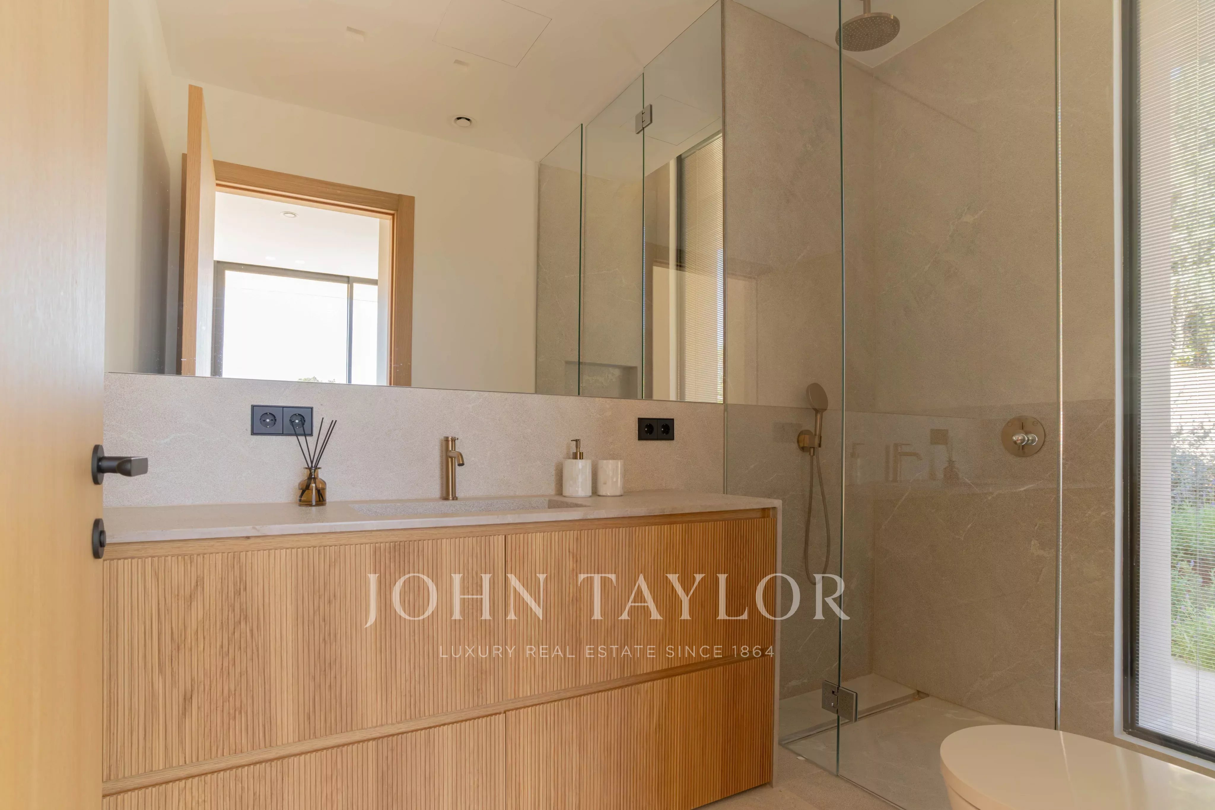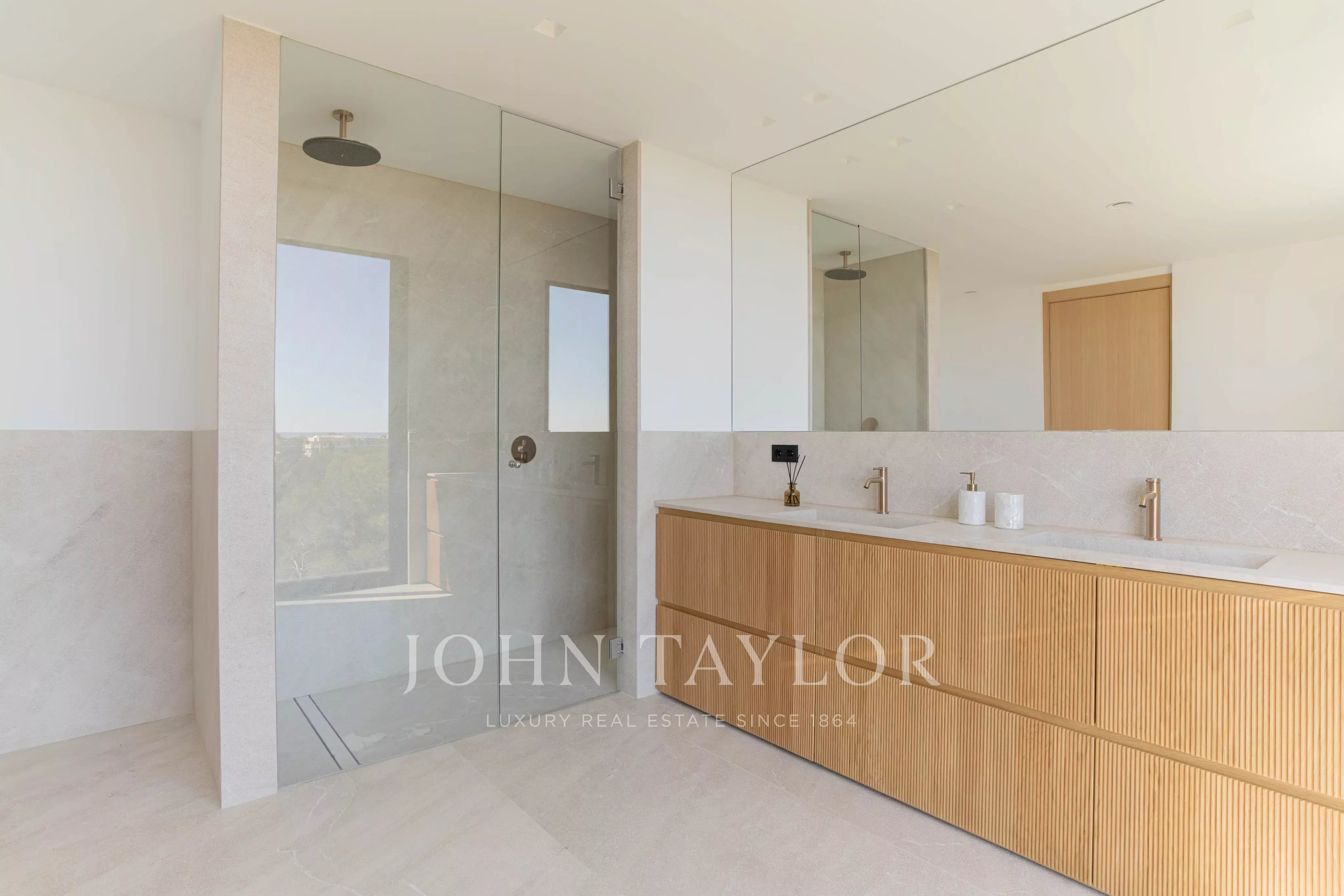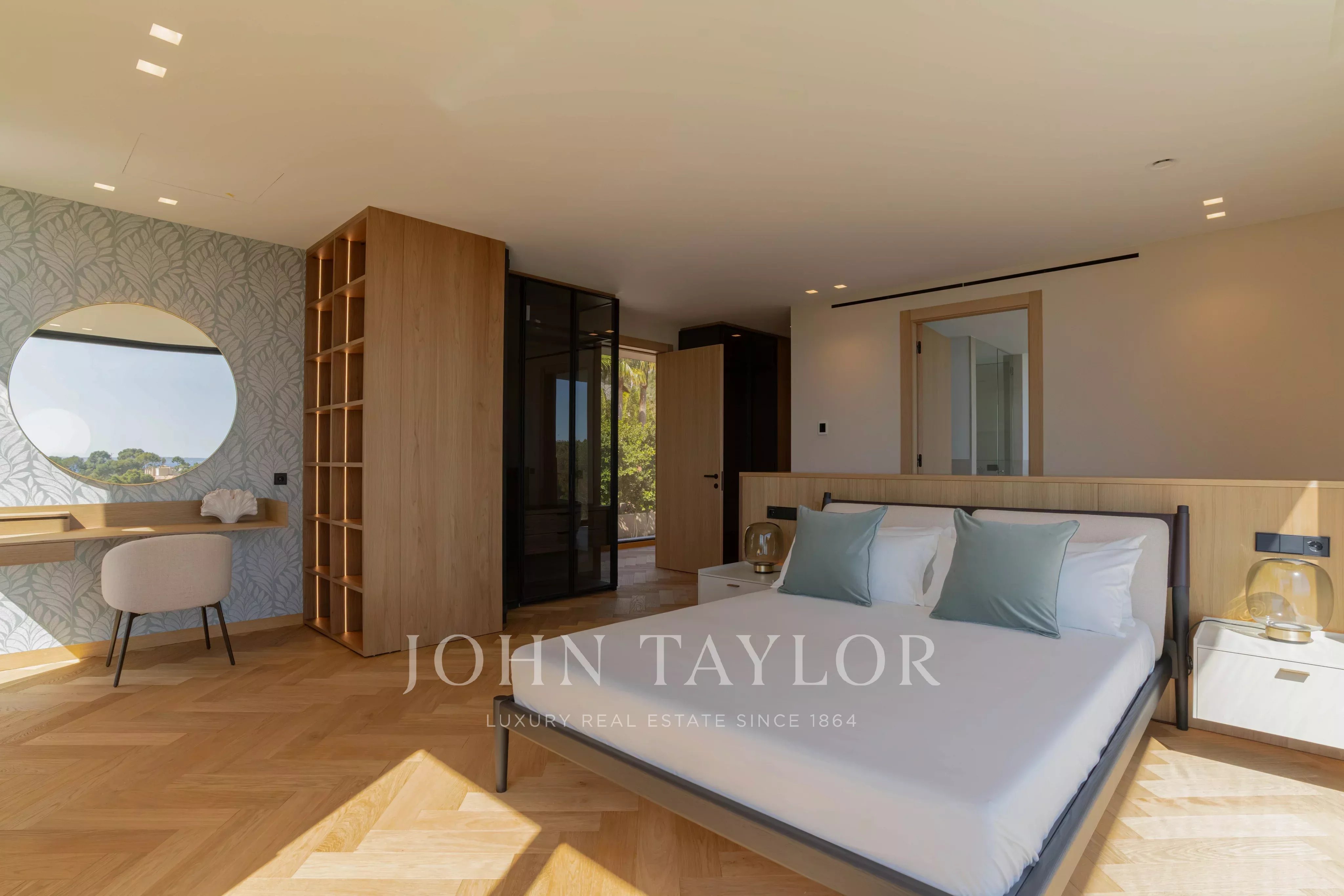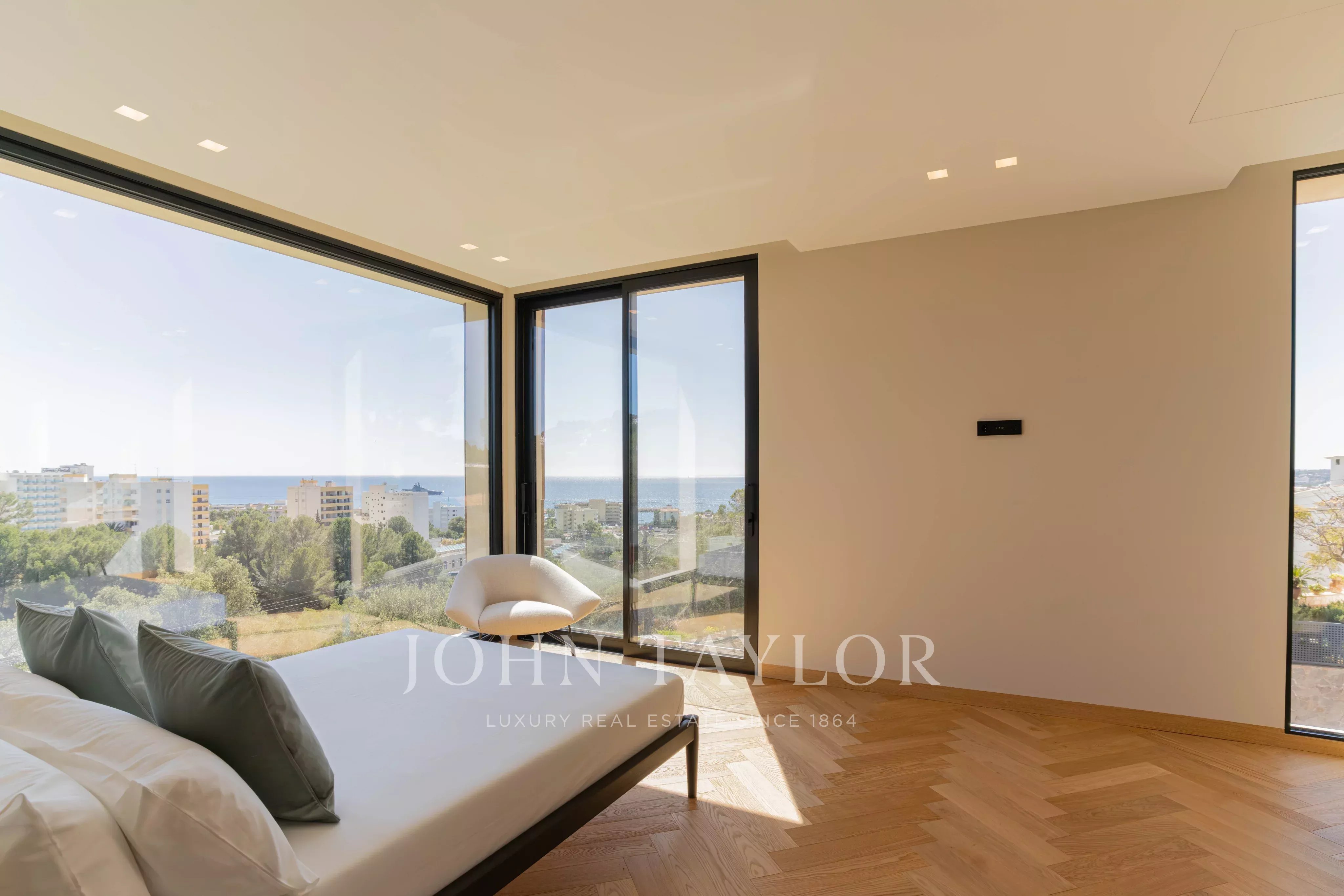 Im oberen Stockwerk befinden sich 3 Schlafzimmer mit en-suite Badezimmern. Alle haben Meerblick, aber das Hauptschlafzimmer hebt sich besonders durch den Panoramablick auf die Bucht von Palmanova hervor.