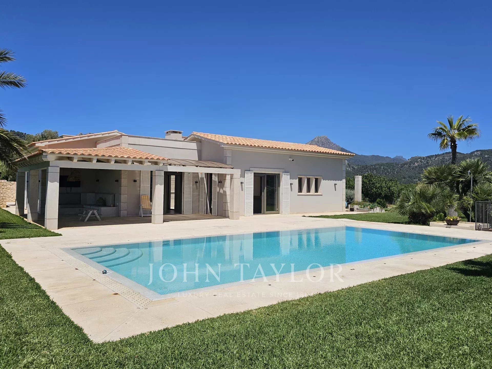 Eingebettet in einem weitläufigen, erhöhten Grundstück in der Nähe des Dorfes Es Capdellà, Calvià, bietet diese atemberaubende Villa auf dem Lande Ruhe, Privatsphäre und den Komfort der dörflichen Annehmlichkeiten nur einen kurzen Spaziergang entfernt. Dieses einstöckige Anwesen wurde sorgfältig mit hochwertigen Materialien gestaltet und verfügt über zwei Innenhöfe, die den Raum mit natürlichem Licht und einer kühlen Brise durchfluten. Die großen Gewölbedecken mit sichtbaren Balken verstärken das Gefühl von Geräumigkeit in den Wohnbereichen, während der atemberaubende 360-Grad-Blick auf die Berge und die Landschaft von jedem Zimmer aus genossen werden kann. Im Inneren befinden sich eine raffinierte Küche mit integrierten Geräten, fünf geräumige Schlafzimmer, darunter eine herrliche Master-Suite, und drei Bäder. Ein vielseitiger Multifunktionsraum im Untergeschoss kann als Fitnessraum, Spielzimmer, Personalwohnung oder Heimkino genutzt werden. Ein Highlight des Anwesens ist auch eine wunderschöne rustikale Scheune, die in ein Gästehaus umgewandelt wurde. Im Außenbereich ist das Anwesen von Gärten und verschiedenen Terrassen umgeben, einschließlich eines Grillplatzes, und verfügt über Obstbäume wie Oliven-, Mandel-, Orangen- und Zitronenbäume sowie einen luxuriösen Pool mit Liegewiese. Zu den weiteren Merkmalen gehören zwei private Brunnen, eine umschaltbare Klimaanlage, eine Fußbodenheizung (Wärmepumpe) und hochwertige Materialien und Oberflächen im gesamten Haus. Calvià liegt nur 20 Minuten von Palma und seinem Flughafen entfernt und bietet wunderschöne Strände, eine moderne Infrastruktur und eine charmante Altstadt, was es zu einem beliebten Ziel für Besucher und ausländische Einwohner macht. Mit einem milden und stabilen Klima, durchschnittlich 30 Grad im Sommer und 14 Grad im Winter und etwa 300 Sonnentagen im Jahr, bietet diese Immobilie eine außergewöhnliche Gelegenheit, das Beste des Landlebens mit einfachem Zugang zu städtischen Annehmlichkeiten zu genießen.