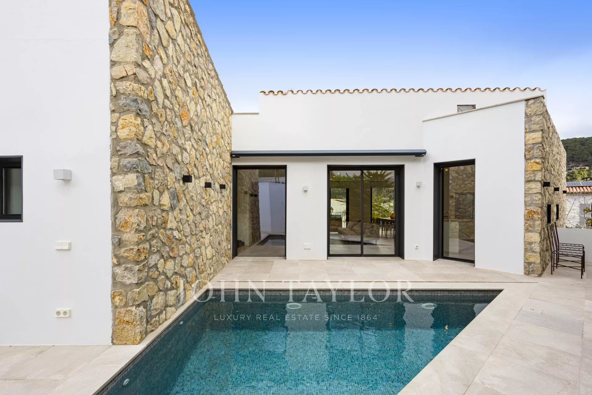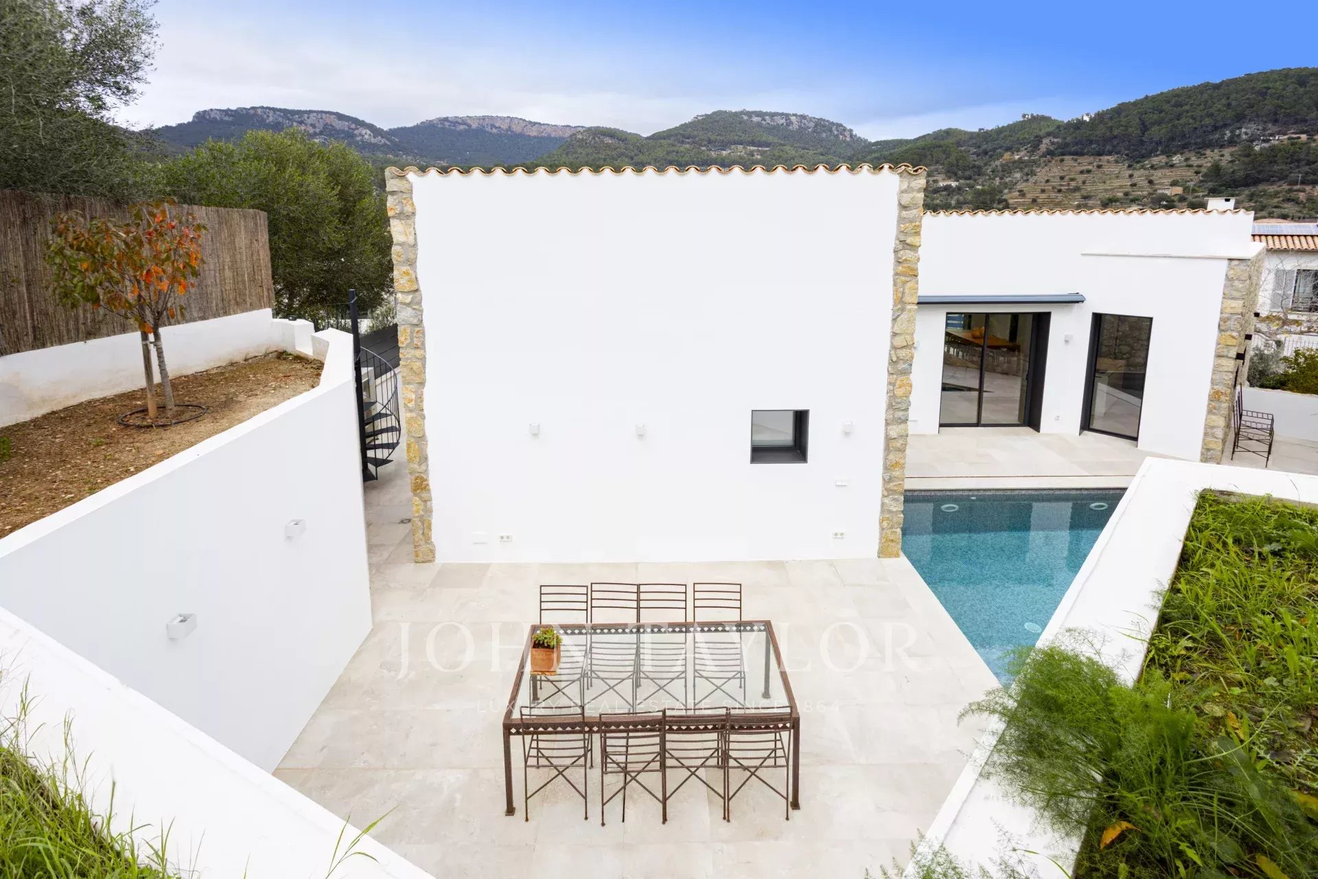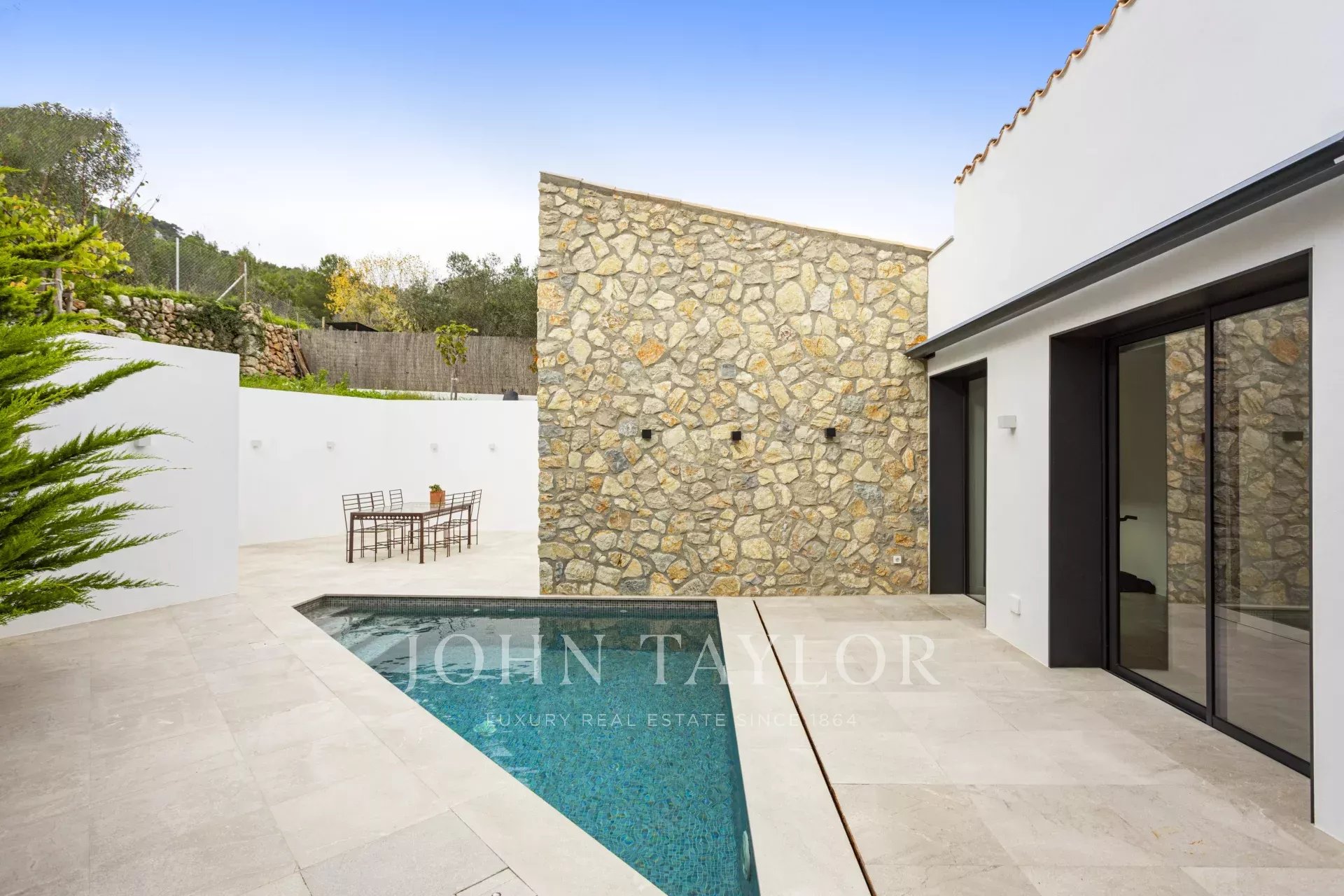 Das Haus verfügt über 3 Schlafzimmer, darunter zwei Doppelzimmer und ein Einzelzimmer, sowie zwei Vollbäder. Der geräumige Wohn-Essbereich mit integrierter Küche schafft einen offenen, hellen und einladenden Raum mit direktem Zugang zur Terrasse und dem Pool, wo Sie eine privilegierte Umgebung mit absoluter Privatsphäre und Panoramablick auf das Tramuntana-Gebirge genießen können.