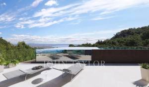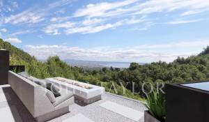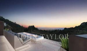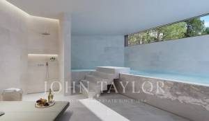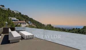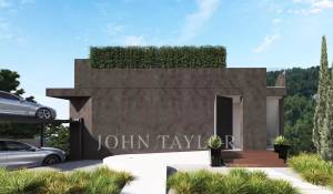 Gerade erst fertiggestellte Villa in kompromissloser Qualität und Stil. Das wegweisende Design und der Aufbau der Villa sind eine absolute Augenweide und Beispiel für zukünftige Häuser. Ein wahrer Trendsetter! Genießen Sie volle Privatsphäre in diesem außergewöhnlichen Objekt! Die massive Eingangstür führt Sie vom Straßenniveau in den obersten Wohnbereich, wo sich eine Chill-Out-Lounge, eine Bar und der fantastische Infinity-Pool mit Glaselement befinden. Hier genießt man den atemberaubenden Blick auf die Bucht von Palma. Diese Aussicht wird nur noch übertroffen von der Dachterrasse darüber, welche man über eine Außentreppe erreicht. Auch ein Aufzug steht im ganzen Haus zur Verfügung. Unter der Pool-Ebene befindet sich der Haupt-Wohnbereich:Dieser besteht aus einer weitläufigen, bestens ausgestatteten, offenen Küche mit Essbereich und Wohnzimmer, mit nahtlosem Übergang zu der großzügigen, teils überdachten Terrasse." Die Ebene darunter weist vier Schlafzimmer auf, welche sich zu zweit je ein en suite Badezimmer teilen. Hier befindet sich auch ein großer Weinkeller. Die Master Suite belegt die gesamte Erdgeschoss-Ebene mit überdimensioniertem Ankleideraum, offenem Bad, Sauna und direktem Gartenzugang, wo ein Jacuzzi Sie erwartet. Ein beheizter Innenpool mit Spa und Fitnessraum befindet sich in der untersten Ebene. Vielen technischen Ausstattungen, wie z.B. der Luftumwälzung, liegt ein Design aus der Luftfahrtindustrie zu Grunde (der Developer stammt aus diesem Bereich) und auch die restlichen Features sind überaus zukunftsorientiert und auf dem letzten Stand der Technik. Das Ergebnis: Energie-sparender und schlicht einzigartiger Komfort!