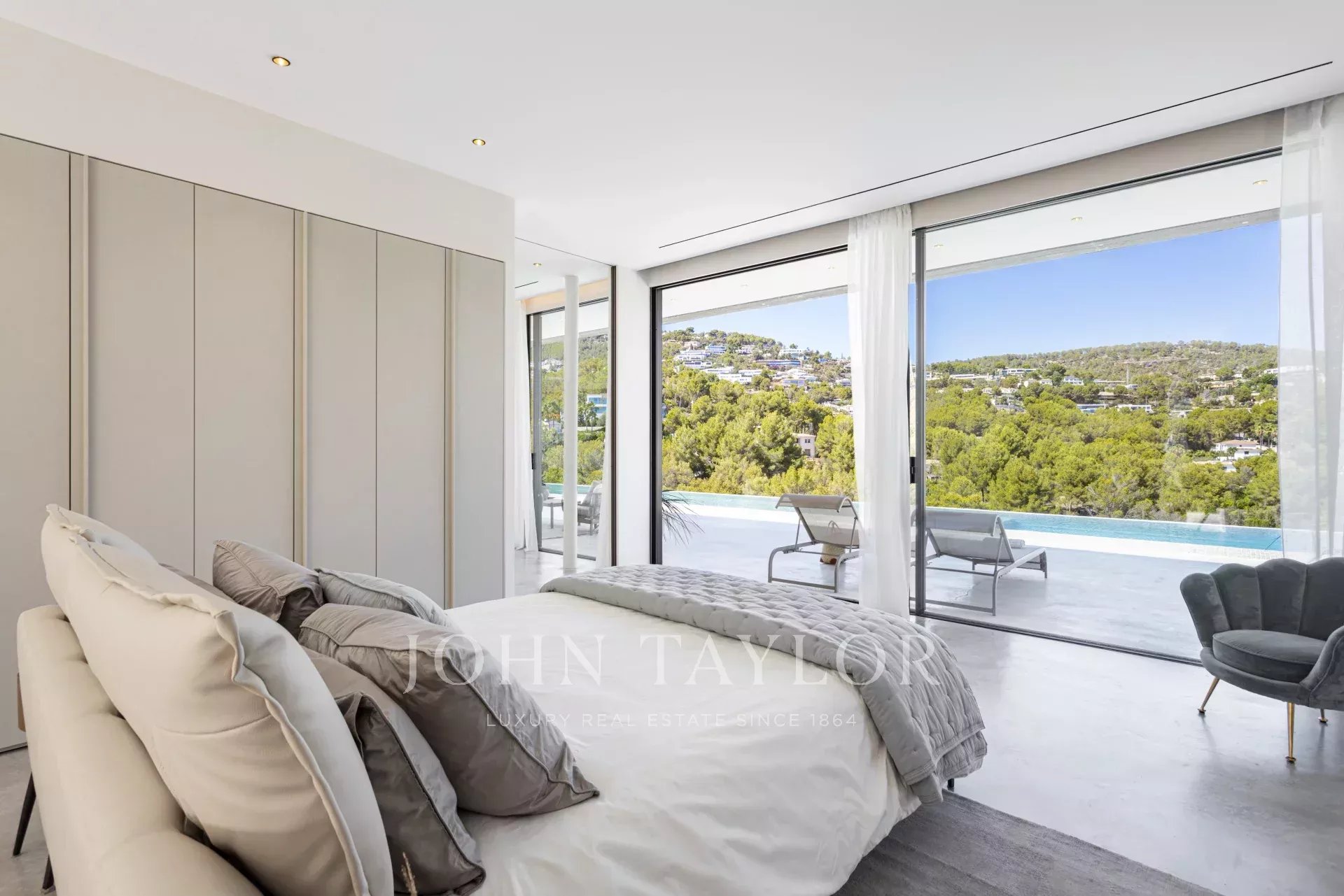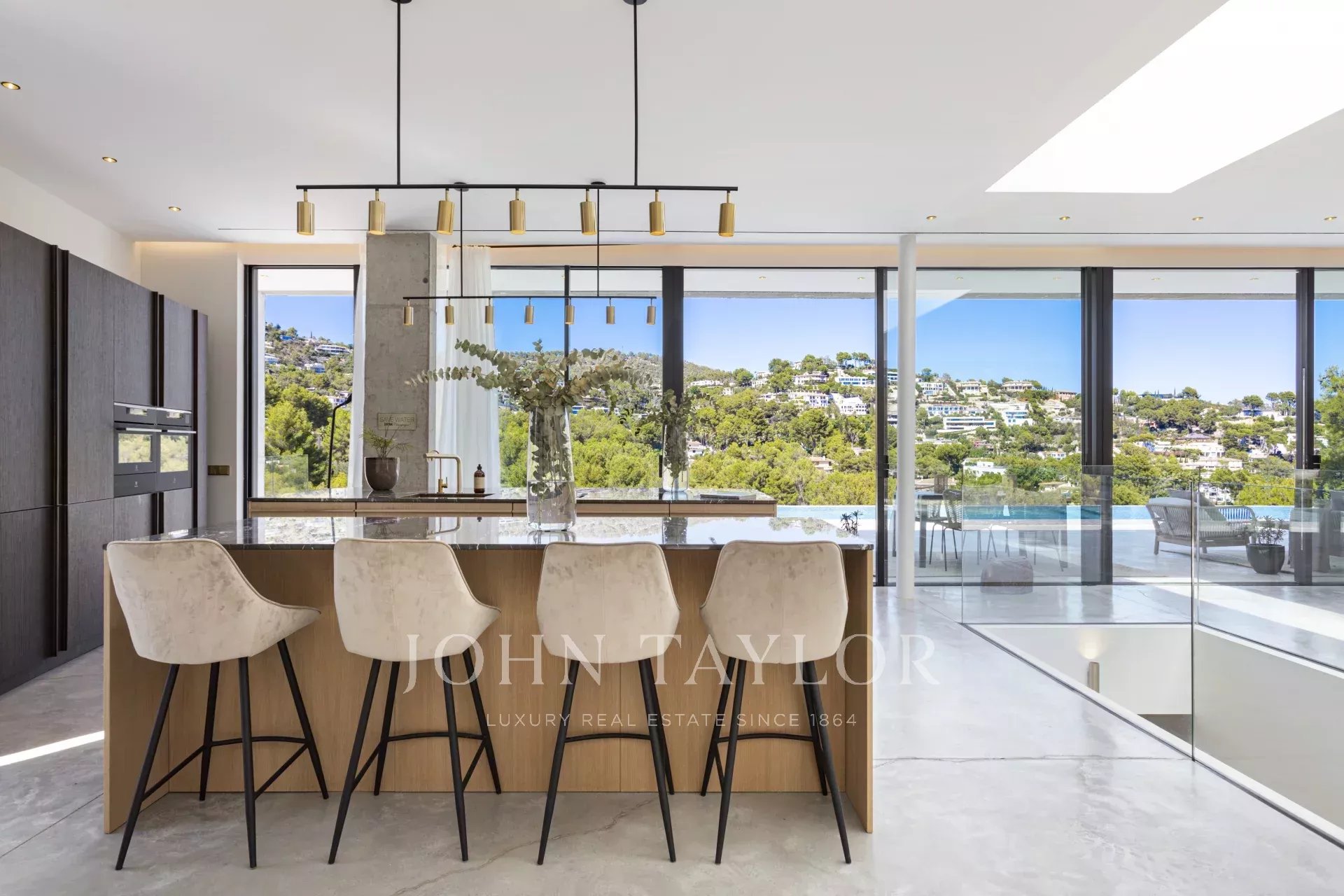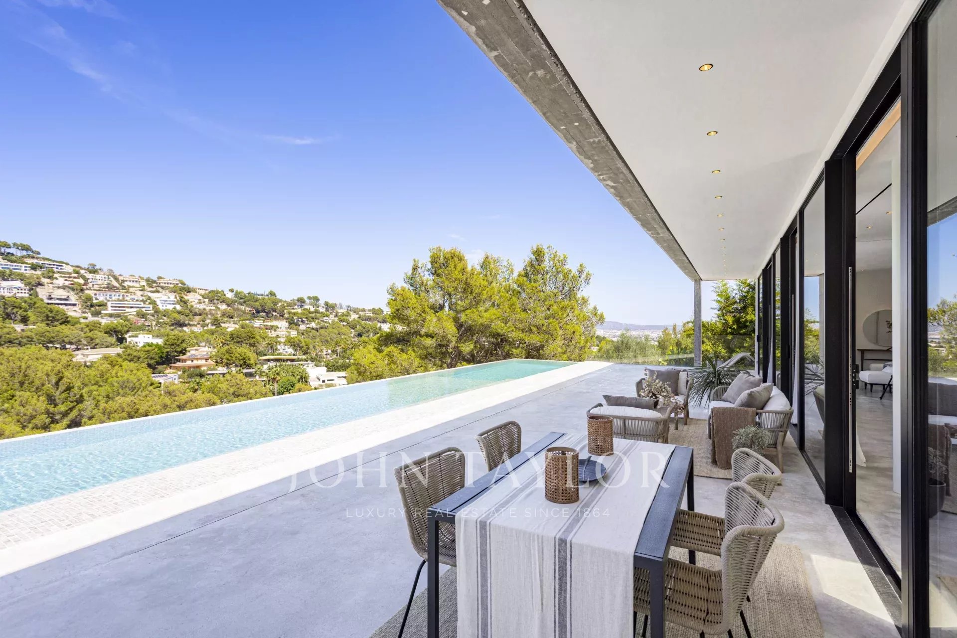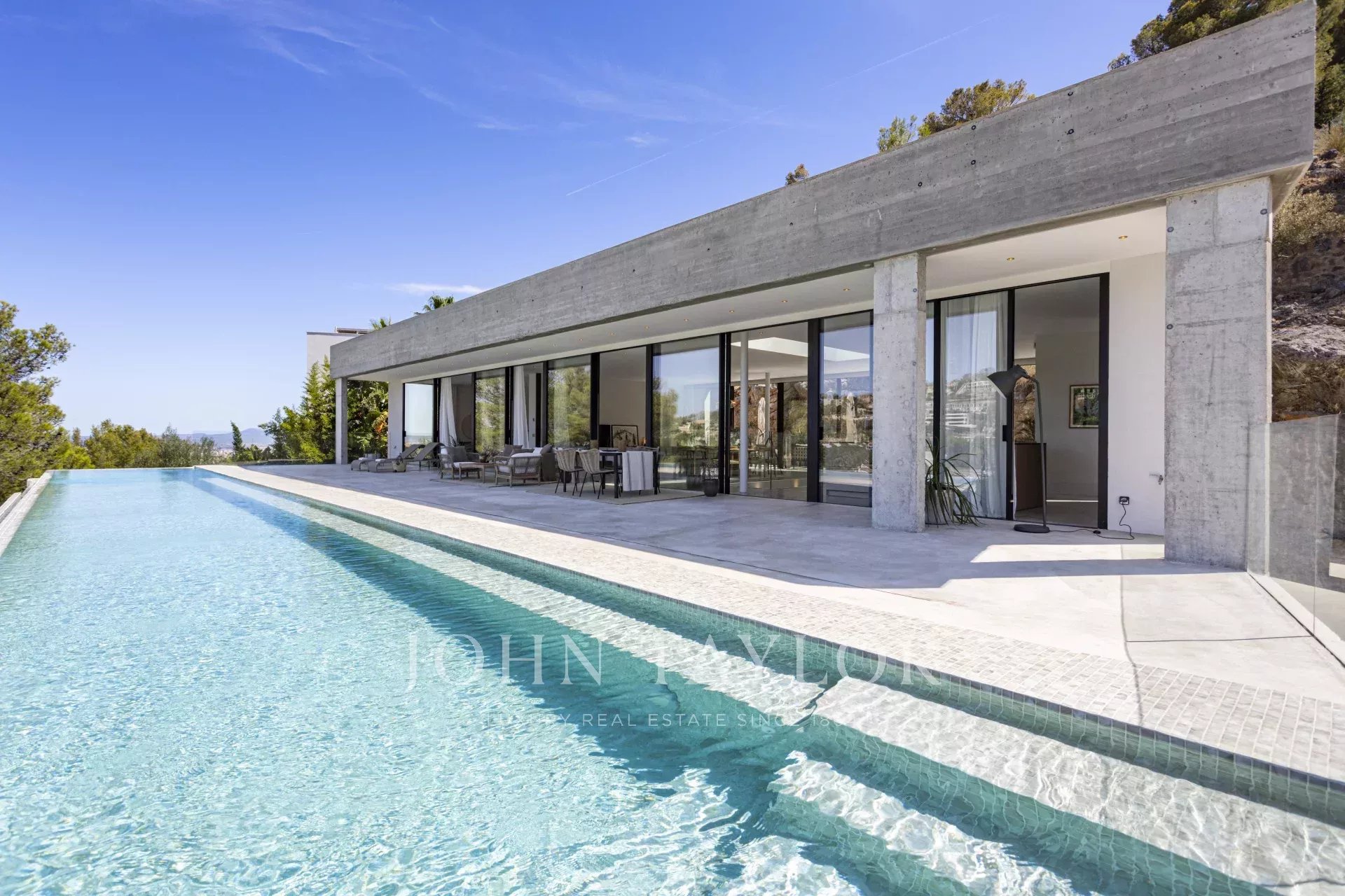 Spektakuläre neu gebaute Villa in der exklusiven Gegend von Son Vida. Mit einem markanten architektonischen Design in Sichtbeton, bietet diese zweistöckige Immobilie eine geräumige Wohnfläche von 455 m2, mit der spannenden Möglichkeit, eine weitere 383 m2 hinzuzufügen. Eine Oase der Ruhe und des Luxus auf einem 2.635 m2 großen Grundstück mit herrlichem Blick auf den Golfplatz, die Stadt Palma und das Mittelmeer. Das Design dieser Villa ist das Ergebnis einer perfekten Verschmelzung von moderner Eleganz, Komfort und Funktion. Der Sichtbeton sorgt für eine einzigartige und kühne Ästhetik und unterstreicht die avantgardistische Persönlichkeit der Immobilie. Die bodentiefen Fenster und die offenen Räume garantieren eine Fülle von natürlichem Licht und schaffen eine helle und einladende Atmosphäre in jeder Ecke des Hauses. Der Außenbereich ist einfach atemberaubend. Genießen Sie Momente der Entspannung und Freizeit auf der 68 m2 großen Veranda, die ideal für gesellige Zusammenkünfte oder um die warmen mallorquinischen Nächte zu genießen ist. Die 120 m2 große Terrasse bietet den perfekten Platz zum Sonnenbaden und Genießen des Panoramablicks, den das Anwesen zu bieten hat. Der 28 Meter lange Swimmingpool ist ein wahres Schmuckstück und lädt zu einem erfrischenden Bad ein, während man die Schönheit der Umgebung genießt. Mit viel Privatsphäre wird dieser Bereich des Anwesens zu einer Oase, in der Sie sich entspannen und unvergessliche Momente genießen können. Darüber hinaus verfügt diese Villa über einen Spa-Bereich, in dem Sie sich mit verschiedenen Entspannungs- und Wellness-Angeboten verwöhnen lassen können. Die Innenaufteilung wurde sorgfältig durchdacht, um einen funktionalen und komfortablen Raum zu bieten. Mit vier geräumigen Schlafzimmern, jedes mit eigenem Bad, bietet die Villa eine intime und angenehme Umgebung für ihre Bewohner. Die Master-Suite schafft eine traumhafte Umgebung zum Entspannen und Genießen der Privatsphäre. Die Gemeinschaftsräume stehen dem in nichts nach. Das Wohnzimmer und das Esszimmer gehen nahtlos ineinander über und schaffen einen gemütlichen und großzügigen Raum, um Momente mit der Familie oder Freunden zu teilen. Die modern gestaltete und mit den neuesten Annehmlichkeiten ausgestattete Küche ist der perfekte Ort, um Ihrer kulinarischen Kreativität freien Lauf zu lassen. Kurzum, diese neu gebaute Villa in Son Vida ist ein wahres Meisterwerk der modernen Architektur, das atemberaubendes Design mit dem Komfort eines Zuhauses verbindet.