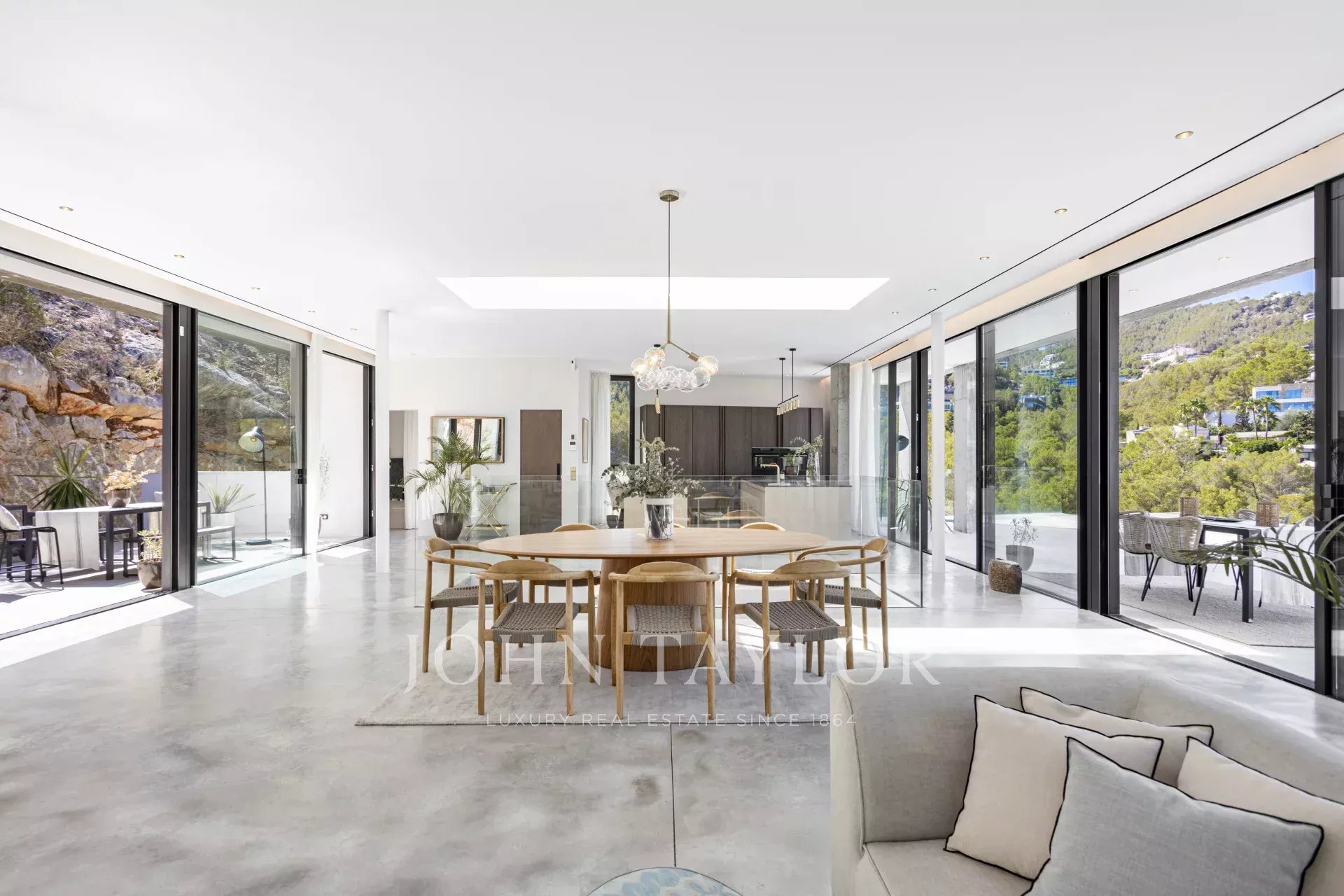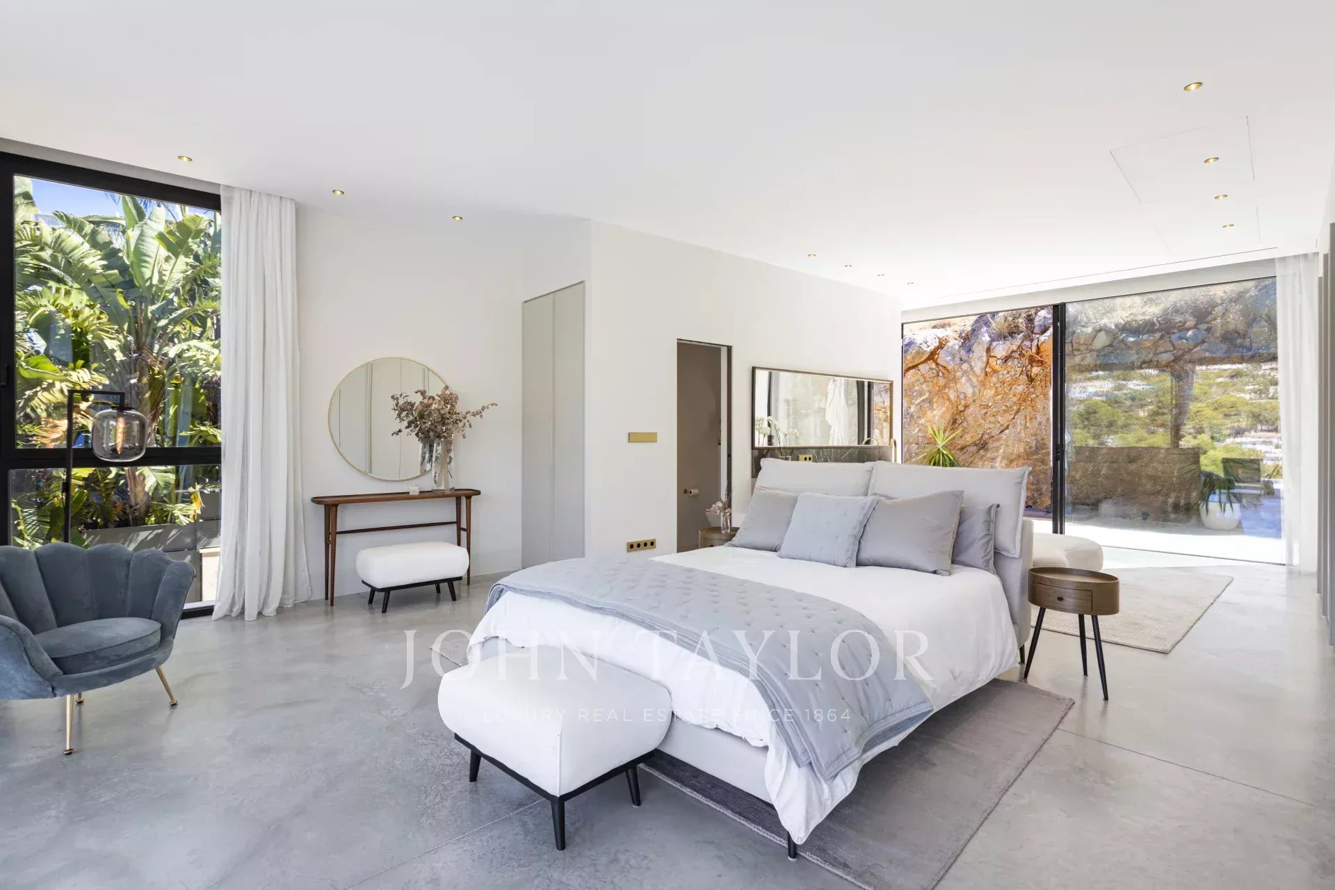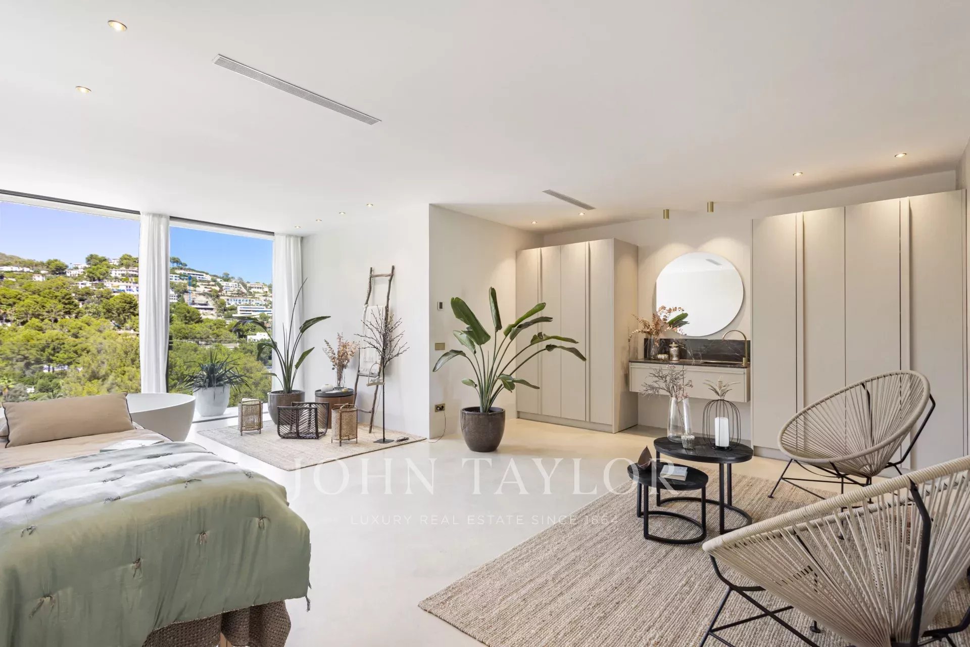 Spektakuläre neu gebaute Villa in der exklusiven Gegend von Son Vida. Mit einem markanten architektonischen Design in Sichtbeton, bietet diese zweistöckige Immobilie eine geräumige Wohnfläche von 455 m2, mit der spannenden Möglichkeit, eine weitere 383 m2 hinzuzufügen. Eine Oase der Ruhe und des Luxus auf einem 2.635 m2 großen Grundstück mit herrlichem Blick auf den Golfplatz, die Stadt Palma und das Mittelmeer. Das Design dieser Villa ist das Ergebnis einer perfekten Verschmelzung von moderner Eleganz, Komfort und Funktion. Der Sichtbeton sorgt für eine einzigartige und kühne Ästhetik und unterstreicht die avantgardistische Persönlichkeit der Immobilie. Die bodentiefen Fenster und die offenen Räume garantieren eine Fülle von natürlichem Licht und schaffen eine helle und einladende Atmosphäre in jeder Ecke des Hauses. Der Außenbereich ist einfach atemberaubend. Genießen Sie Momente der Entspannung und Freizeit auf der 68 m2 großen Veranda, die ideal für gesellige Zusammenkünfte oder um die warmen mallorquinischen Nächte zu genießen ist. Die 120 m2 große Terrasse bietet den perfekten Platz zum Sonnenbaden und Genießen des Panoramablicks, den das Anwesen zu bieten hat. Der 28 Meter lange Swimmingpool ist ein wahres Schmuckstück und lädt zu einem erfrischenden Bad ein, während man die Schönheit der Umgebung genießt. Mit viel Privatsphäre wird dieser Bereich des Anwesens zu einer Oase, in der Sie sich entspannen und unvergessliche Momente genießen können. Darüber hinaus verfügt diese Villa über einen Spa-Bereich, in dem Sie sich mit verschiedenen Entspannungs- und Wellness-Angeboten verwöhnen lassen können. Die Innenaufteilung wurde sorgfältig durchdacht, um einen funktionalen und komfortablen Raum zu bieten. Mit vier geräumigen Schlafzimmern, jedes mit eigenem Bad, bietet die Villa eine intime und angenehme Umgebung für ihre Bewohner. Die Master-Suite schafft eine traumhafte Umgebung zum Entspannen und Genießen der Privatsphäre. Die Gemeinschaftsräume stehen dem in nichts nach. Das Wohnzimmer und das Esszimmer gehen nahtlos ineinander über und schaffen einen gemütlichen und großzügigen Raum, um Momente mit der Familie oder Freunden zu teilen. Die modern gestaltete und mit den neuesten Annehmlichkeiten ausgestattete Küche ist der perfekte Ort, um Ihrer kulinarischen Kreativität freien Lauf zu lassen. Kurzum, diese neu gebaute Villa in Son Vida ist ein wahres Meisterwerk der modernen Architektur, das atemberaubendes Design mit dem Komfort eines Zuhauses verbindet.