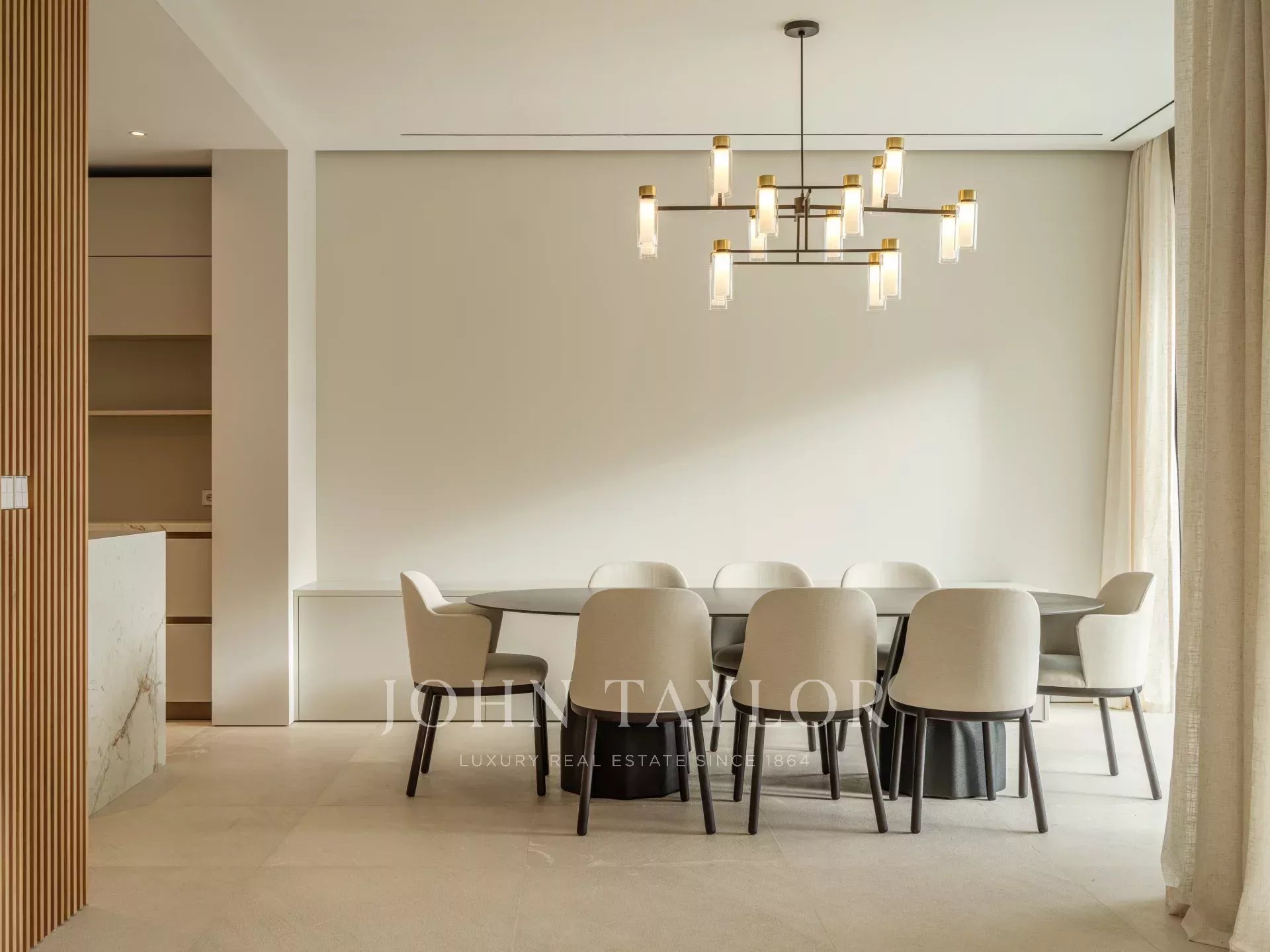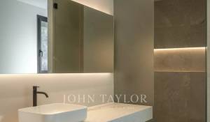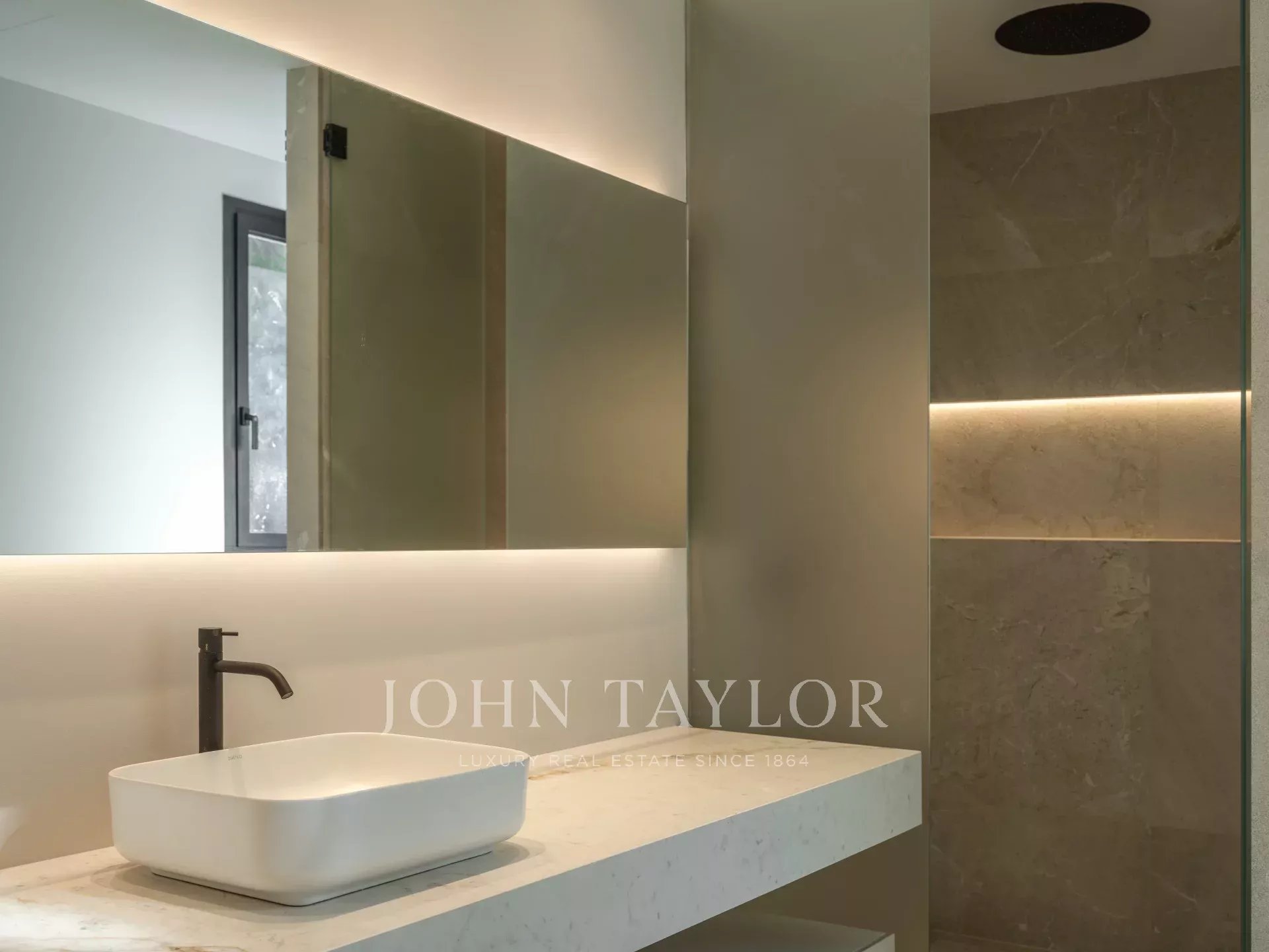Diese luxuriöse Neubauvilla wurde in exklusiver Lage in Son Vida gebaut. Das Anwesen bietet insgesamt 653m2 bebaute und 353m2 nutzbare Wohnfläche verteilt auf einen großzügigen Wohn- und Essbereich mit Kamin und voll ausgestatteter Küche, sowie ein Schlafzimmer mit Bad en suite, Gäste-WC und Waschküche. Vom Wohnzimmer aus gelangt man in den Außenbereich mit mehreren Terrassen und dem Infinity-Pool. Im ersten Stock befinden sich 2 weitere Schlafzimmer mit Badezimmern en suite und die luxuriöse Master-Suite mit eigener Terrasse. Alle diese Schlafzimmer verfügen über einen eigenen Außenbereich, der die Möglichkeit bietet, das schöne mediterrane Klima zu genießen. Ein weiteres Highlight ist die Dachterrasse, die ausreichend Platz für eine Außenküche, einen großen Esstisch und einen Loungebereich bietet. Im Untergeschoss befinden sich neben einem weiteren Gästeschlafzimmer mit Bad en suite eine 100m2 große Garage, ein Wartungsraum und ein Abstellraum.