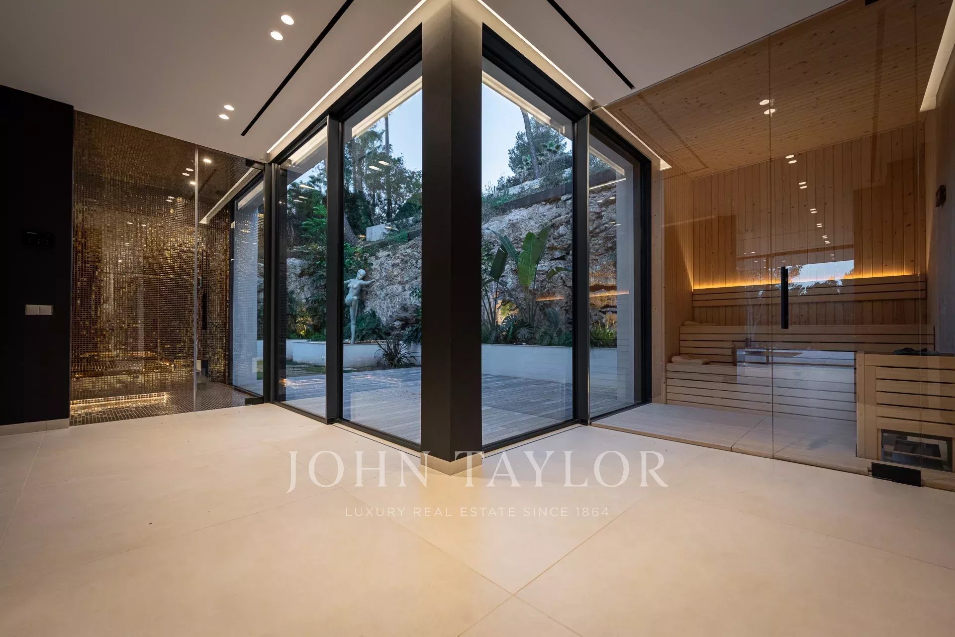 Im Erdgeschoss finden Sie eine beeindruckende Eingangshalle, ein privates Büro und ein Gäste-WC. Das Haus verfügt über zwei Küchen - eine Showküche und eine Serviceküche - die nahtlos in den Essbereich im Freien und das geräumige Wohn-Esszimmer übergehen, das durch einen gemütlichen TV-Bereich ergänzt wird. Auf dieser Ebene befinden sich auch ein Gästeschlafzimmer mit eigenem Bad, eine Waschküche und ein hochmoderner Fitness- und Wellnessbereich mit Nass- und Trockensauna, direktem Zugang zum Außenbereich und einem kompletten Bad.
