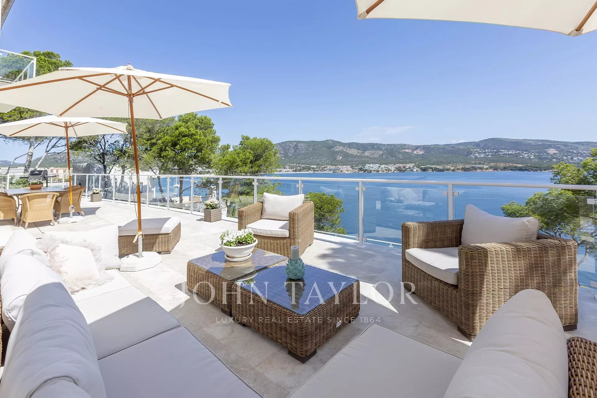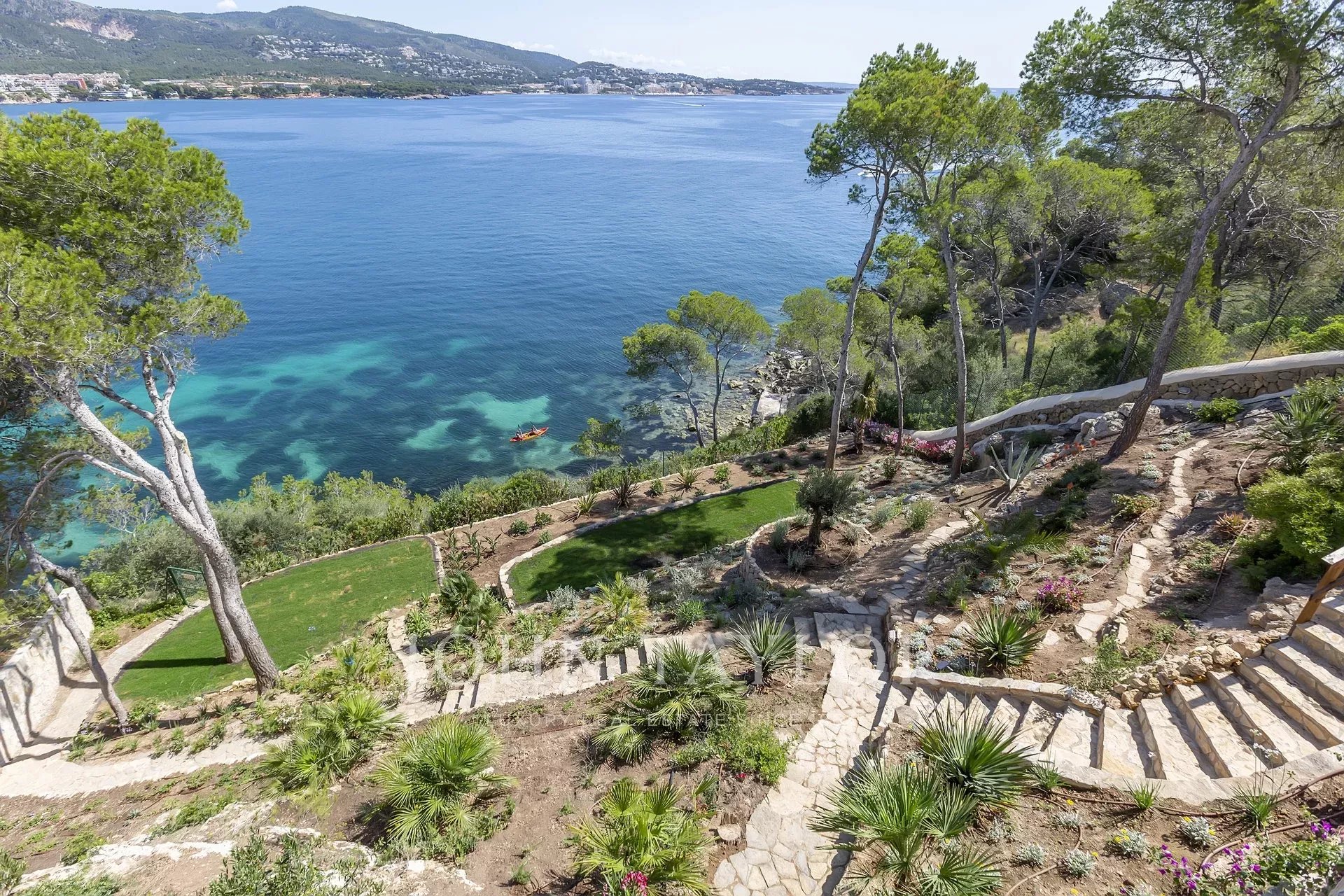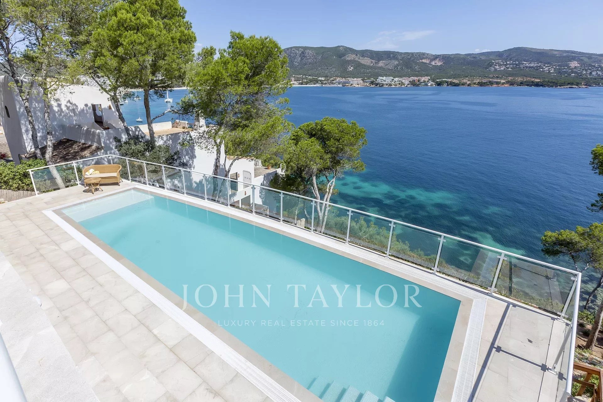 Luxusvilla mit direktem Zugang zum Meer in Palmanova. Diese komplett renovierte Villa aus dem Jahr 2020 befindet sich direkt am Meer in Palmanova und verfügt über einen komfortablen privaten Zugang zum Meer um zu jeder Tageszeit ein Bad zu genießen. Die Aussichten sind nicht nur tagsüber spektakulär, wenn Sie die vorbeifahrenden Schiffe sehen können, sondern auch nachts, wenn die gesamte Küste rund um die Bucht beleuchtet ist. Das Haus erstreckt sich über 2 Etagen und bietet einen großen Flur, ein Wohnzimmer mit Küche mit Zugang zur Terrasse, 4 Schlafzimmer und 4 Badezimmer. Im Untergeschoss befindet sich ein völlig unabhängiges Gästeapartment und es gibt genügend Platz für ein Fitnessstudio, einen Kinoraum, einen Wellnessbereich usw. Ein wunderschöner Pool und eine Garage vervollständigen diese wundervolle Immobilie in ruhiger Lage mit viel Privatsphäre neben einer Grünfläche.
