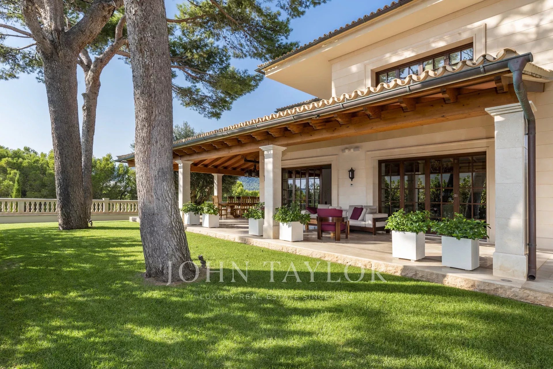 Im Keller gibt es eine Garage für 3 Autos und eine Sauna für 4 Personen. Im Erdgeschoss befindet sich das Wohnzimmer, das von der Küche und dem Wohnzimmer getrennte Esszimmer, das Wohnzimmer mit Kamin, die Küche, die Waschküche, eine Terrasse zum Frühstücken, eine große überdachte Terrasse, die von der frischen Meeresbrise belüftet wird, 2 Schlafzimmer mit Badezimmern und ein Gästetoilette. Im ersten Stock befinden sich 4 Schlafzimmer mit Badezimmern, ein Spielzimmer und 3 weitere Terrassen mit weitem Blick auf das Meer und das Tramuntana Gebirge.