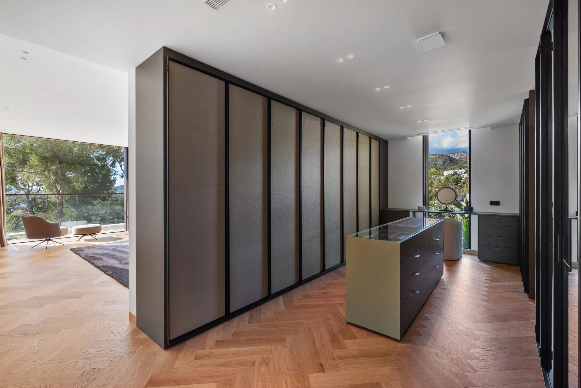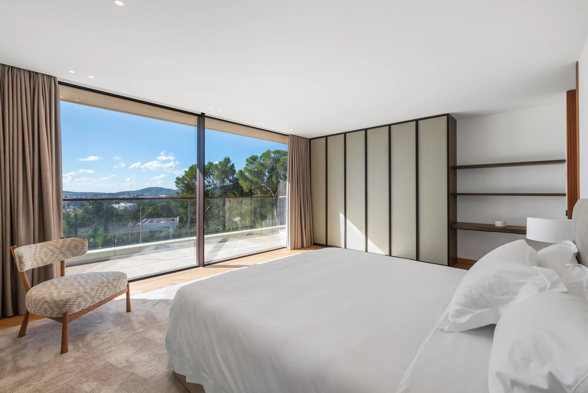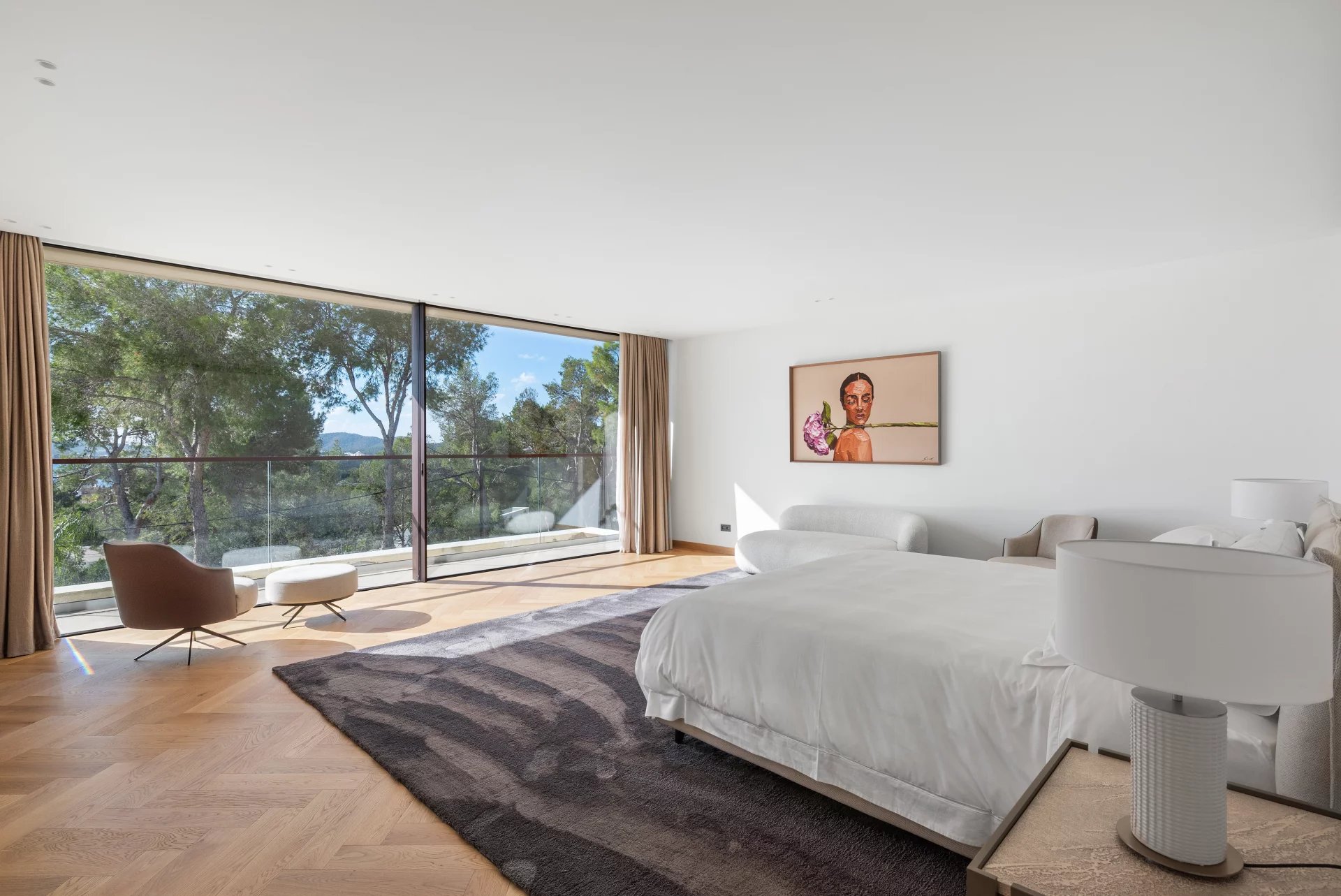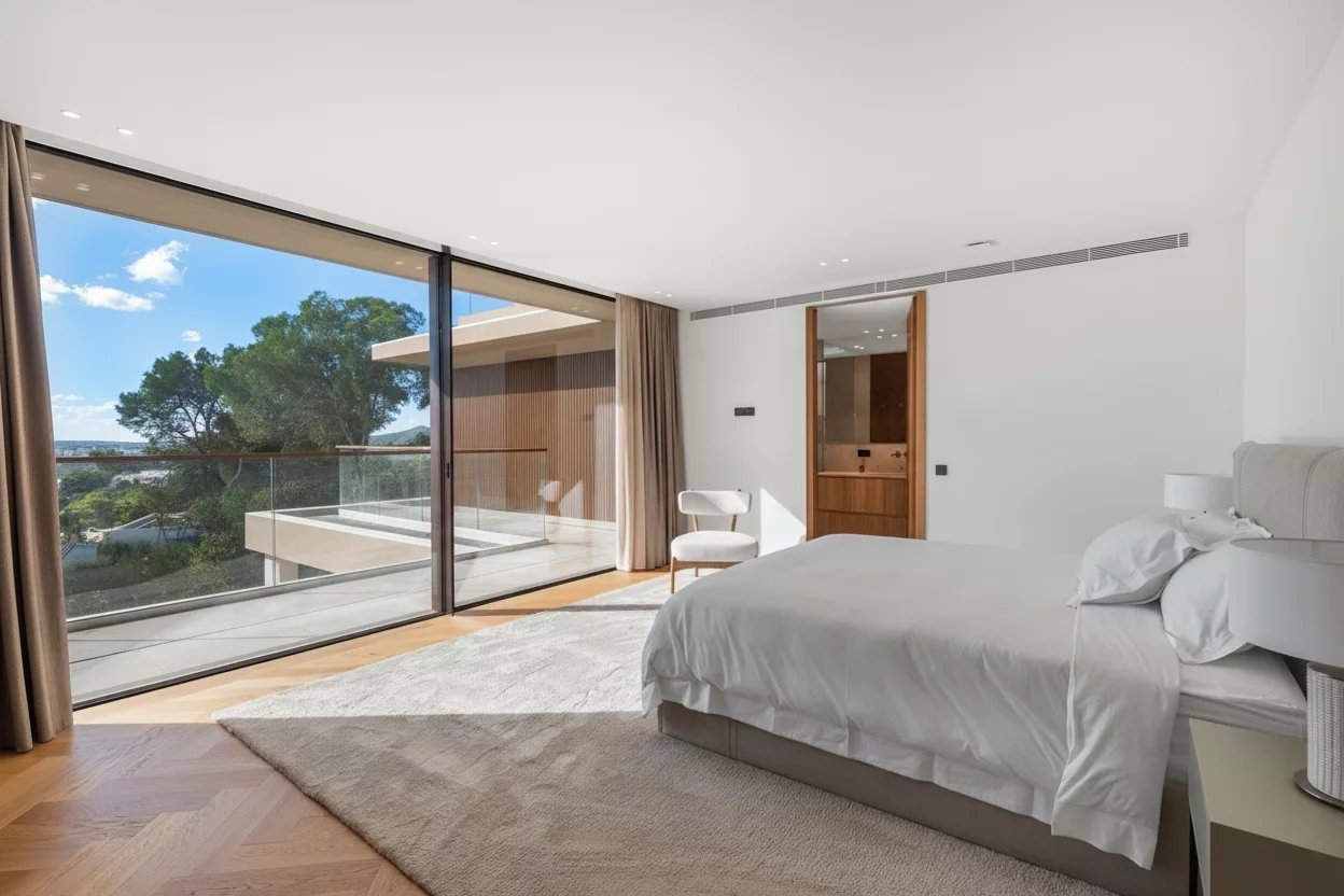 Stellen Sie sich vor, Sie wachen in einem der vier Schlafzimmer in der obersten Etage auf und haben einen ungehinderten Panoramablick auf das Meer, der sich bis zum Horizont erstreckt und durch die Südausrichtung in natürliches Licht getaucht wird. Im Erdgeschoss befindet sich ein spezielles Schlafzimmer mit direktem Zugang zu einer privaten Terrasse, ideal für Momente der Besinnung oder ein Frühstück bei Sonnenaufgang, während im unteren Stockwerk zwei weitere Suiten mit eigenem Bad untergebracht sind, ideal für Gäste, die absolute Unabhängigkeit suchen. Die Aufteilung wurde von einem Team von Designexperten sorgfältig geplant, wobei der fließende Raum, die lichtdurchflutete Geräumigkeit und die tadellose Privatsphäre im Vordergrund standen, was diese Villa zu einem persönlichen Rückzugsort inmitten des mallorquinischen Glamours macht.