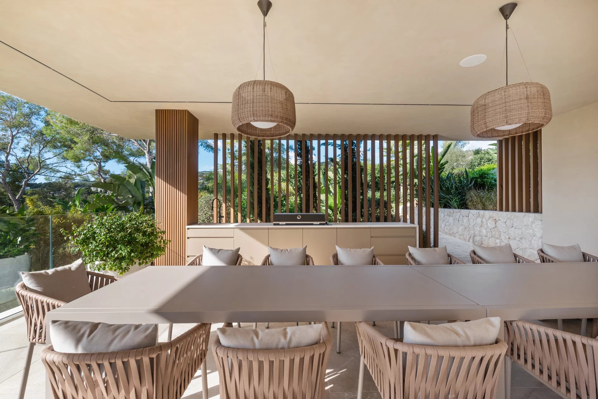 Zur Innenausstattung gehört eine geräumige Garage für bis zu sechs Fahrzeuge, die durch einen praktischen und diskreten Aufzug elegant mit allen Etagen verbunden ist. Ein vielseitiger Fitnessraum - oder ein Kino- und Fernsehraum für entspannte Abende - und eine verjüngende Sauna ergänzen das tägliche Wohlbefinden und ermöglichen einen ausgewogenen und gesunden Lebensstil. Im Außenbereich umgibt ein üppiger mediterraner Garten mit tadellos gepflegten Rasenflächen und einheimischer Flora das Anwesen mit einer Aura des natürlichen Friedens. Die Hauptterrasse, geräumig und einladend, wird zum Mittelpunkt des gesellschaftlichen Lebens mit einem großen Esstisch im Freien, weichen Sofas für abendliche Zusammenkünfte und einer professionellen Sommerküche mit Grill, wo Sie unvergessliche Mahlzeiten unter der mallorquinischen Sonne zubereiten können.