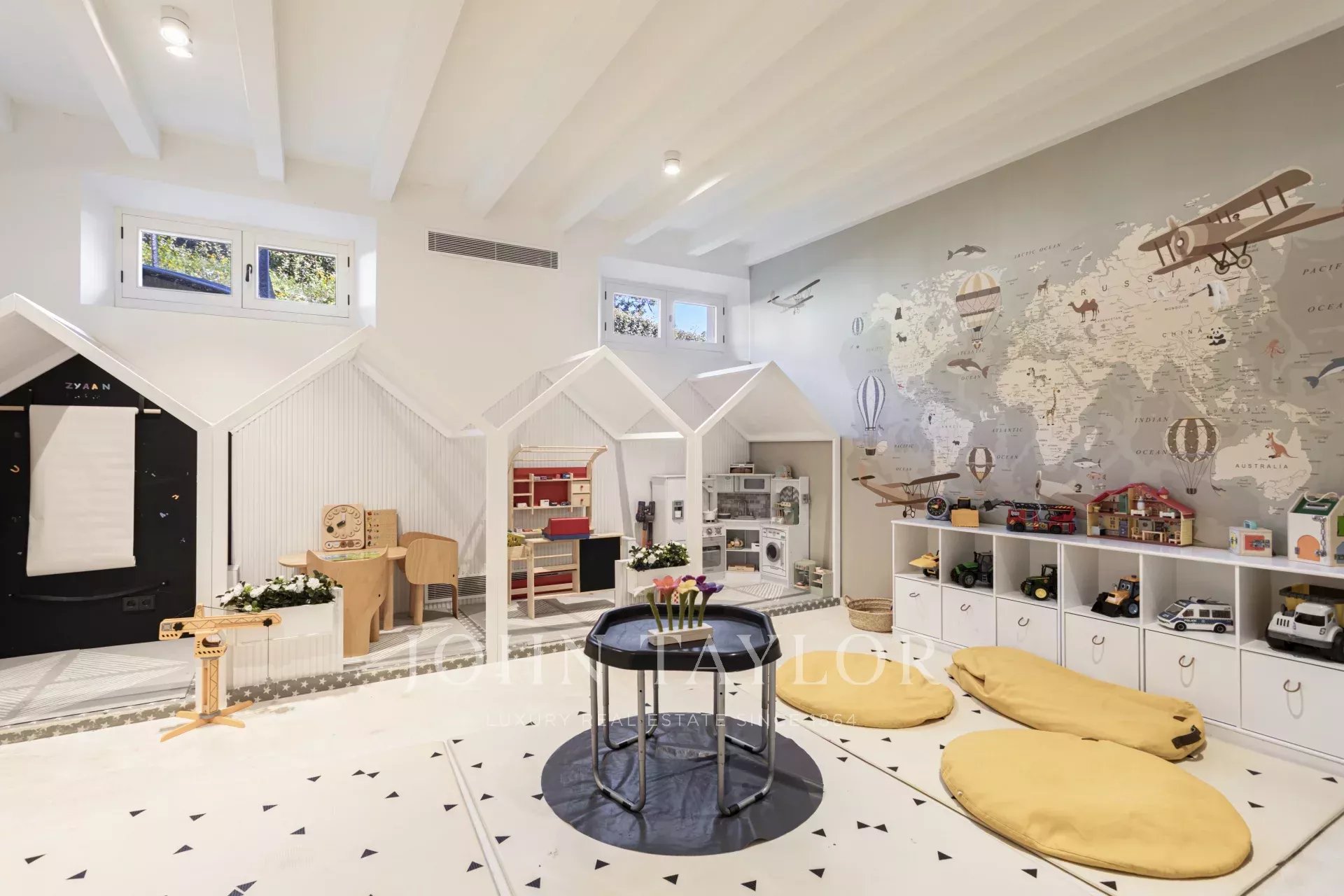 Es bietet 580 m² Wohnfläche, die sich auf drei Etagen verteilen. Die Hauptebene ist dem Sozial-/Arbeitsbereich gewidmet, die erste Etage der Ruhe und Erholung und die untere Etage dem Vergnügen und den Versorgungseinrichtungen. Ein beheiztes Schwimmbad, ein voll ausgestatteter Fitnessraum, eine entspannende Sauna und ein großes, geräumiges Heimkino decken die Wellness-Bedürfnisse ab.