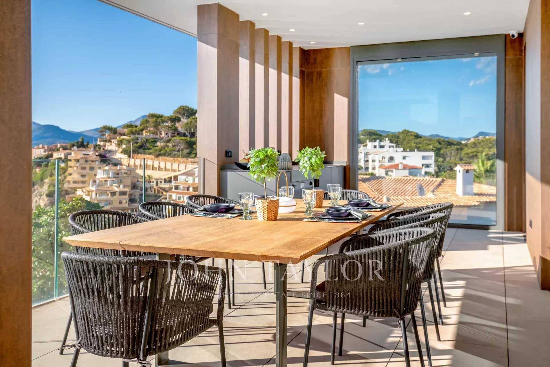 In Santa Ponsa erwartet Sie eine hochmoderne Neubauvilla mit einem atemberaubenden Meerblick, deren Fertigstellung im Juni 2023 erfolgreich abgeschlossen wurde. Diese luxuriöse Residenz befindet sich nur wenige Meter vom Meer entfernt und liegt in der zweiten Reihe. In unmittelbarer Nähe befindet sich eine malerische Bucht, die zum Schwimmen und Tauchen zwischen den Felsen einlädt. Die Villa erstreckt sich über drei Etagen und ist bequem mit einem Aufzug zugänglich.