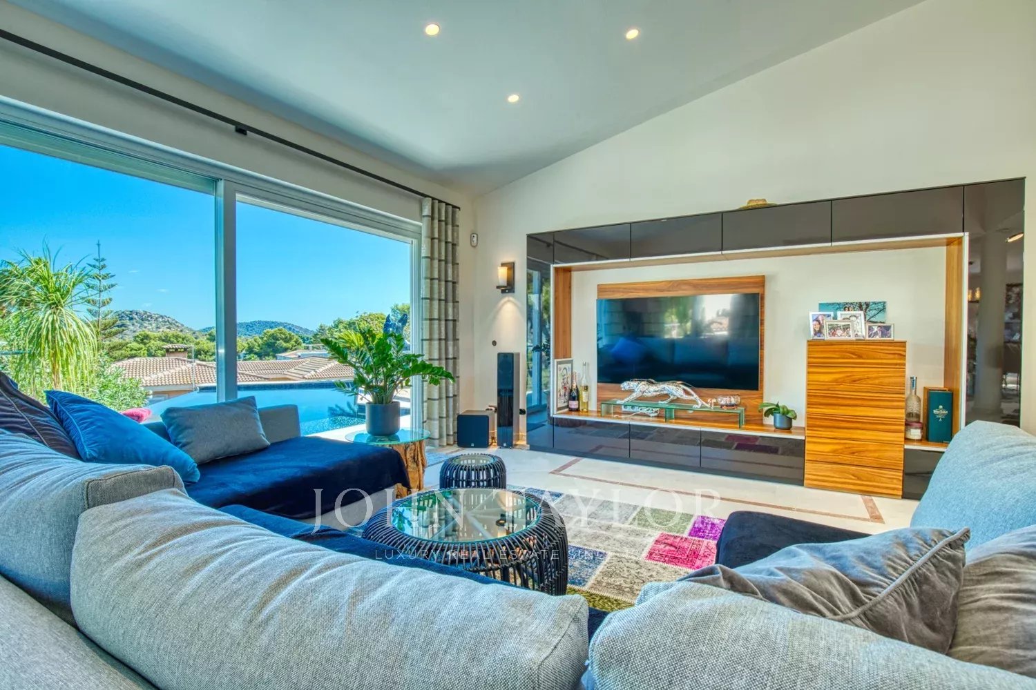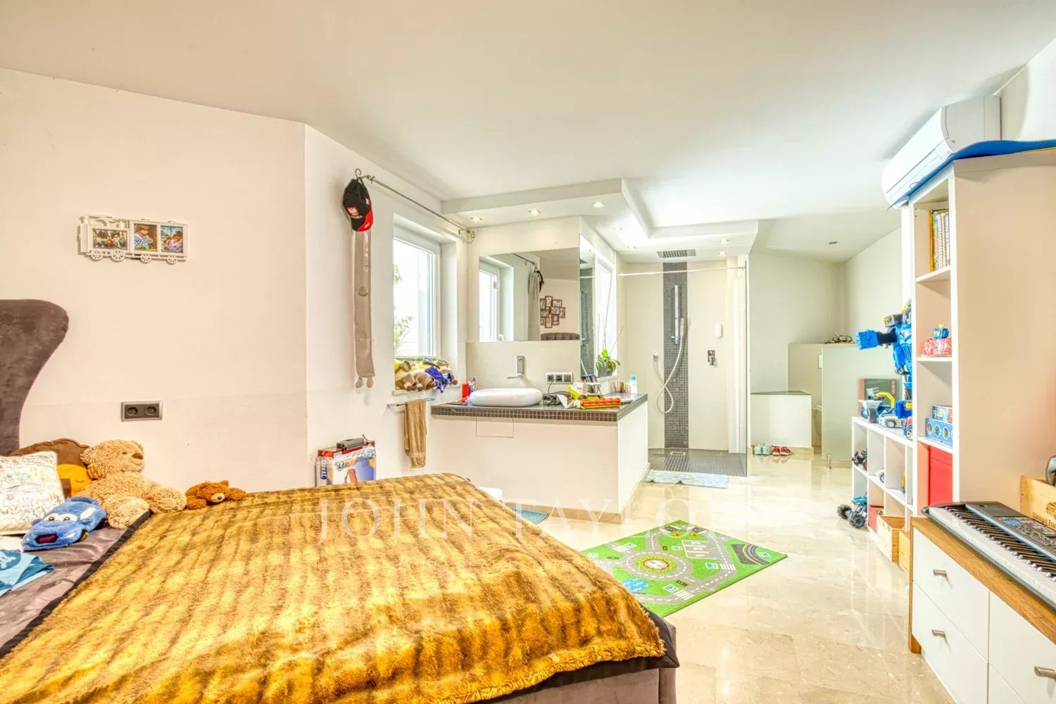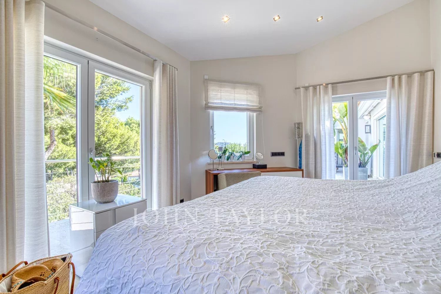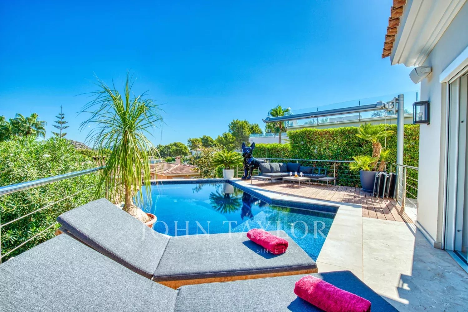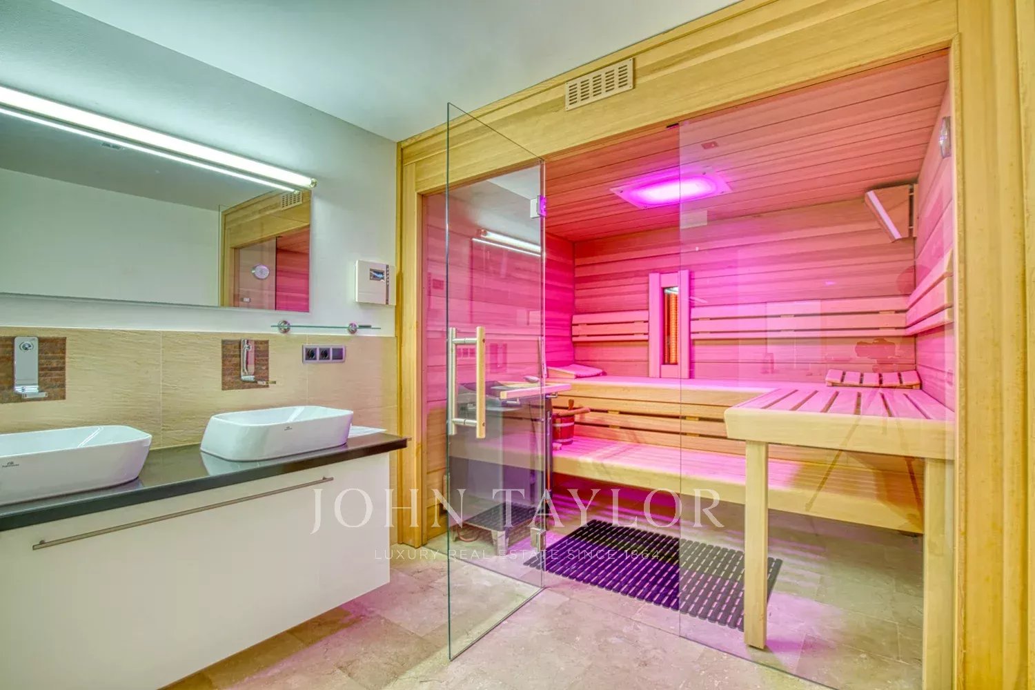 Diese attraktive Familienvilla mit Meerblick wurde Anfang 2017 nach den neuesten Baustandards mit hochwertigen Materialien renoviert. Es befindet sich in einer der besten und exklusivsten Wohngegenden in La Ensaimada. Auf der Eingangsebene befindet sich ein großes Wohn-Esszimmer mit offener Luxusküche der Marke Leicht mit Gaggenau und Miele-Geräten, angrenzend an eine Speisekammer und eine zweite Küche. Vom Wohnzimmer aus gelangt man im Erdgeschoss auf die große Terrasse mit Meerblick und den beheizten Swimmingpool. Außerdem befinden sich auf dieser Ebene ein Hauptschlafzimmer mit Bad und Ankleidezimmer, ein Abstellraum sowie ein Arbeitszimmer und ein Gäste-WC. Die untere Etage verfügt über 2 weitere Doppelschlafzimmer mit Bädern en suite, ein weiteres Badezimmer und einen Fitnessraum mit Sauna, der in ein viertes Schlafzimmer umgewandelt werden kann, sowie eine 38 m2 große Garage, die vom Haus aus zugänglich ist. Weitere Ausstattungsmerkmale sind: Klimaanlage w/k, Fußbodenheizung mit Wärmepumpe, doppelt verglaste Aluminiumfenster, Rollläden, computergesteuerte Hausanlage, Alarm- und Gegensprechanlage, Osmoseanlage, Entkalkungsanlage sowie Internet.