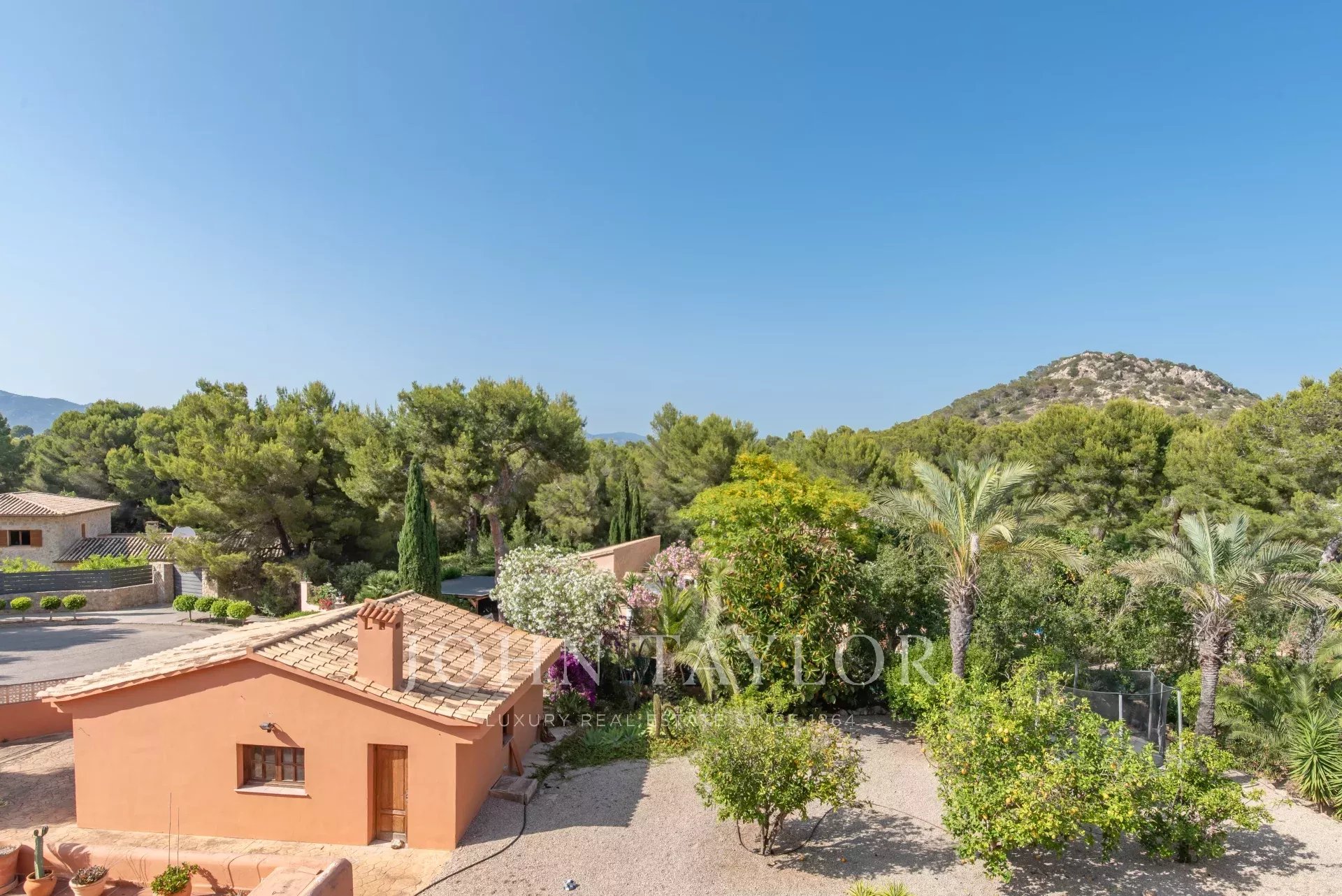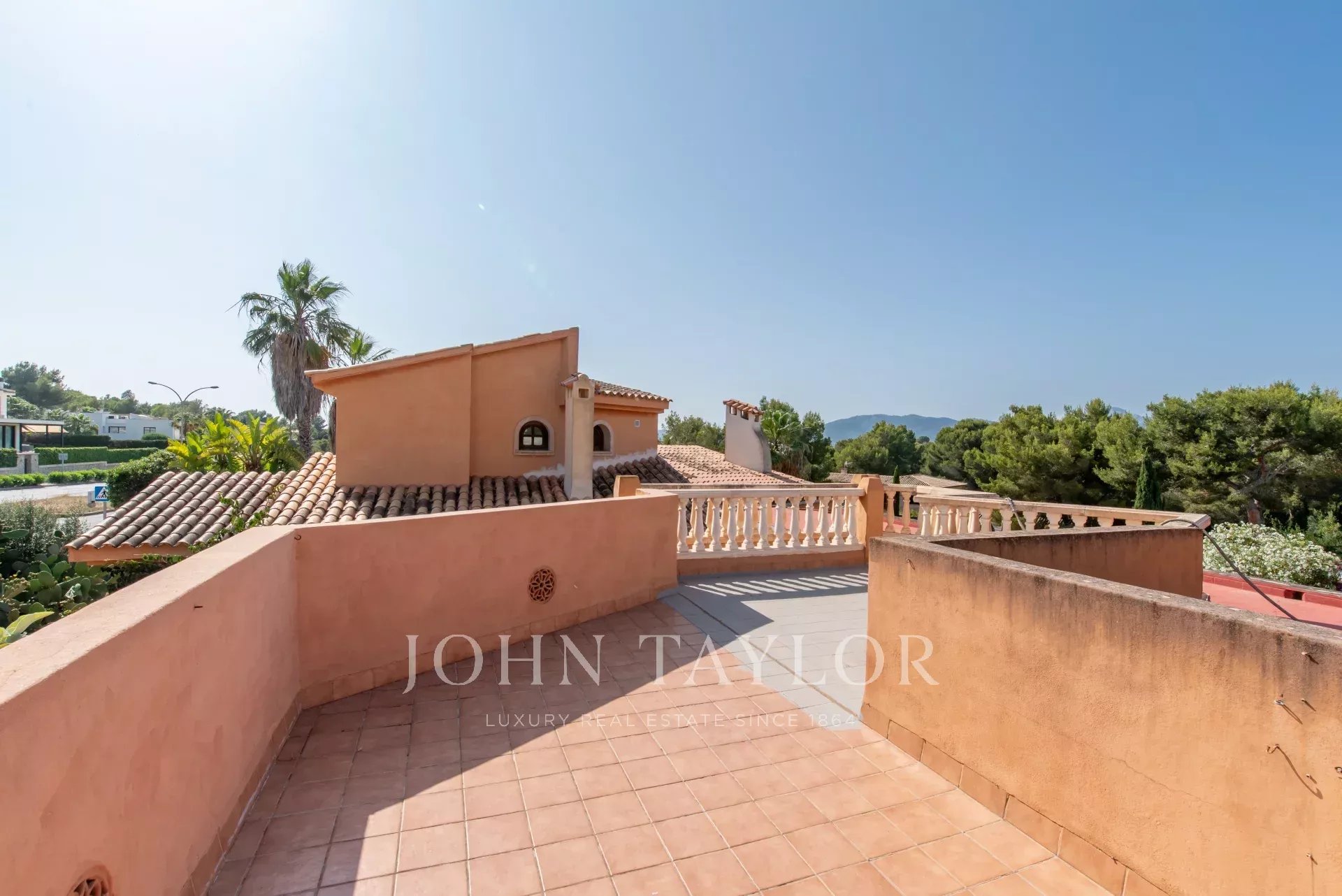 Entdecken Sie diese beeindruckende Villa von 416 m² in dem schönen Dorf Santa Ponsa mit Blick auf die Berge. Es befindet sich auf einem großen flachen Grundstück, perfekt, um den Garten zu genießen und ein sicherer Ort für Ihre Kinder zum Spielen.