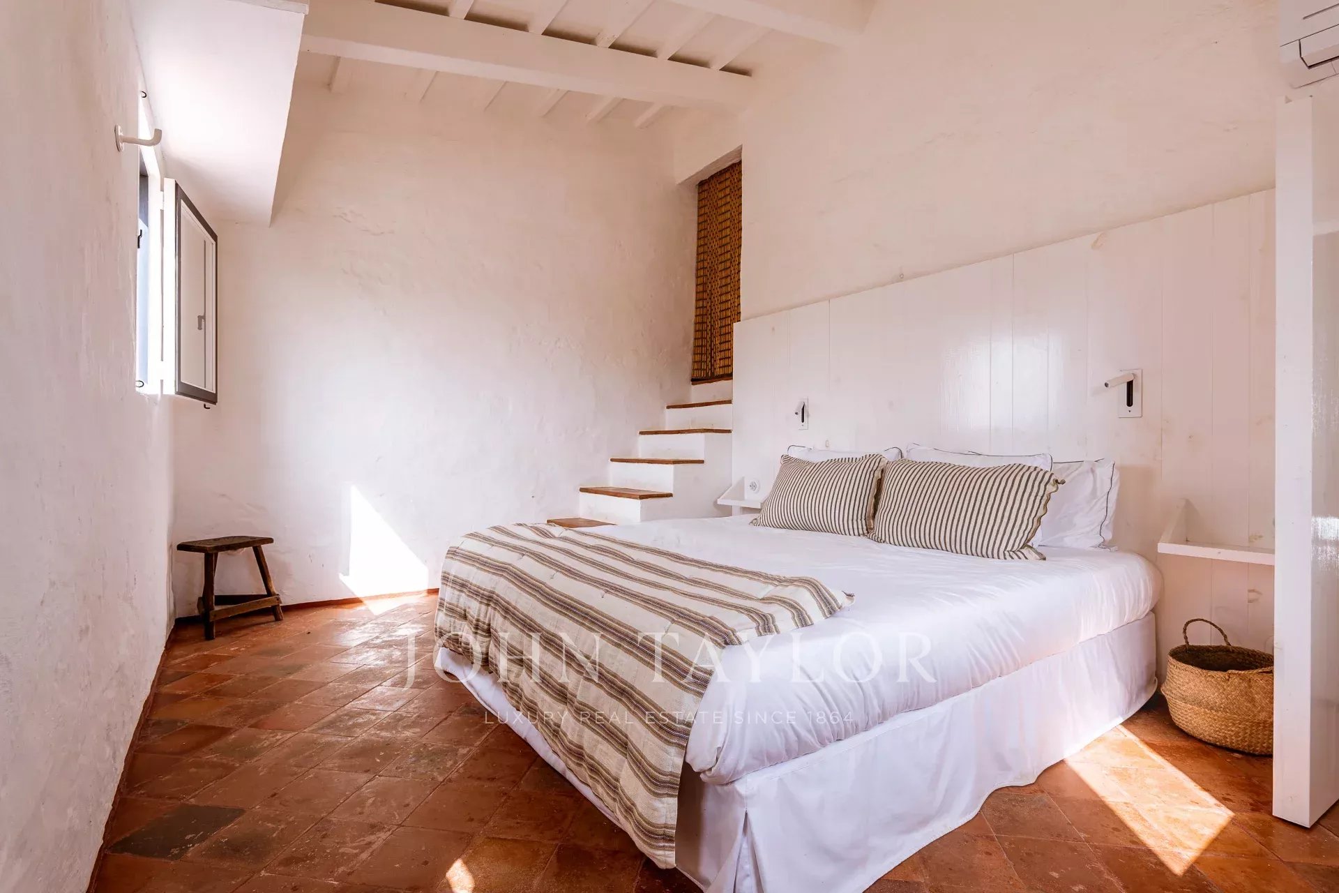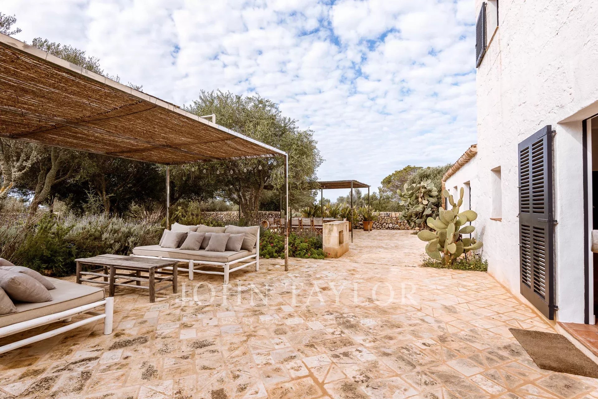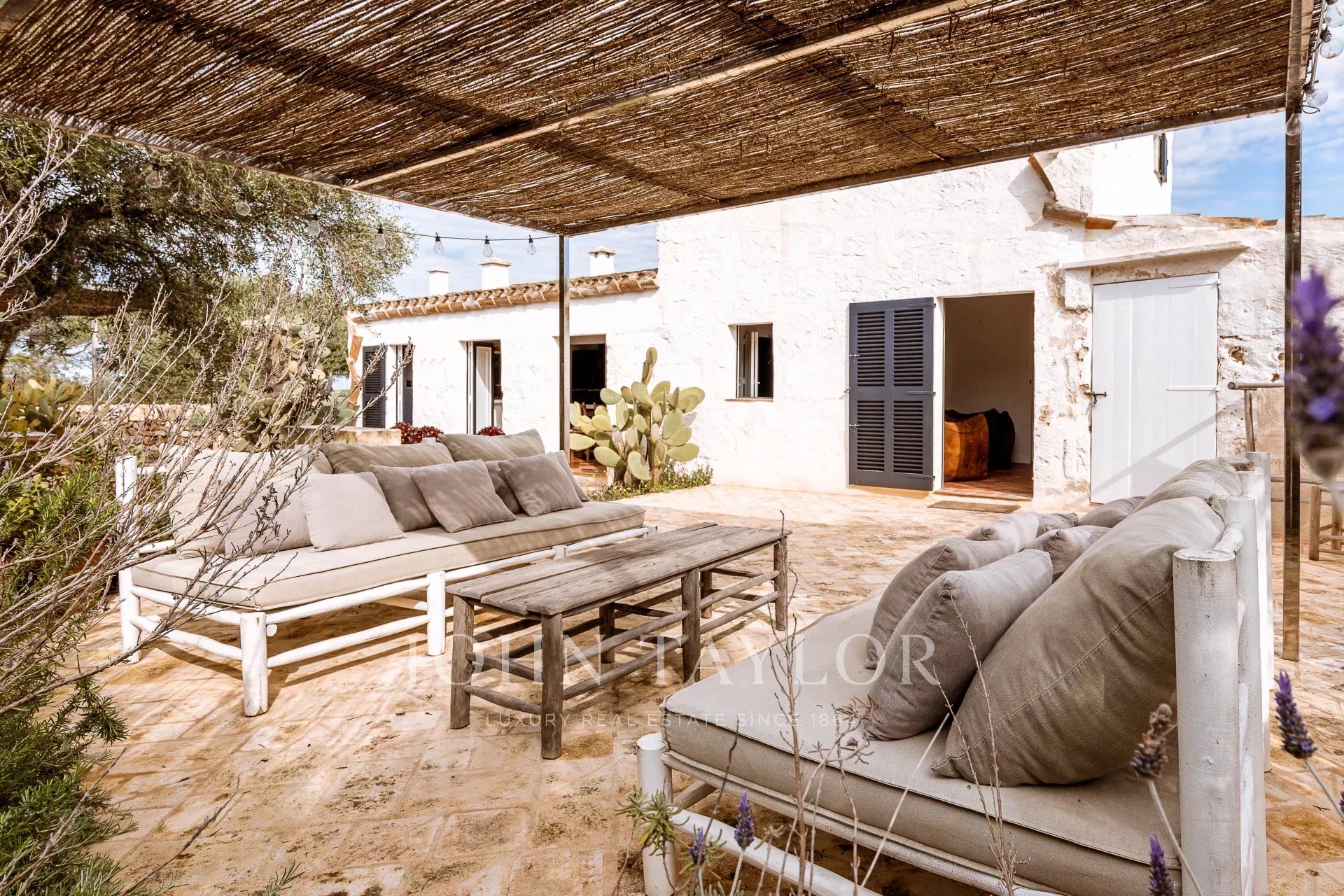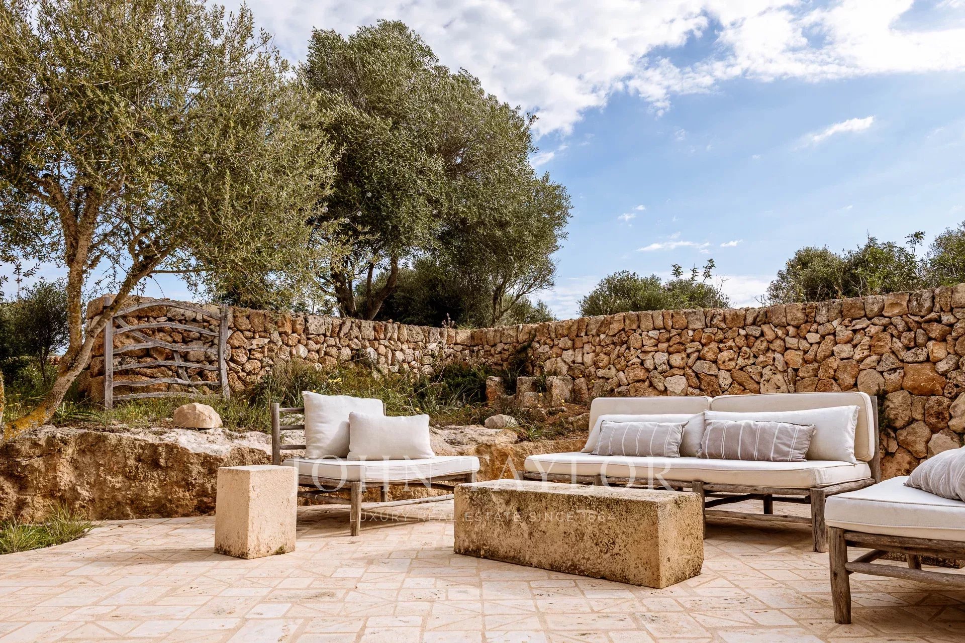Das Haupthaus, das mit viel Geschmack renoviert wurde, bewahrt die Essenz der traditionellen menorquinischen Architektur mit edlen Materialien und hochwertigen Oberflächen. Im Inneren befinden sich ein gemütliches Wohnzimmer mit Persönlichkeit, ein elegantes Esszimmer, eine charakteristische Küche, die mit dem Außenbereich verbunden ist, eine Gästetoilette, ein multifunktionales Büro (ideal als zusätzliches Schlafzimmer) und drei Doppelsuiten, alle mit eigenem Bad und einer natürlichen und anspruchsvollen Ästhetik.