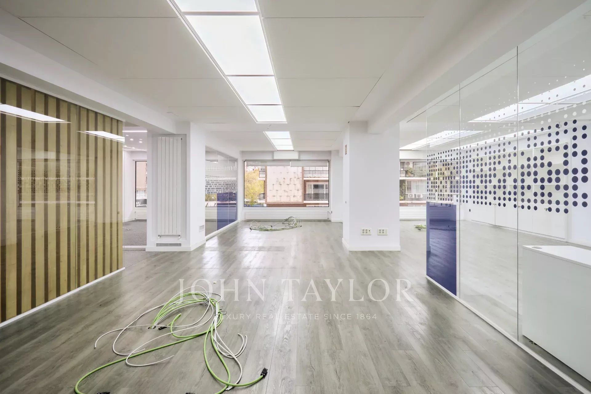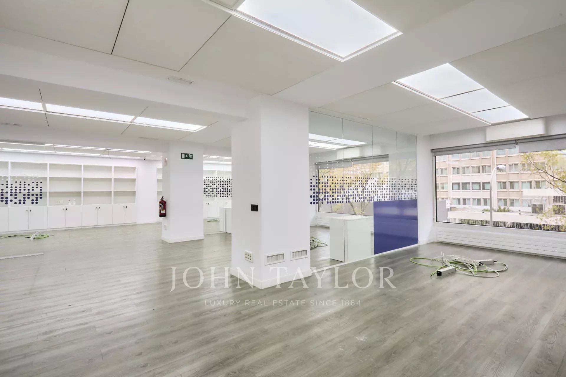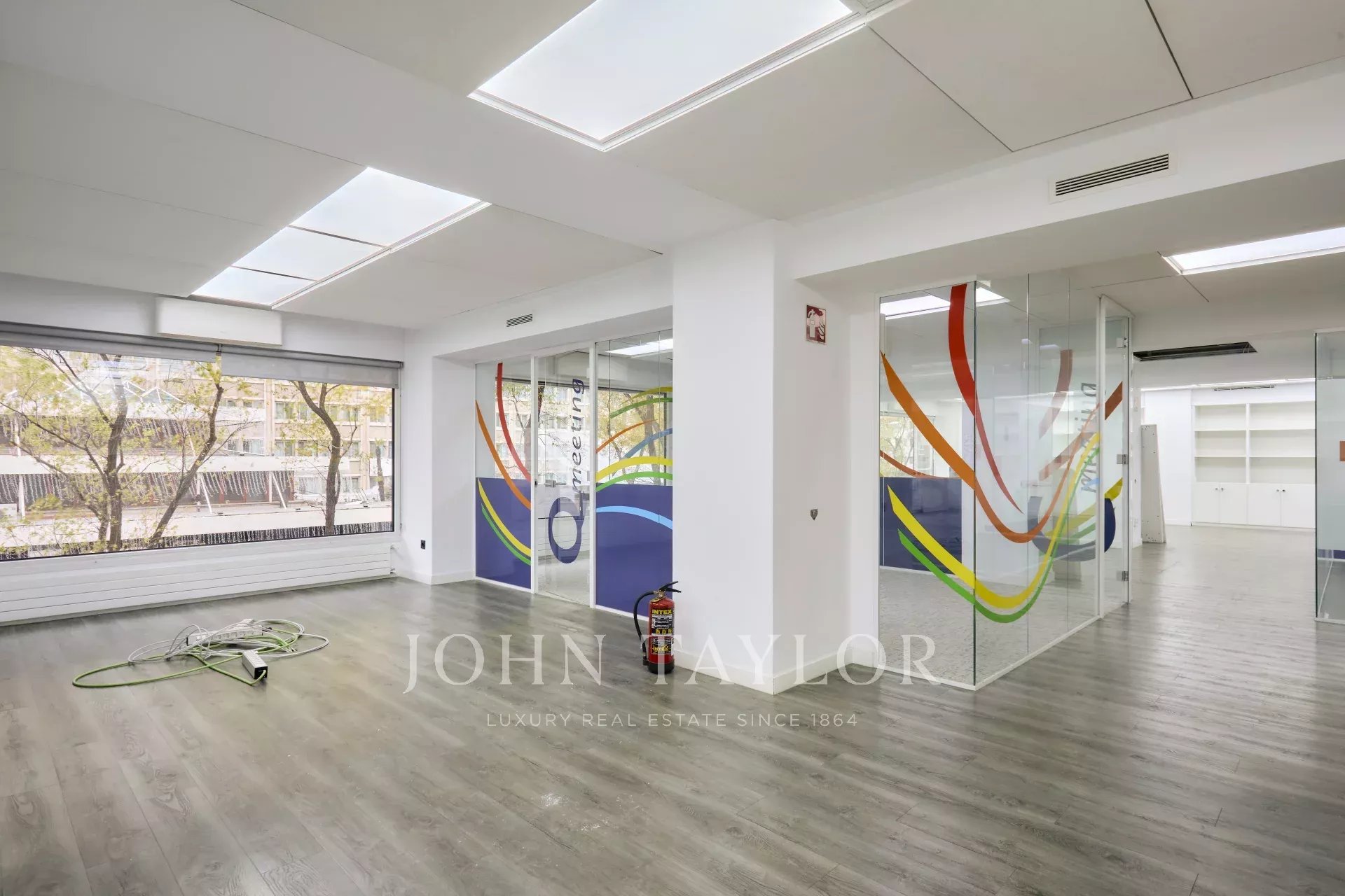 Es befindet sich in einem ausgezeichneten Erhaltungszustand und verfügt über eine technische Decke, Holzfußböden, Fußbodenheizung und eine im gesamten Büro verteilte Split-Klimaanlage, ein Luftreinigungs- und Renovierungssystem sowie eine zentrale Heizkörperheizung.
