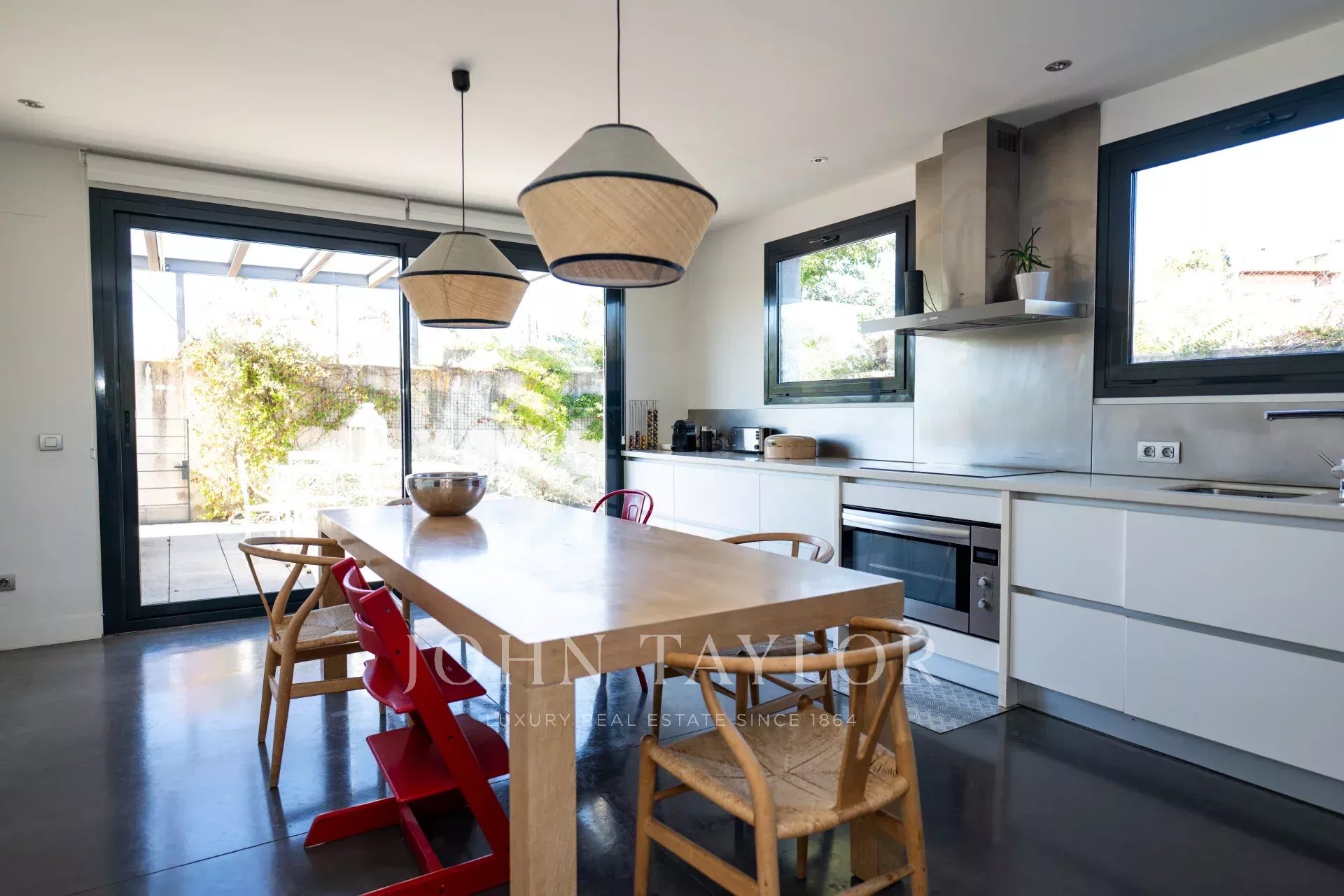 Auf einem Grundstück von 1000m2 und mit einem modernen Design, empfängt uns die Immobilie mit einer charmanten Eingangshalle, die Zugang zu einer riesigen und perfekt ausgestatteten Küche mit einem zentralen Insel-Esstisch gibt.