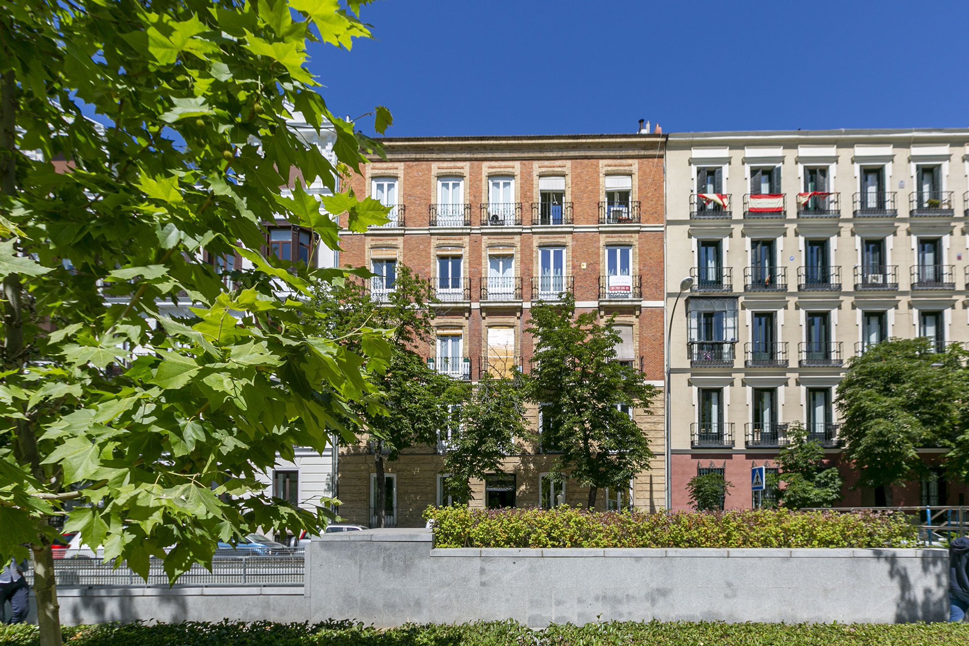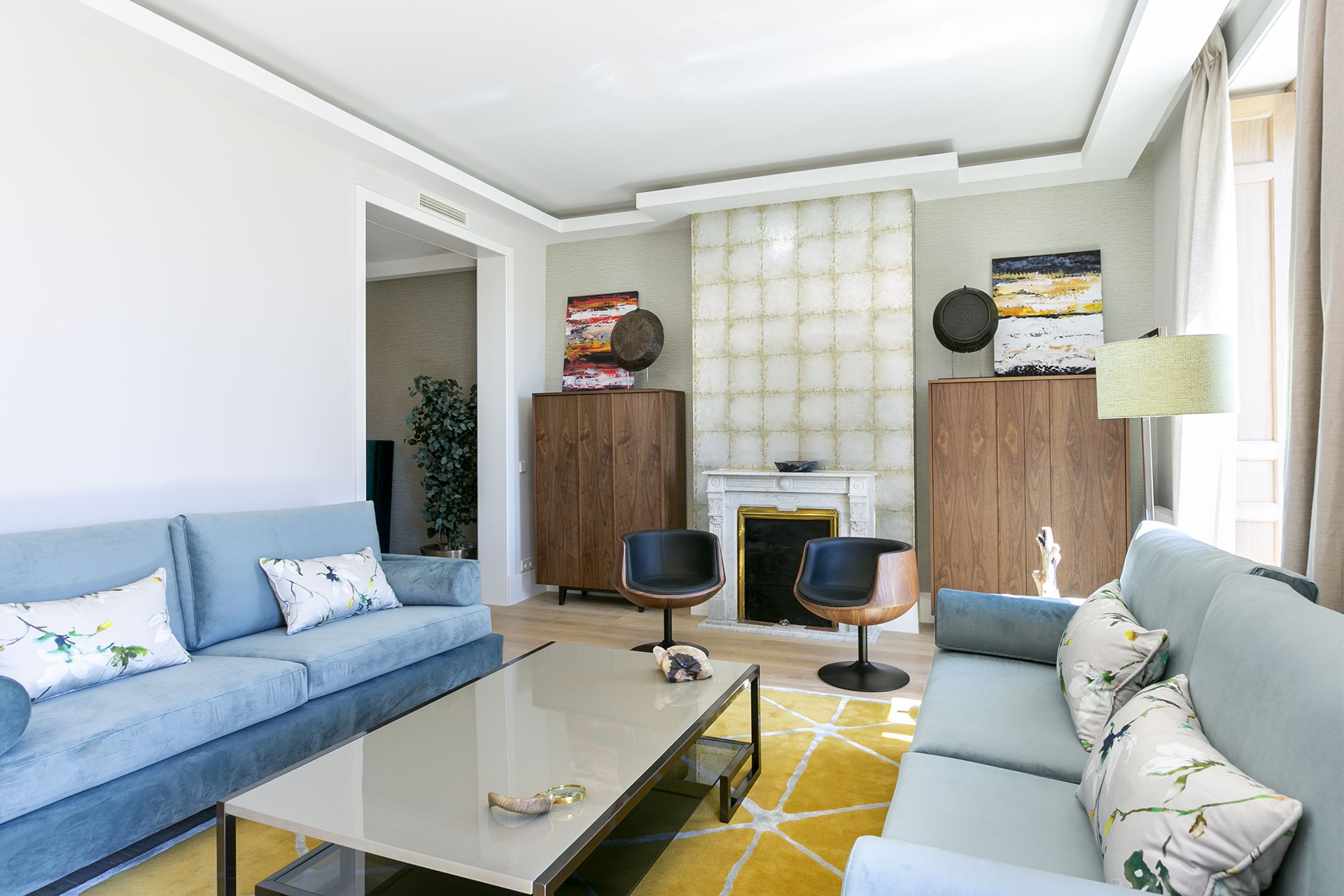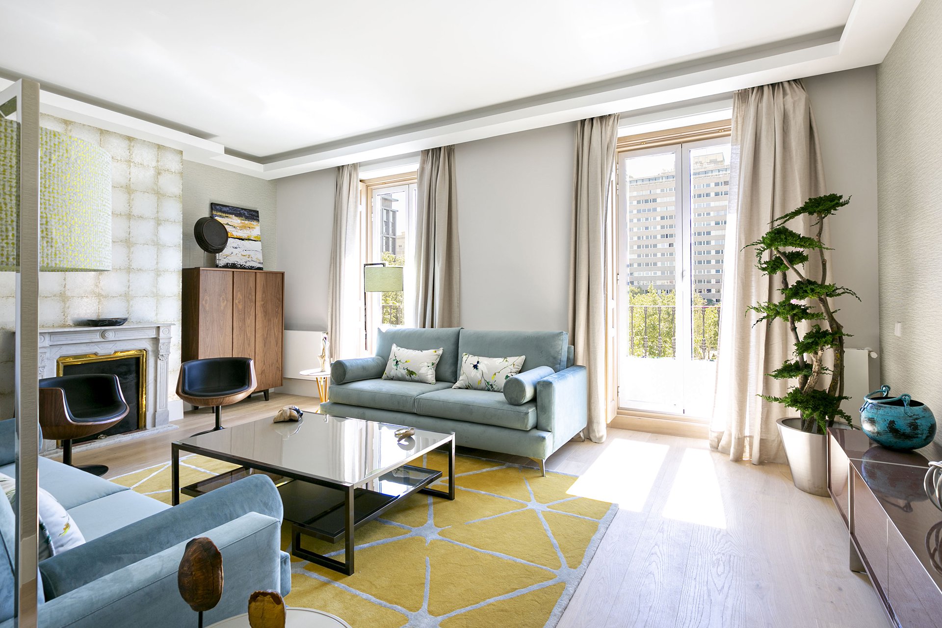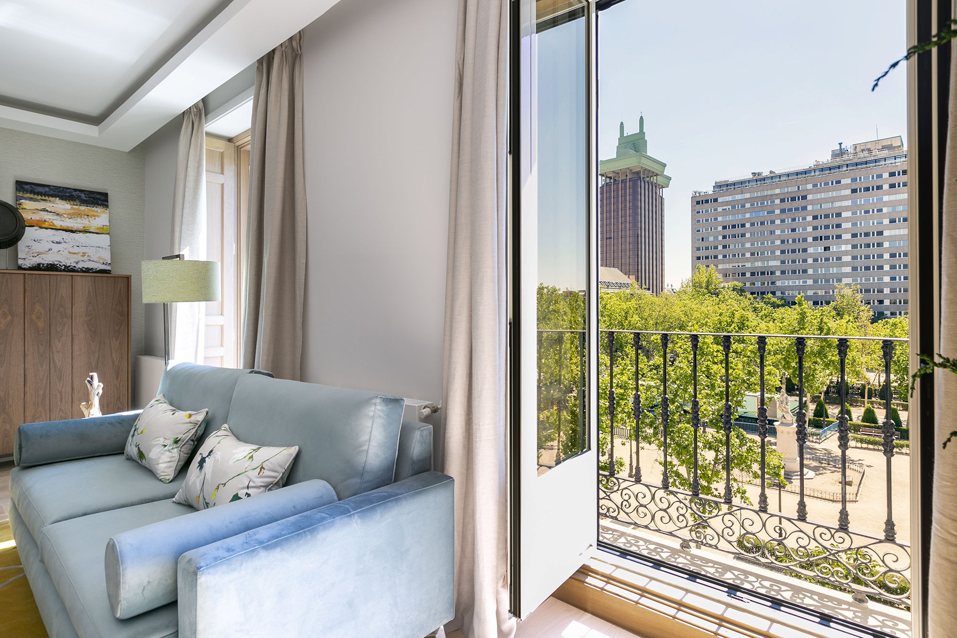 Das große Wohnzimmer hat zwei nach Osten ausgerichtete Balkone mit Blick auf die Plaza de la Villa de Paris.