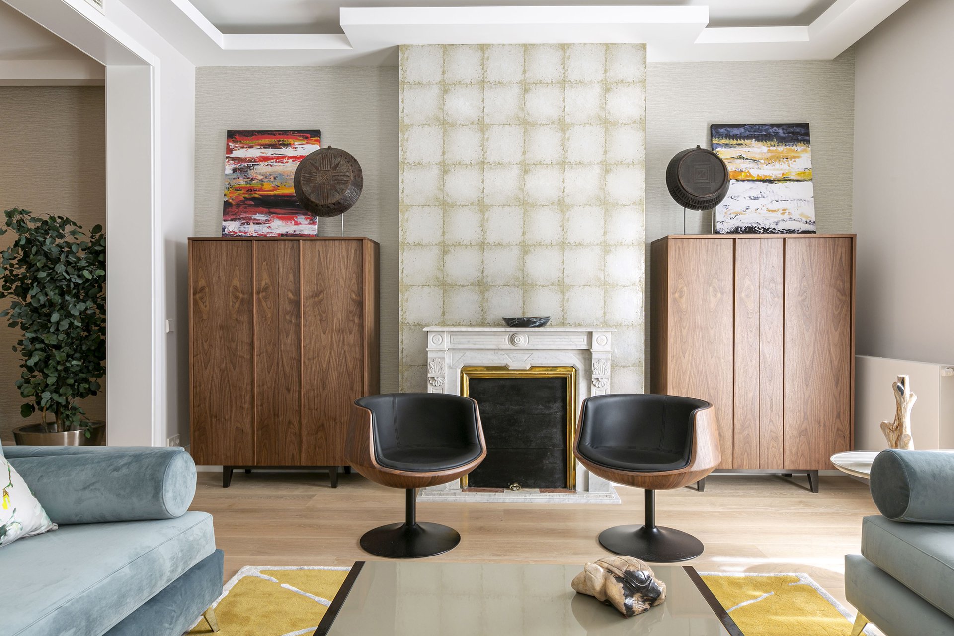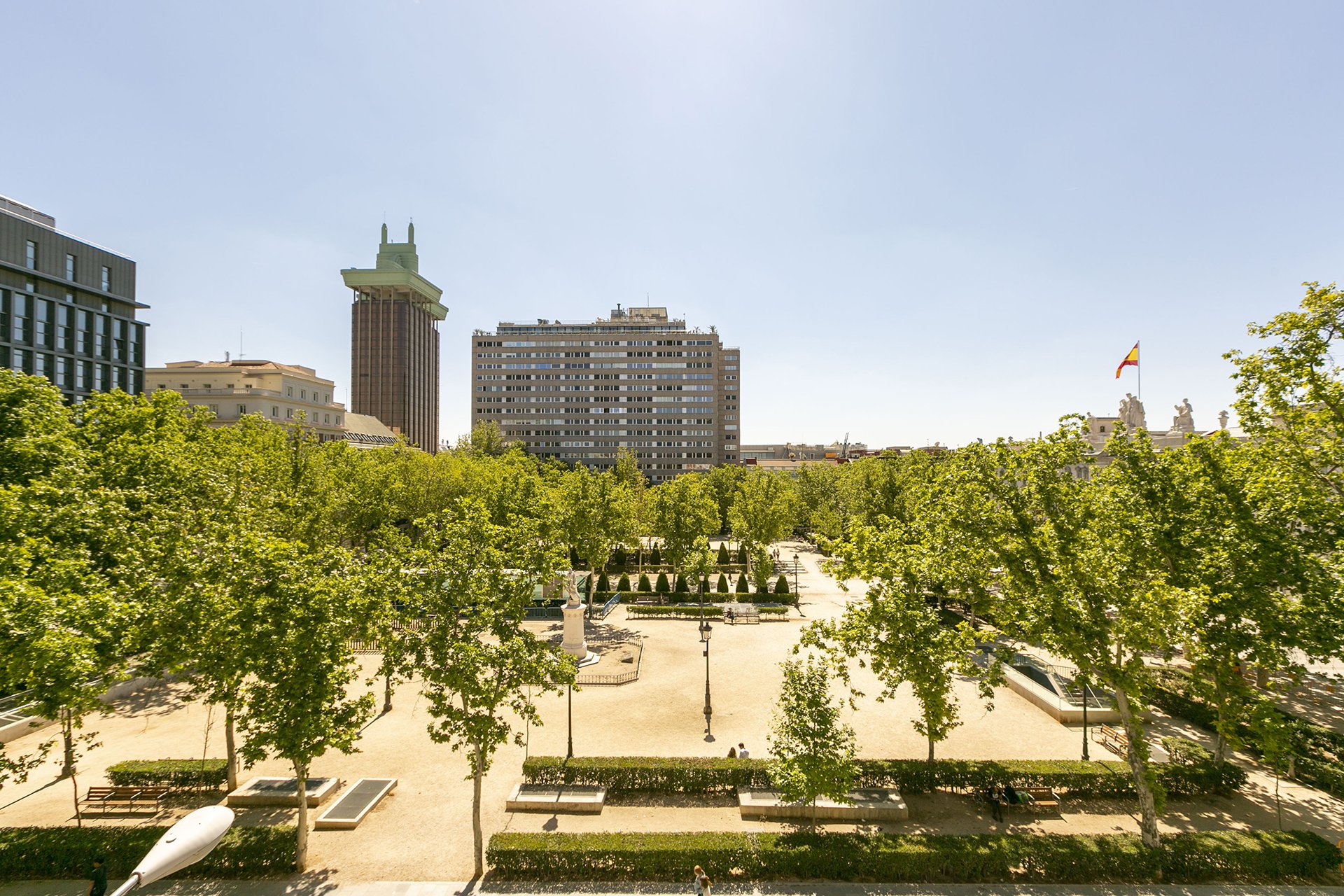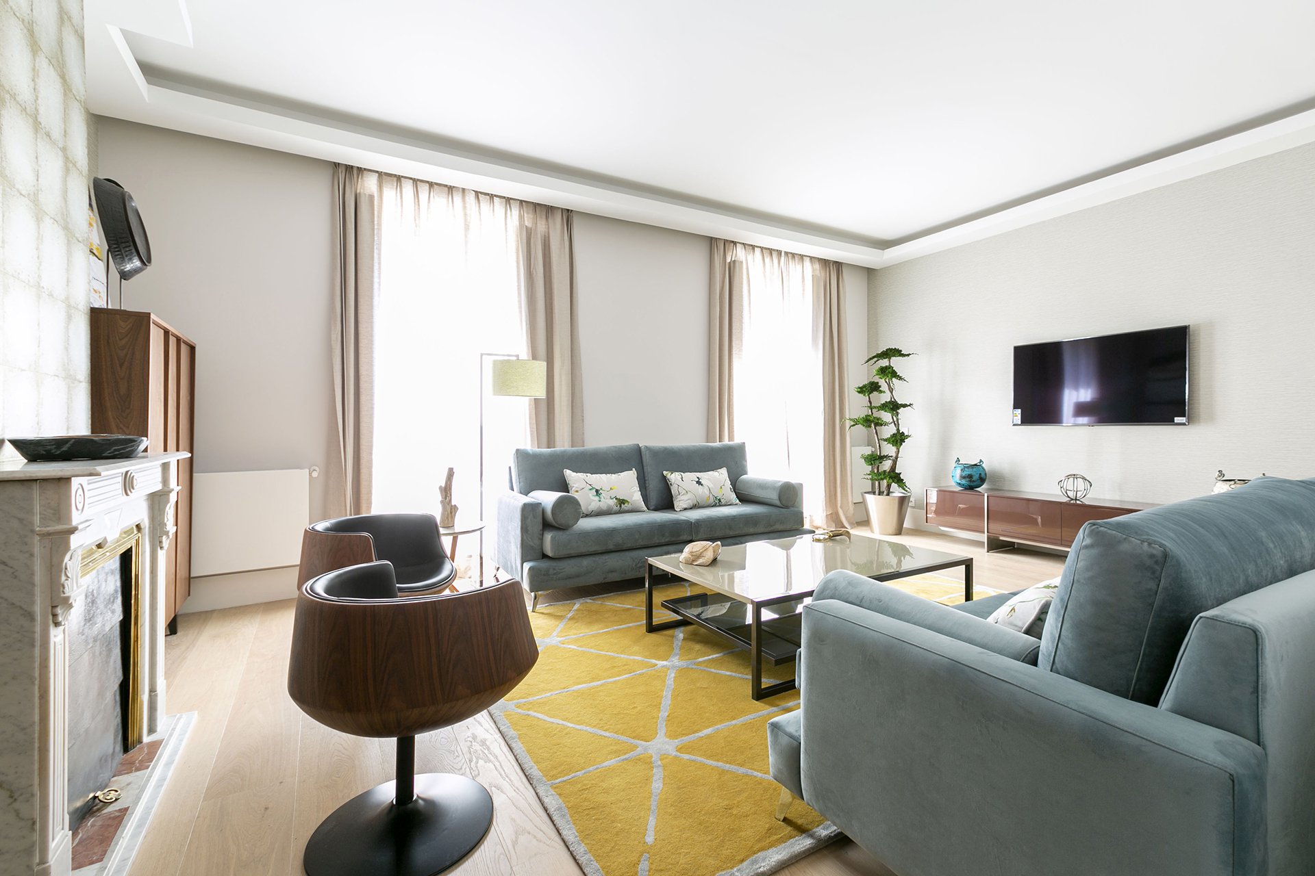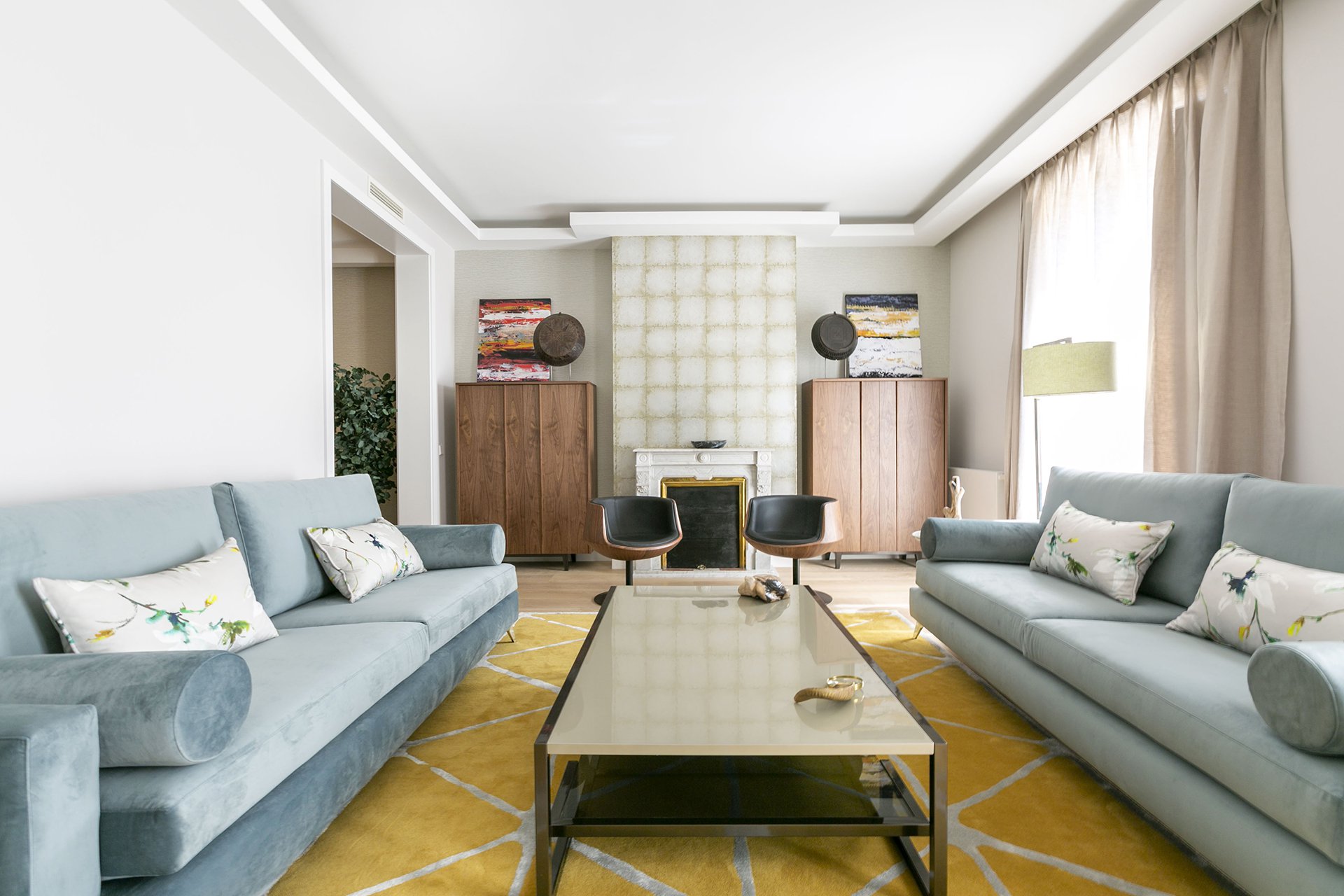 Das große Wohnzimmer hat zwei nach Osten ausgerichtete Balkone mit Blick auf die Plaza de la Villa de Paris.