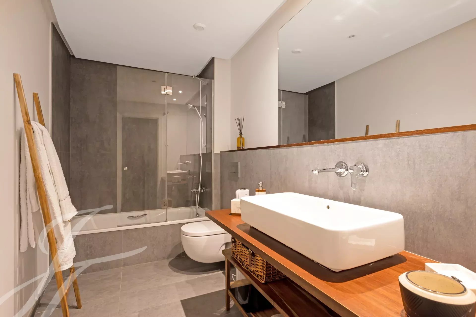 Sie besteht aus einem Wohn-Esszimmer und einer offenen Küche, die sich mit großen Fenstern zur Terrasse hin öffnet. Es hat zwei geräumige Schlafzimmer mit en-suite Badezimmern.