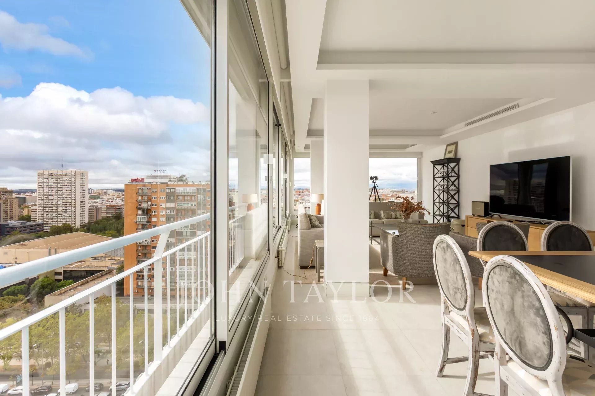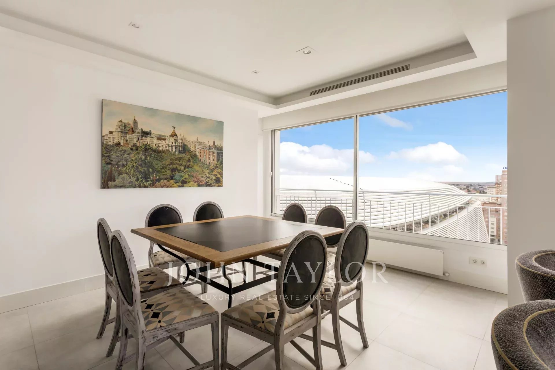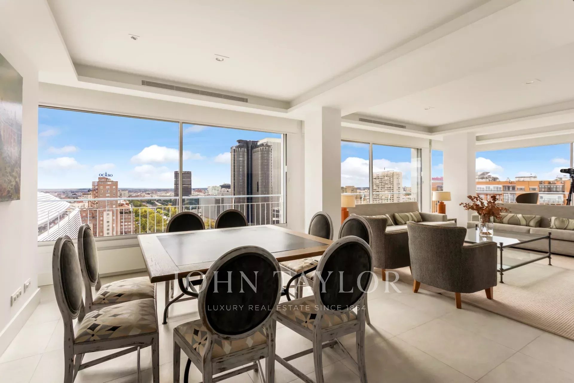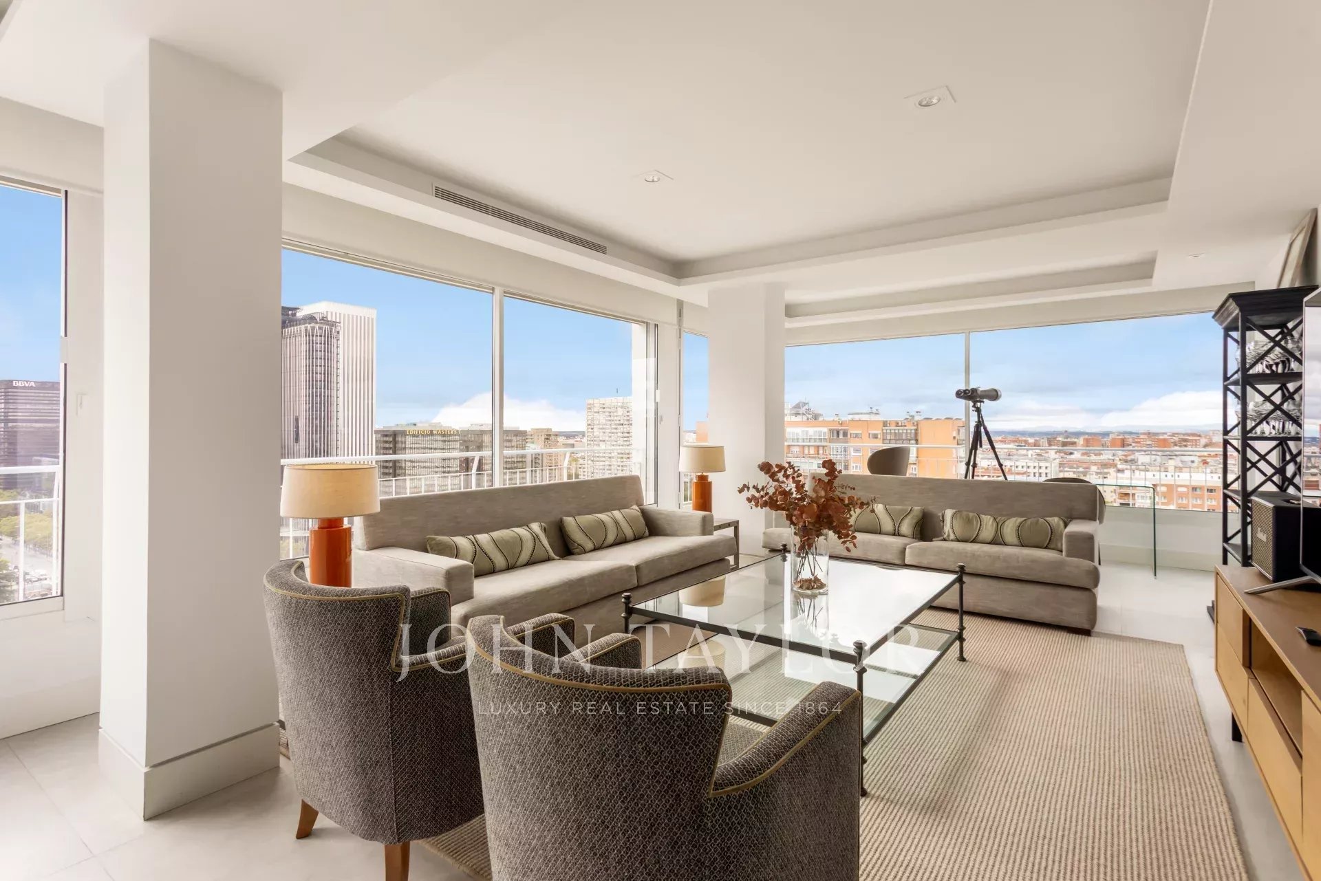 John Taylor bietet diese prächtige möblierte Wohnung mit herrlichem Blick über Madrid und mit einer überbordenden Helligkeit, die durch die Höhe von 14 Etagen gewährleistet wird, zur Miete an.