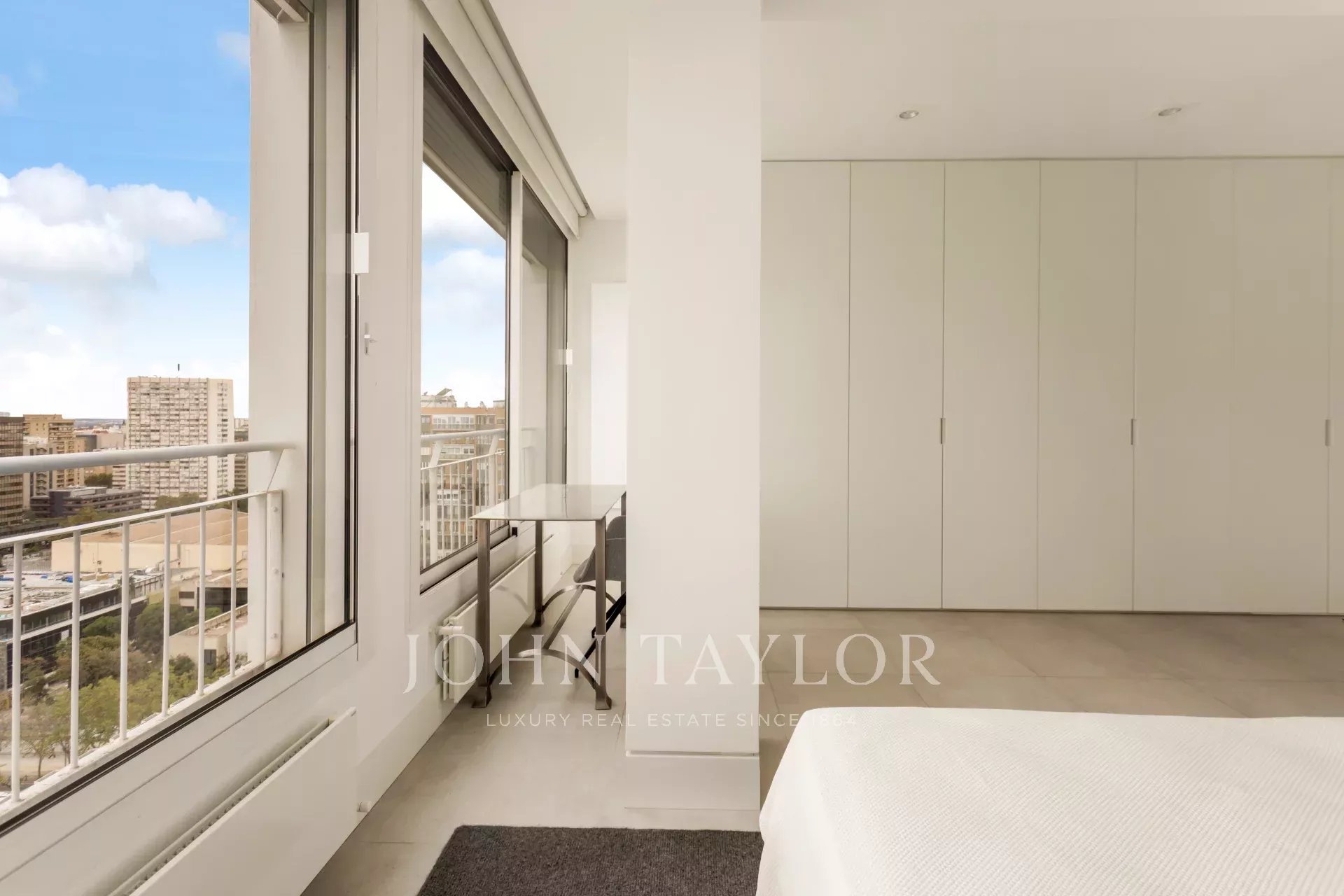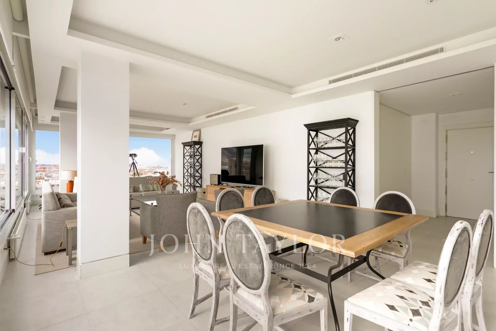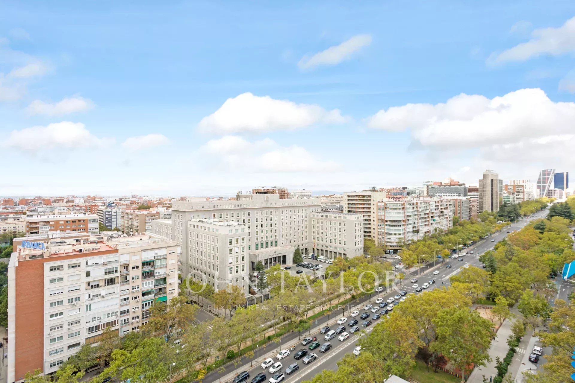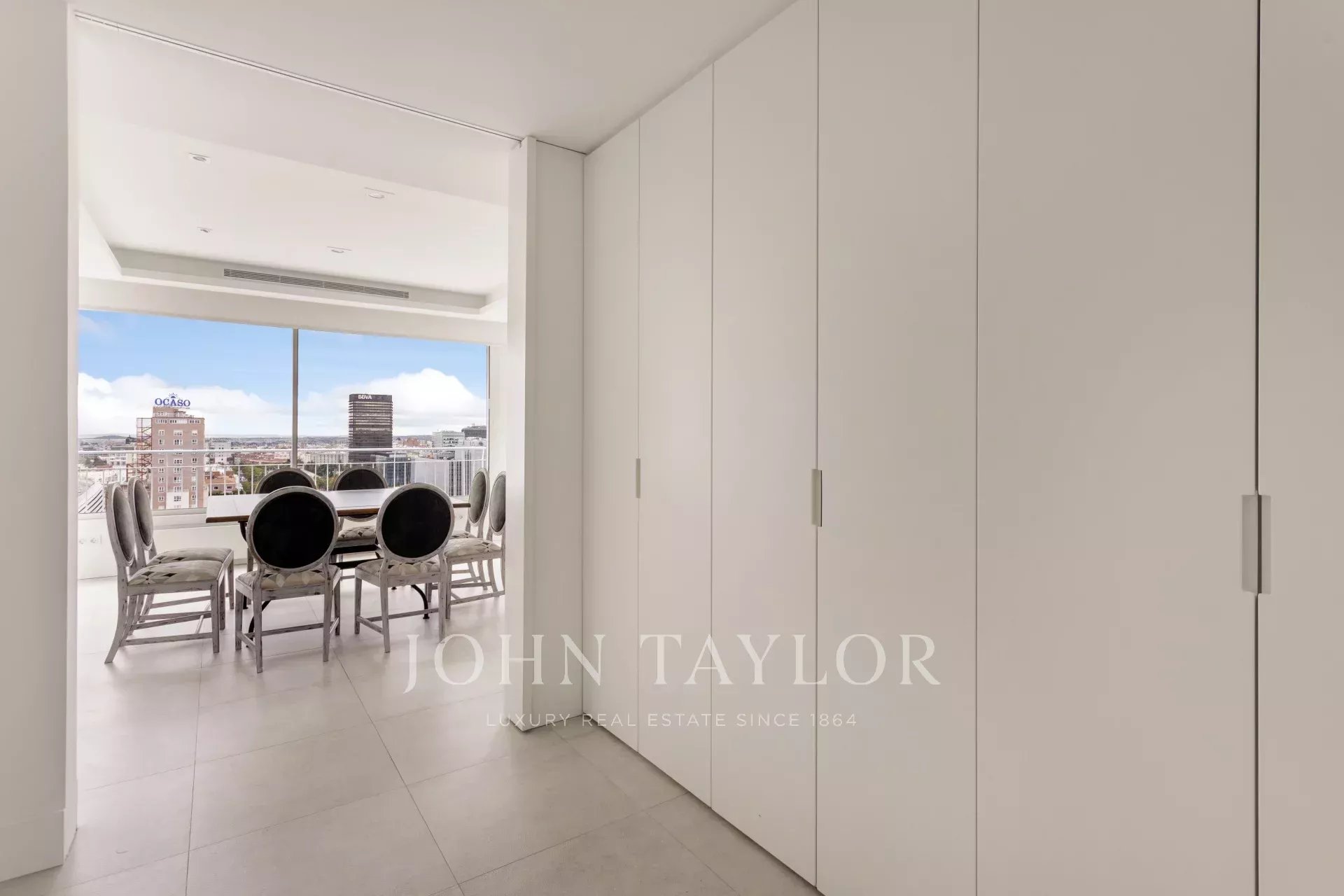 John Taylor bietet diese prächtige möblierte Wohnung mit herrlichem Blick über Madrid und mit einer überbordenden Helligkeit, die durch die Höhe von 14 Etagen gewährleistet wird, zur Miete an.