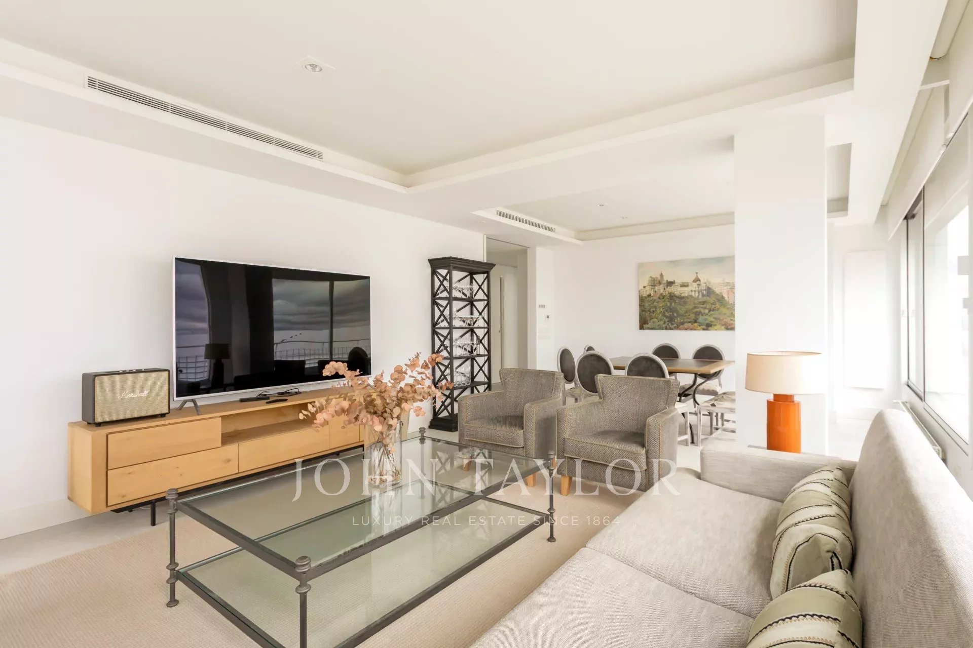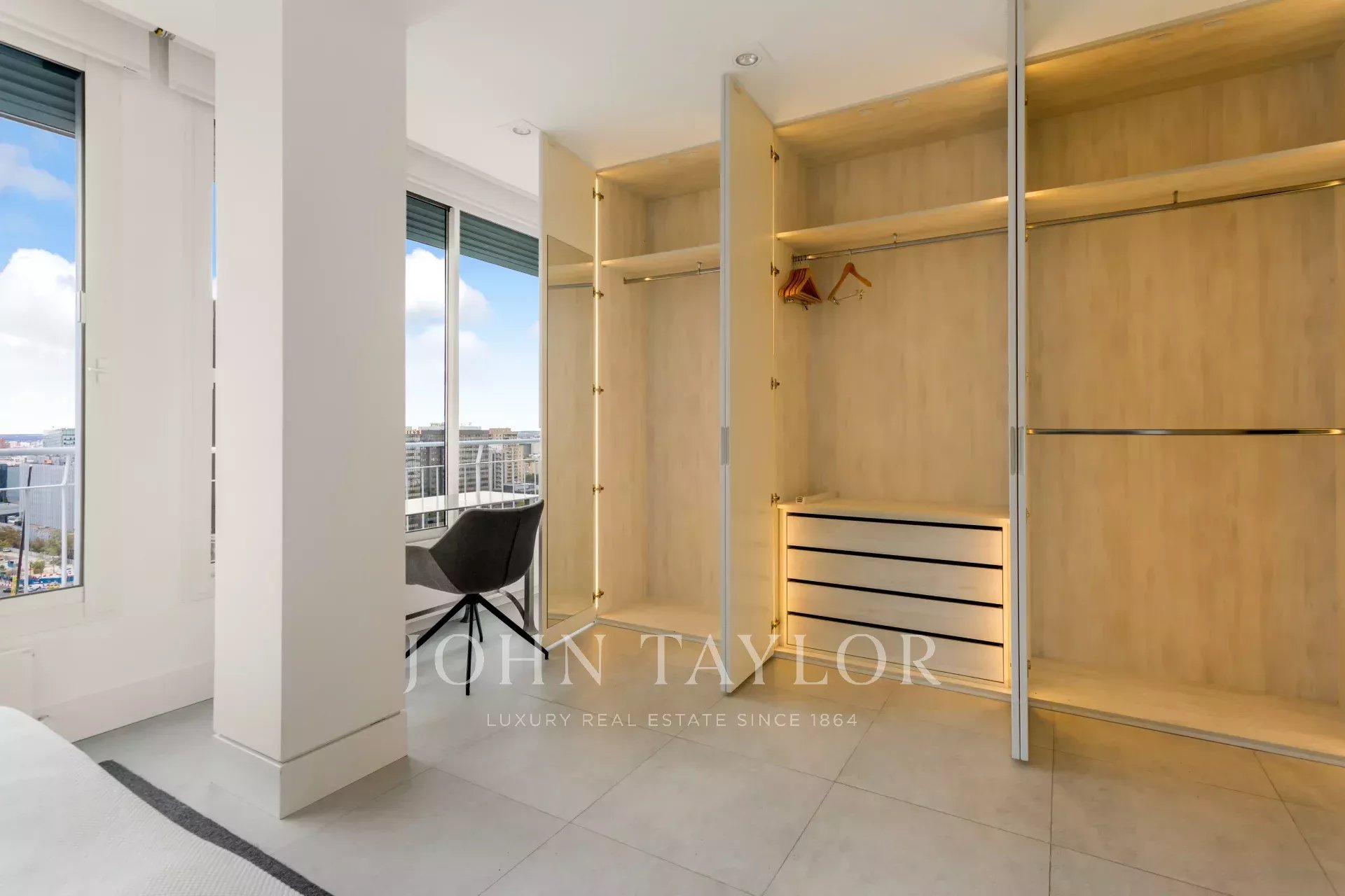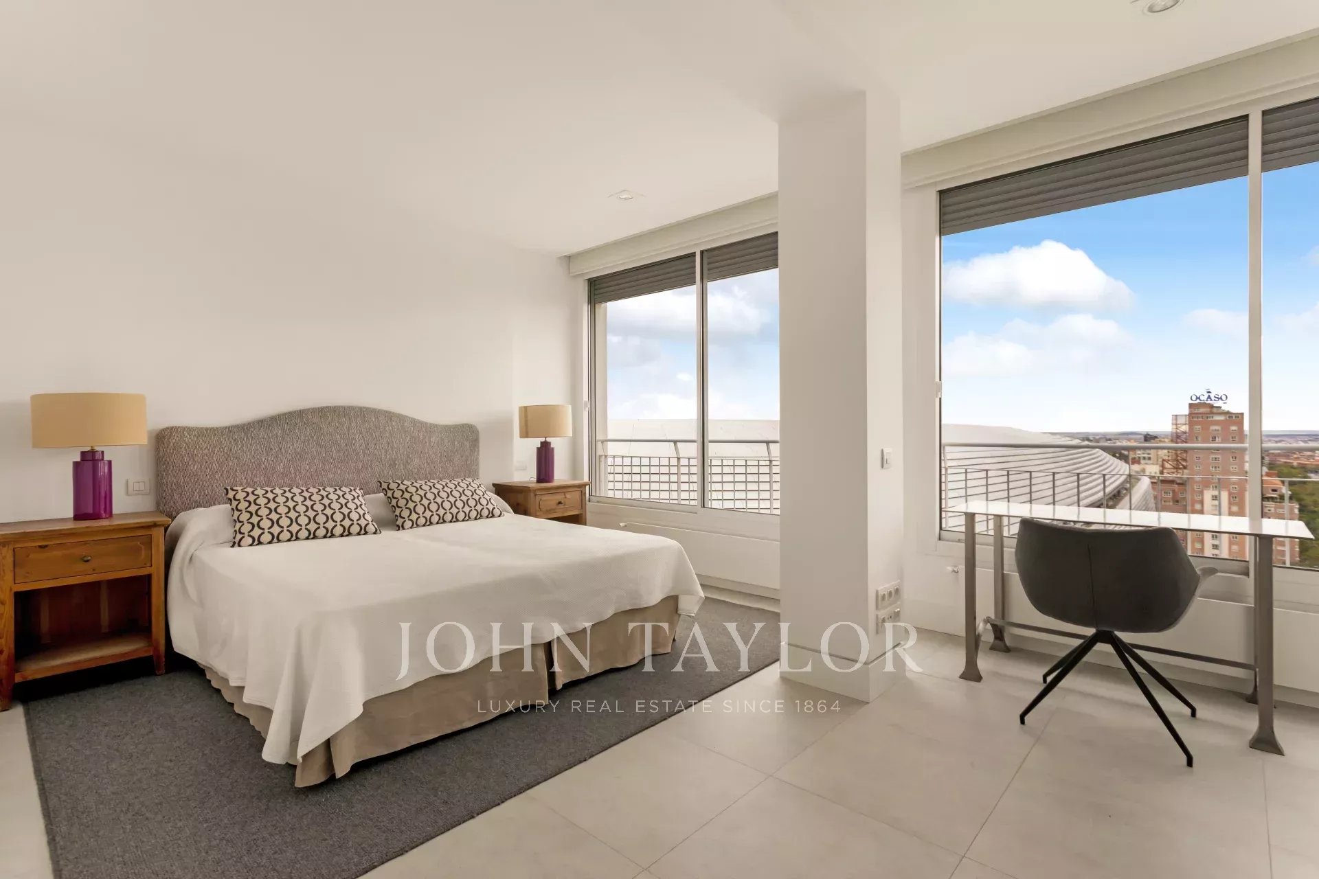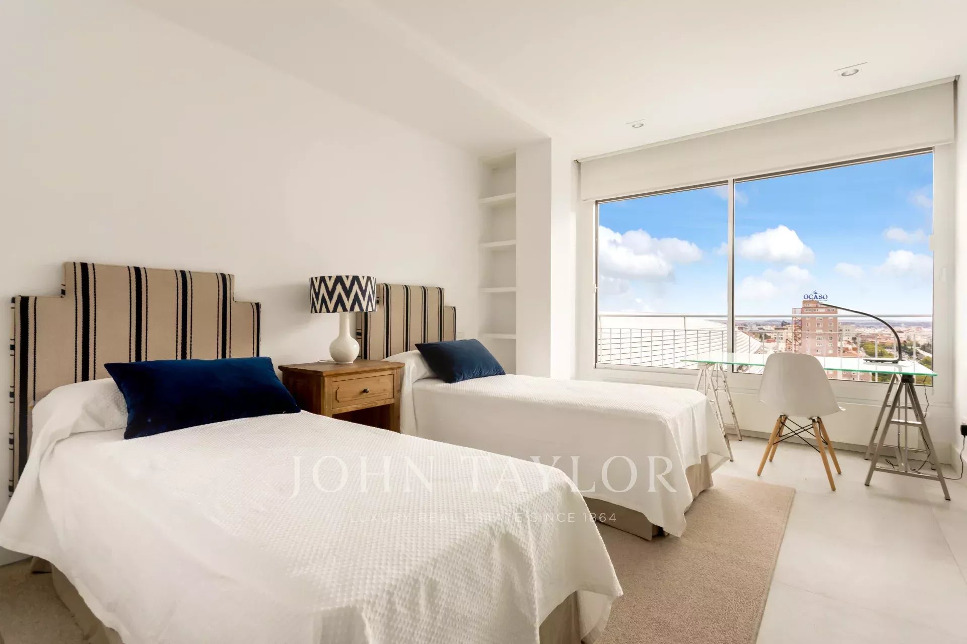 John Taylor bietet diese prächtige möblierte Wohnung mit herrlichem Blick über Madrid und mit einer überbordenden Helligkeit, die durch die Höhe von 14 Etagen gewährleistet wird, zur Miete an.