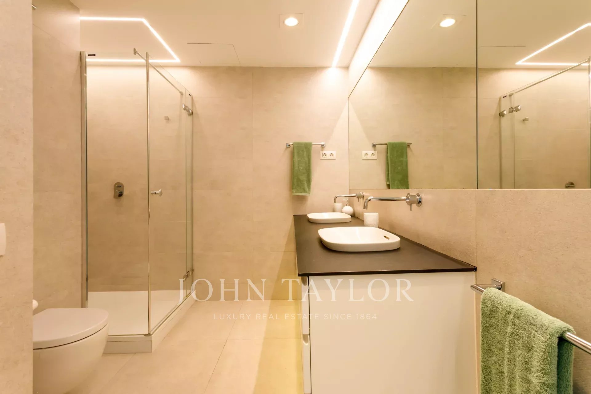 Die Wohnung ist bezugsfertig, möbliert und mit allen Details und Qualitäten ausgestattet, wie z.B. Klimaanlage mit Thermostat in jedem Zimmer, Bewegungsmelder in den Badezimmern, einstellbare indirekte Beleuchtung, elektrische Jalousien und Rollos in allen Fenstern, beschlagfreie Spiegel in den Badezimmern, Natursteinboden, PVC-Fenster mit hervorragender Wärme- und Schalldämmung, viele Einbauschränke mit Innenbeleuchtung, Soundsystem und TV, Heizsystem zur Unterstützung der Zentralheizung des Gebäudes, etc...