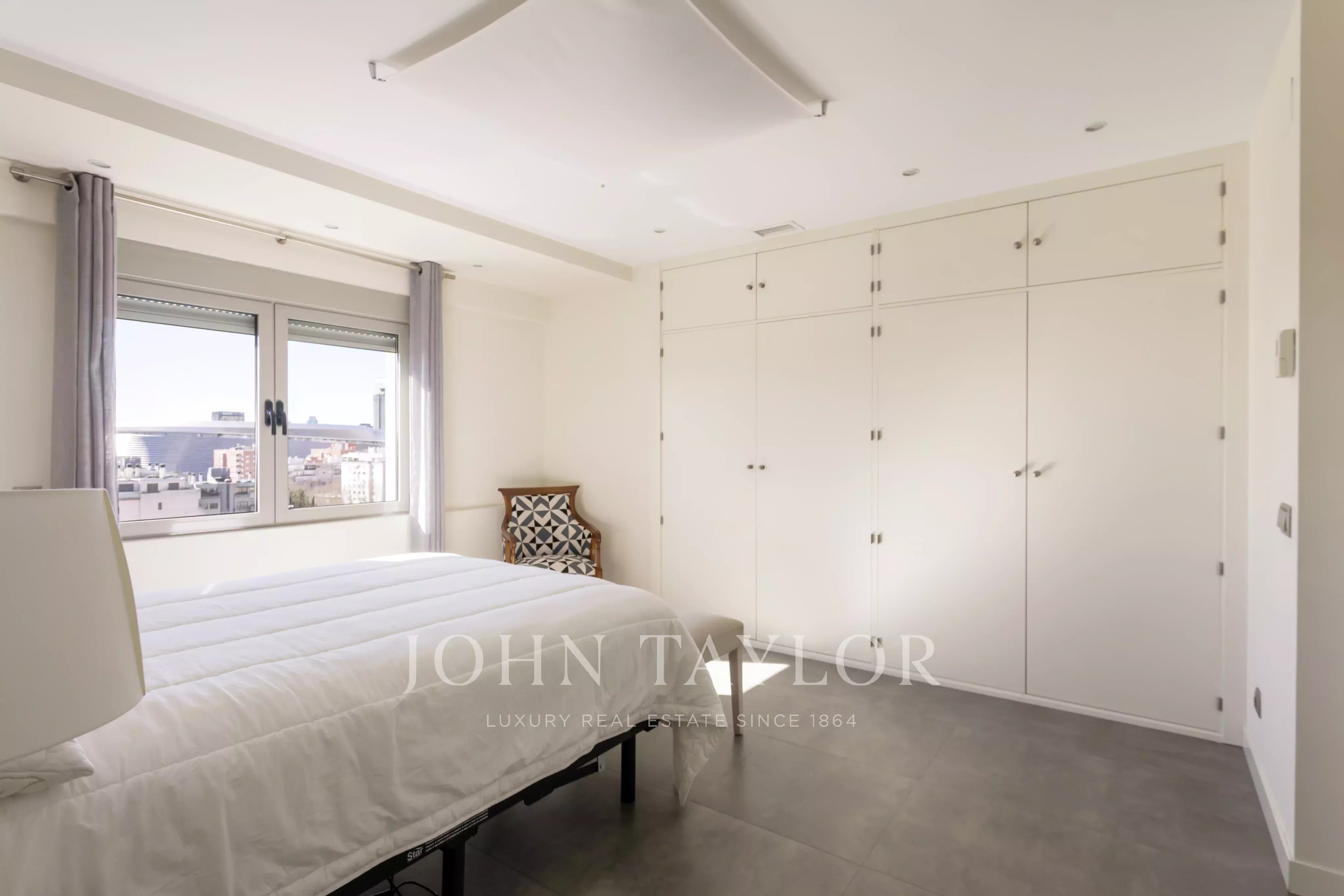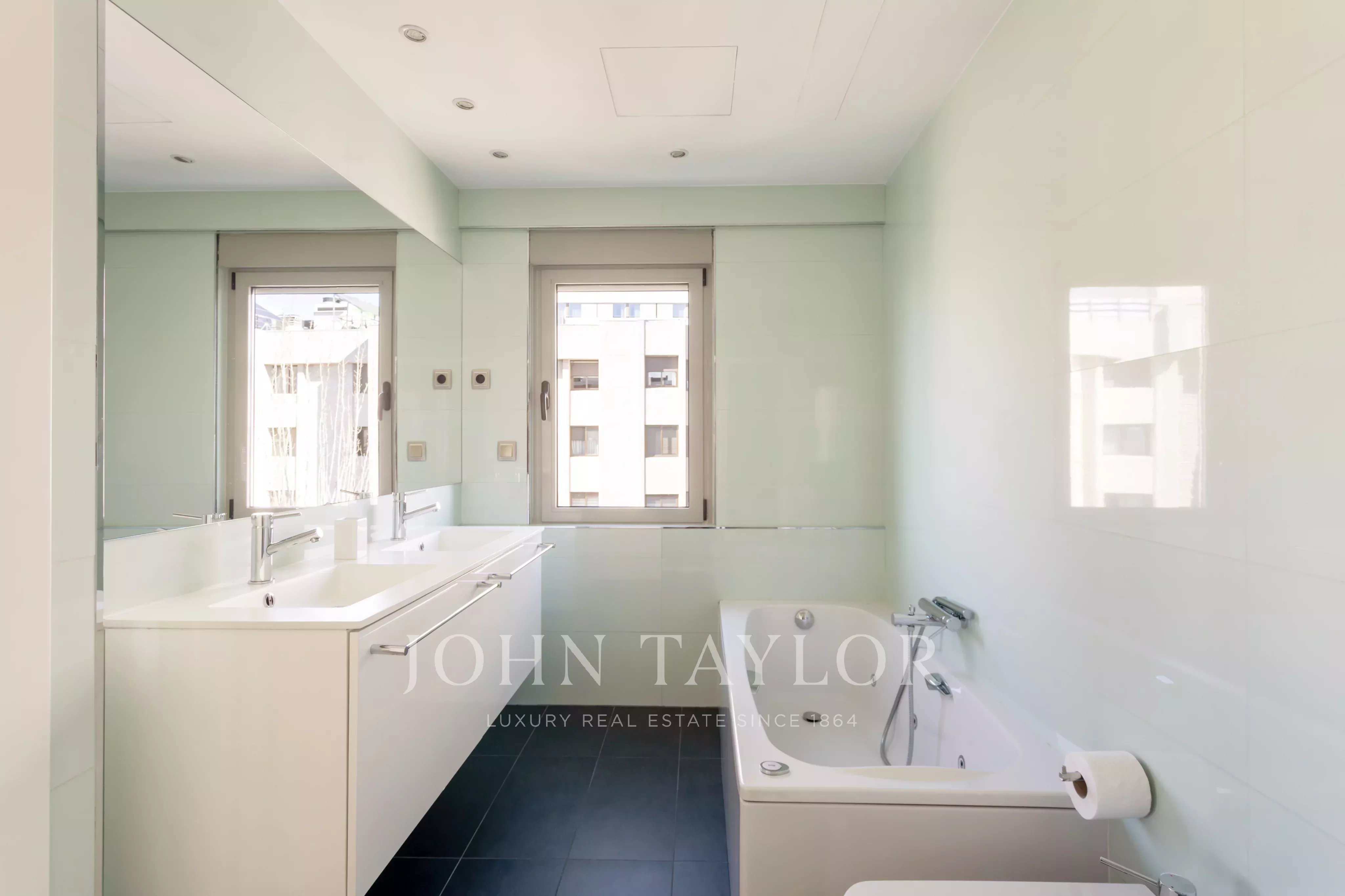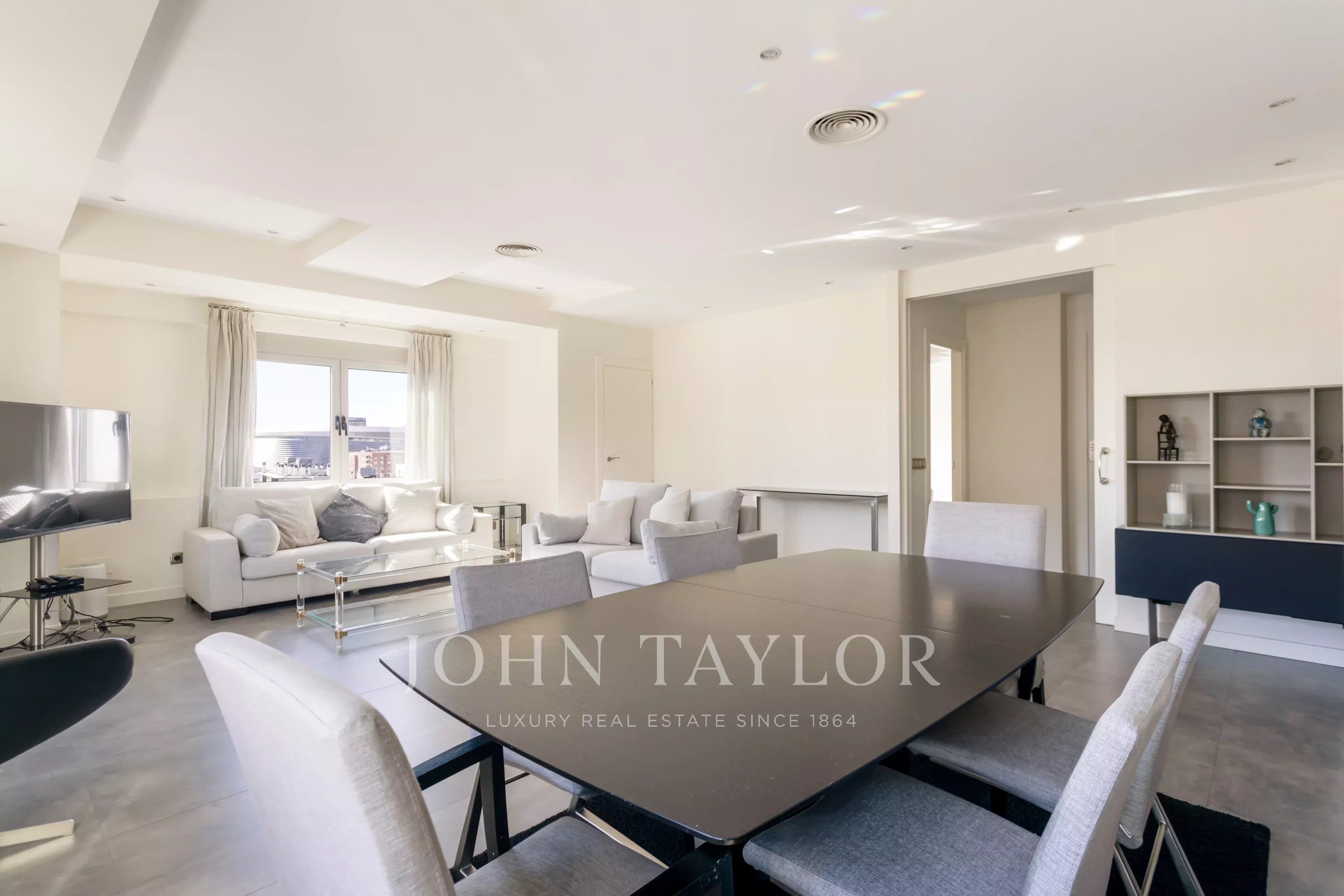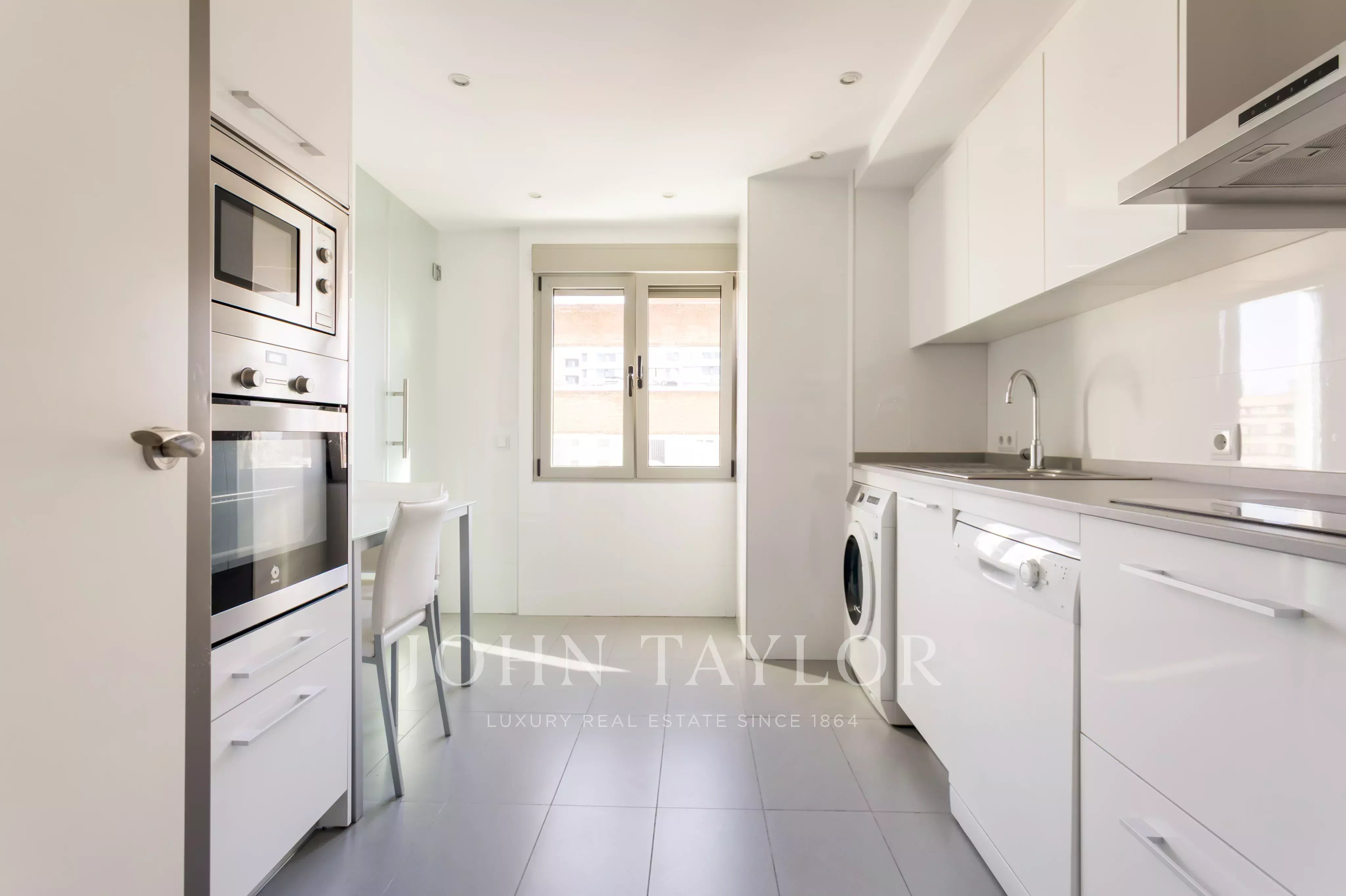 Mit einer ungefähren Wohnfläche von 120m² plus 60m² Terrasse, verteilt auf der 6. Etage in 3 Schlafzimmer und 3 Bäder, zwei davon en-suite, ein wunderbares Wohnzimmer von 42m² und unabhängige Einbauküche.